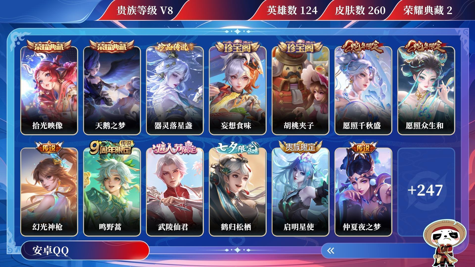 [9934961]贵族V8 荣耀典藏2 珍品传说1 传说皮肤20 史诗皮肤66 皮肤数量260 皮肤价值:212700 英雄124 至尊星耀V