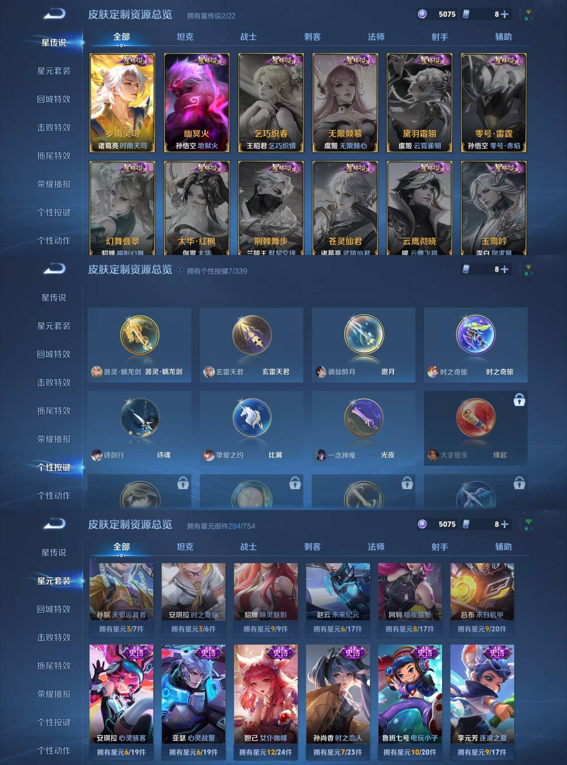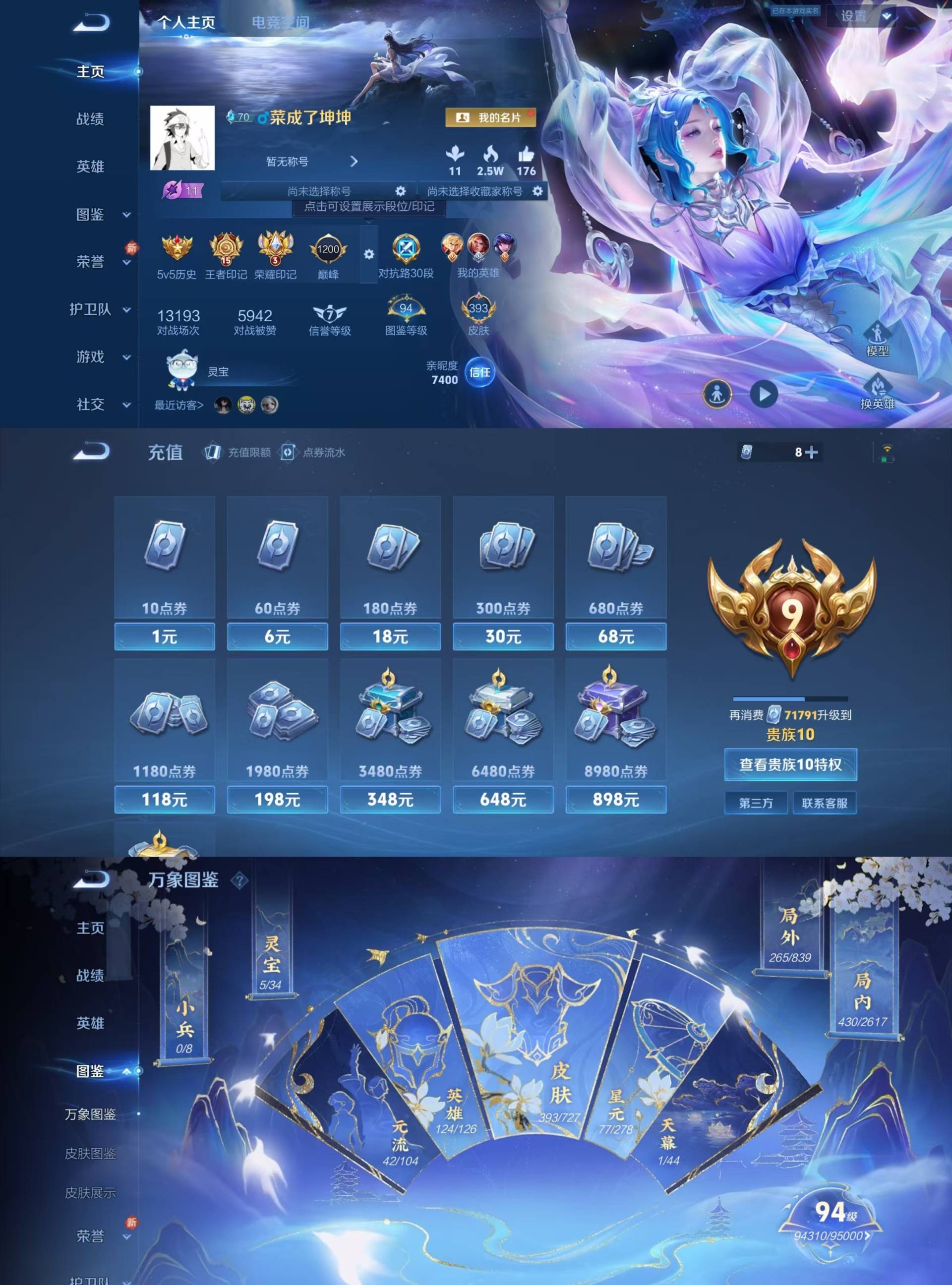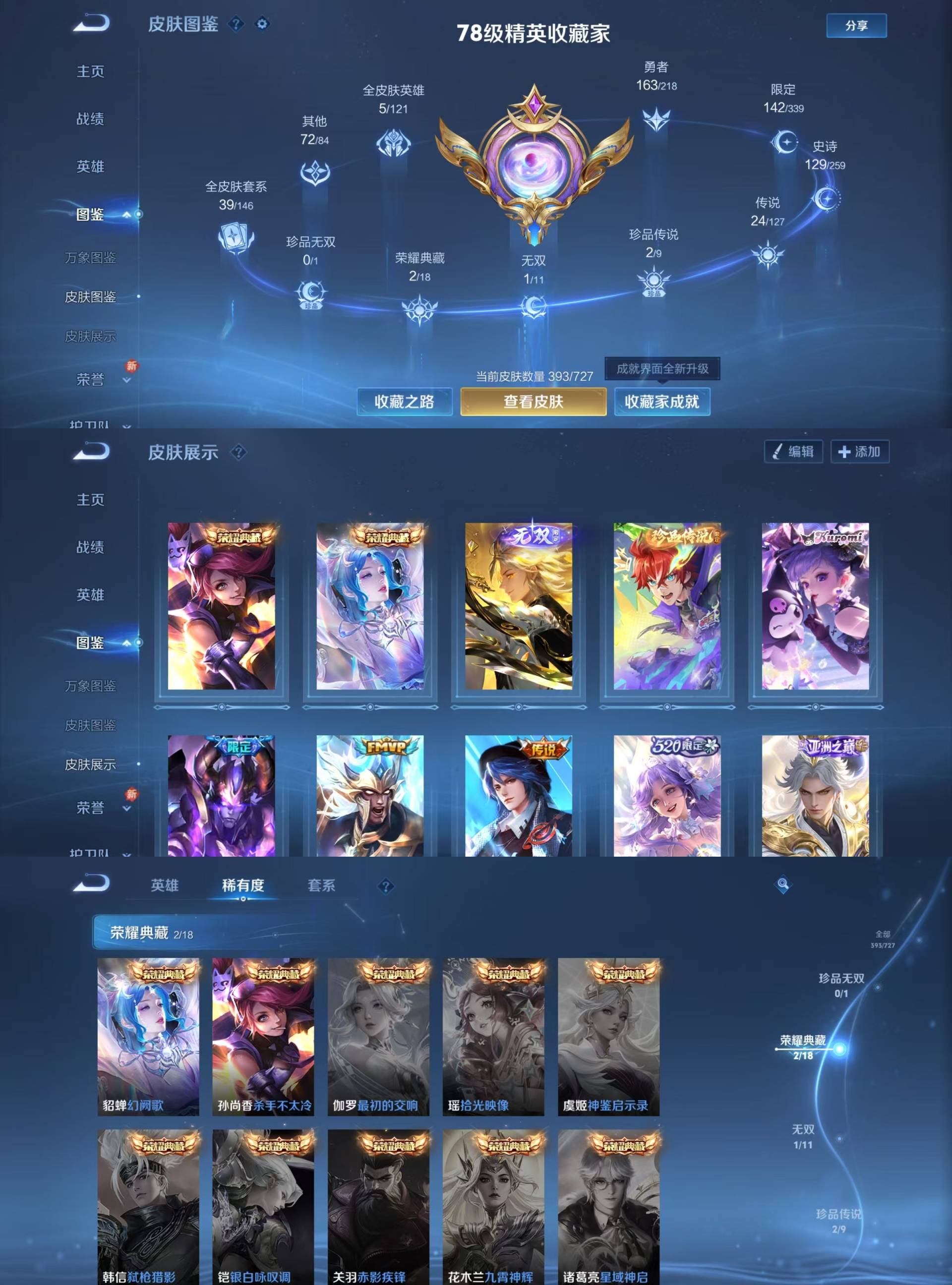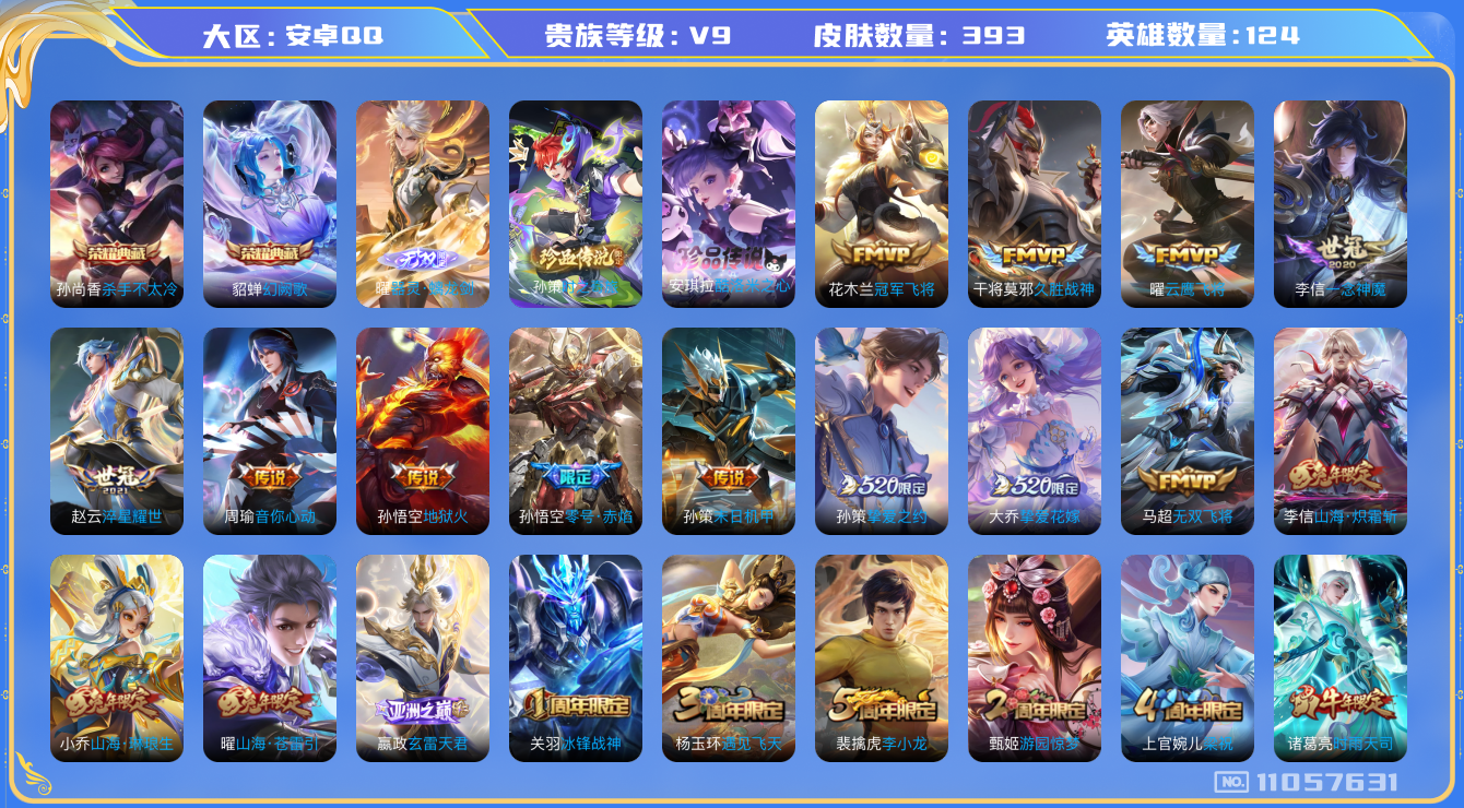 [11057631]可二次修改-皇冠等级 安卓QQ 贵族9 荣耀典藏2 无双1 珍品传说2 星元皮肤2 传说皮肤24 史诗皮肤129 皮肤数量393 皮肤价值:311474 英雄124 非凡王者 【荣耀皮肤】2 貂蝉_幻阙歌 孙尚香_杀手不太冷 【无双皮肤】1 曜_器灵螭龙剑 【珍品传说】2 孙策_时之奇旅 安琪拉_酷洛米之心 【星元皮肤】2 岁雨灵司 幽冥火 【传说皮肤】24 澜_愿照九州拓 嬴政_玄雷天君 桑启_鸣野蒿 李信_山海炽霜斩 小乔_山海琳琅生 曜_山海苍雷引 诸葛亮_时雨天司 大乔_挚爱花嫁 孙策_挚爱之约 虞姬_启明星使 孙策_末日机甲 周瑜_音你心动 孙悟空_地狱火 孙悟空_齐天大圣 孙悟空_零号赤焰 吕布_天魔缭乱 吕布_怒海麟威 马超_无双飞将 曜_云鹰飞将 干将莫邪_久胜战神 花木兰_冠军飞将 李白_诗剑行 赵云_淬星耀世 李信_一念神魔 【史诗皮肤】129 黄忠_百相守梦 狂铁_龙之律动 后羿_石田雨龙 孙膑_茶境仙 赵怀真_器灵浮梦炉 百里守约_百相守梦 亚连_破空之剑 李白_谪仙醉月 姬小满_战舞者 阿轲_化蝶舞 狄仁杰_魔术师 赵云_皇家上将 马可波罗_山海玄木吟 瑶_山海碧波行 苏烈_玄武志 百里守约_朱雀志 后羿_辉光之辰 孙悟空_大圣娶亲 孙悟空_至尊宝 貂蝉_唤灵魅影 伽罗_箭羽风息 铠_曙光守护者 花木兰_水晶猎龙者 妲己_时之彼端 干将莫邪_冰霜恋舞曲 花木兰_青春决赛季 庄周_云端筑梦师 阿古朵_江河有灵 鬼谷子_五谷丰年 庄周_高山流水 裴擒虎_李小龙 上官婉儿_梁祝 杨玉环_遇见飞天 甄姬_游园惊梦 关羽_冰锋战神 司空震_地狱燃心 戈娅_驭风魔法 扁鹊_奇幻香踪 暃_星界游侠 钟无艳_超时空战士 狂铁_电玩高手 明世隐_吟游魔法 黄忠_火炮绅士 干将莫邪_真爱魔法 老夫子_航海奇遇记 米莱狄_胡桃异想国 元歌_云间偶戏 蒙犽_狂想玩偶喵 马可波罗_暗影游猎 阿轲_迷踪丽影 李元芳_银河之约 兰陵王_驯魔猎人 鲁班七号_狮舞东方 典韦_蓝屏警告 嬴政_白昼王子 镜_匿光追影者 东皇太一_逐梦之光 韩信_逐梦之影