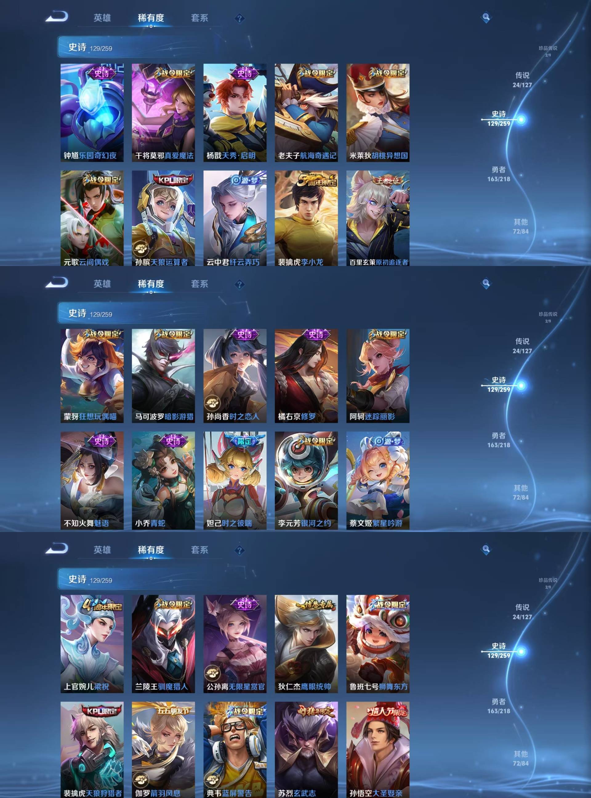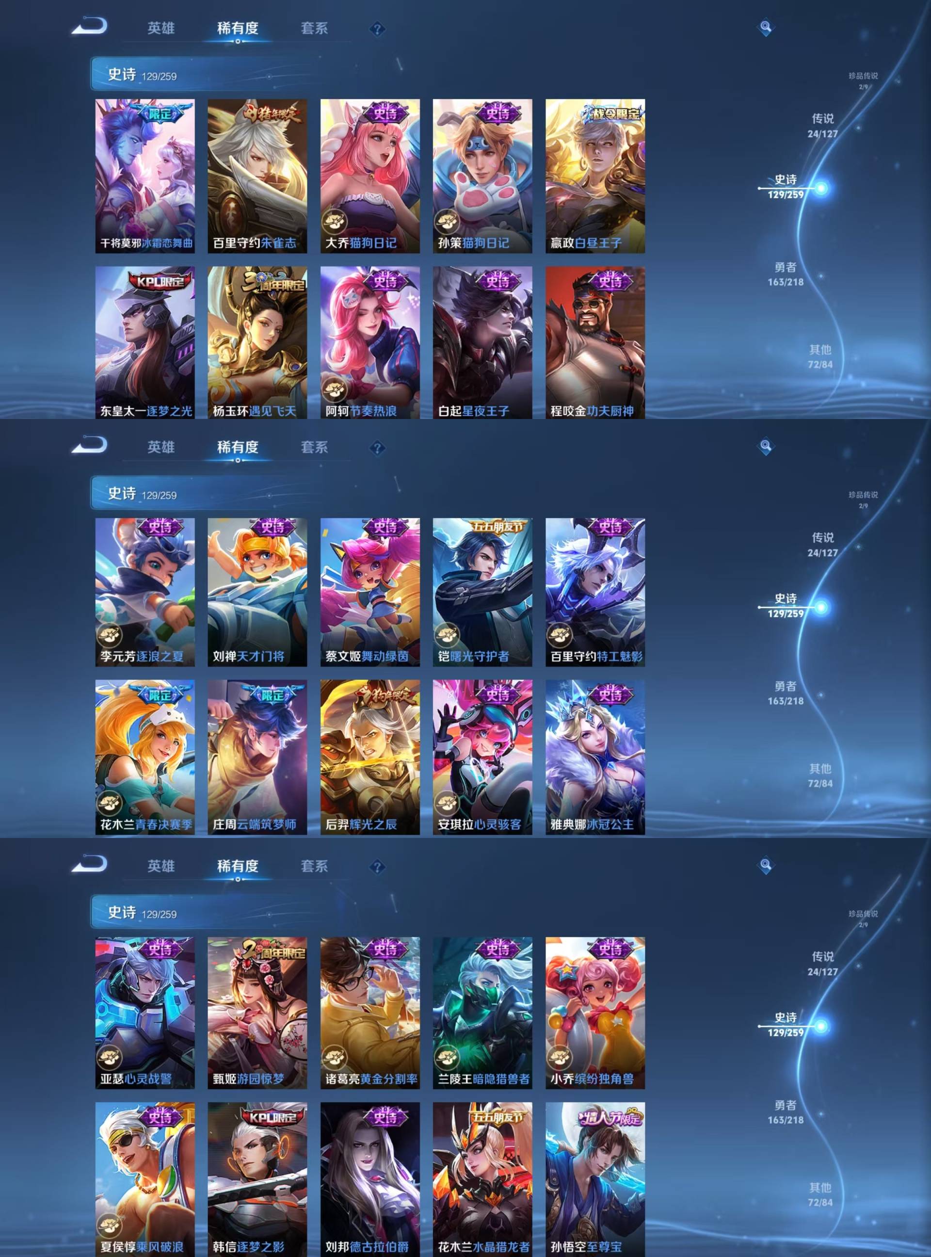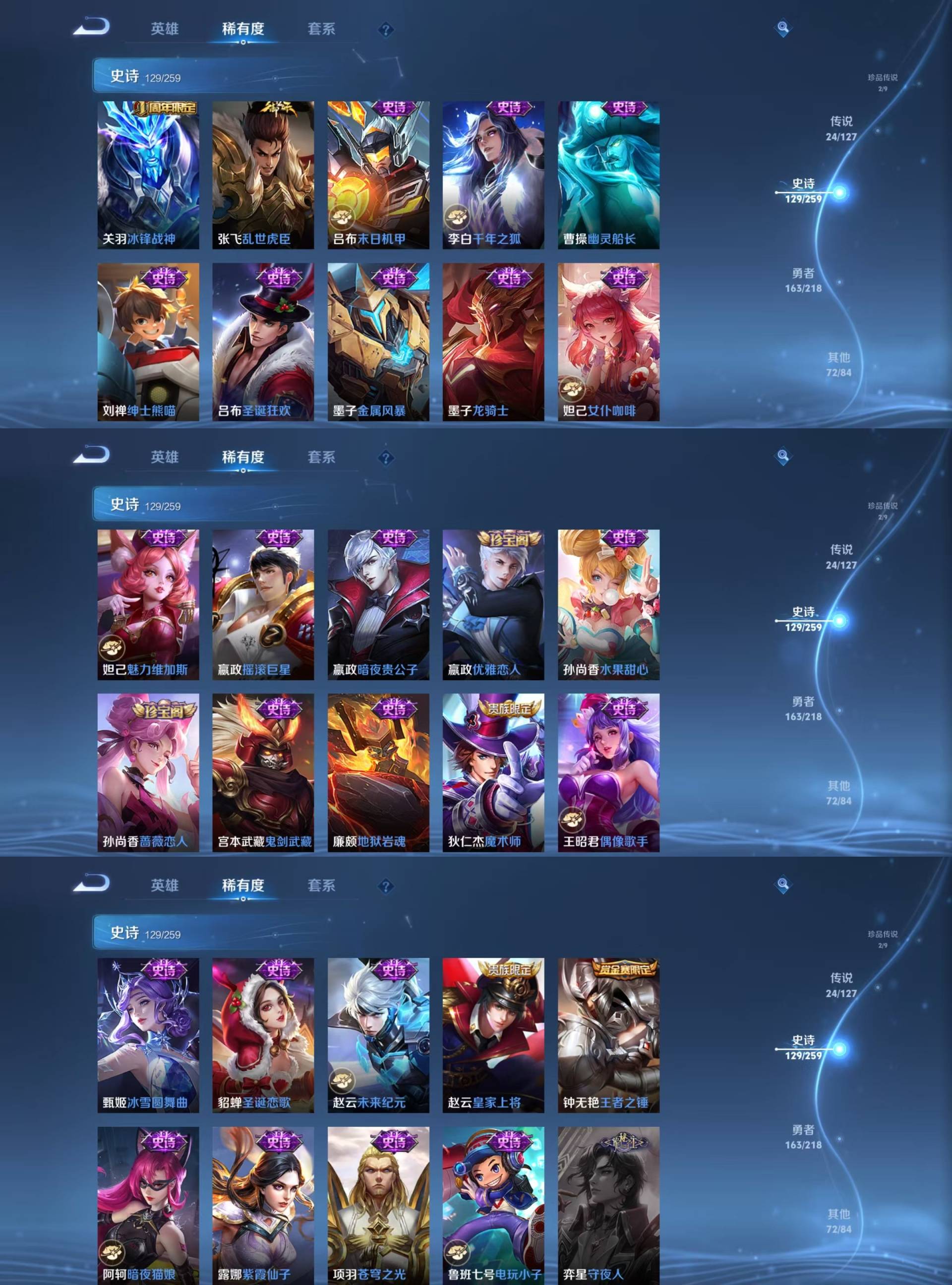 关羽冰锋战神,裴擒虎李小龙,上官婉儿梁祝,诸葛亮时雨天司,后羿辉光之辰,裴擒虎天狼狩猎者,孙膑天狼运算者,韩信逐梦之影,东皇太一逐梦之光,苏烈玄武志,百里守约朱雀志,孙悟空大圣娶亲,孙悟空至尊宝,干将莫邪冰霜恋舞曲,花木兰青春决赛季,妲己时之彼端,庄周云端筑梦师,孙悟空孙行者,甄姬女儿国国王,镜匿光追影者,李白诗剑行,马可波罗山海·玄木吟,瑶山海·碧波行,桑启鸣野蒿,澜愿照·九州拓