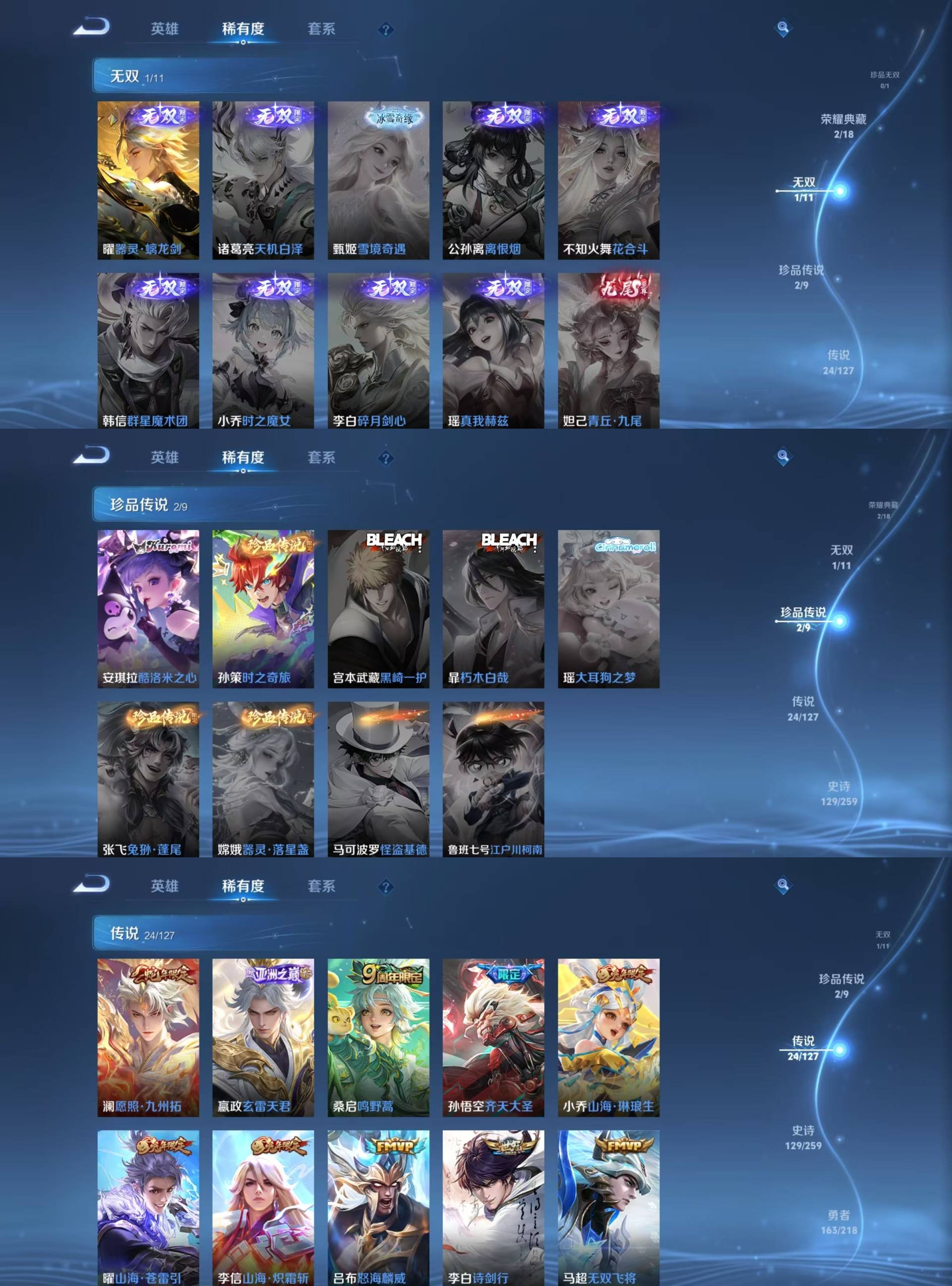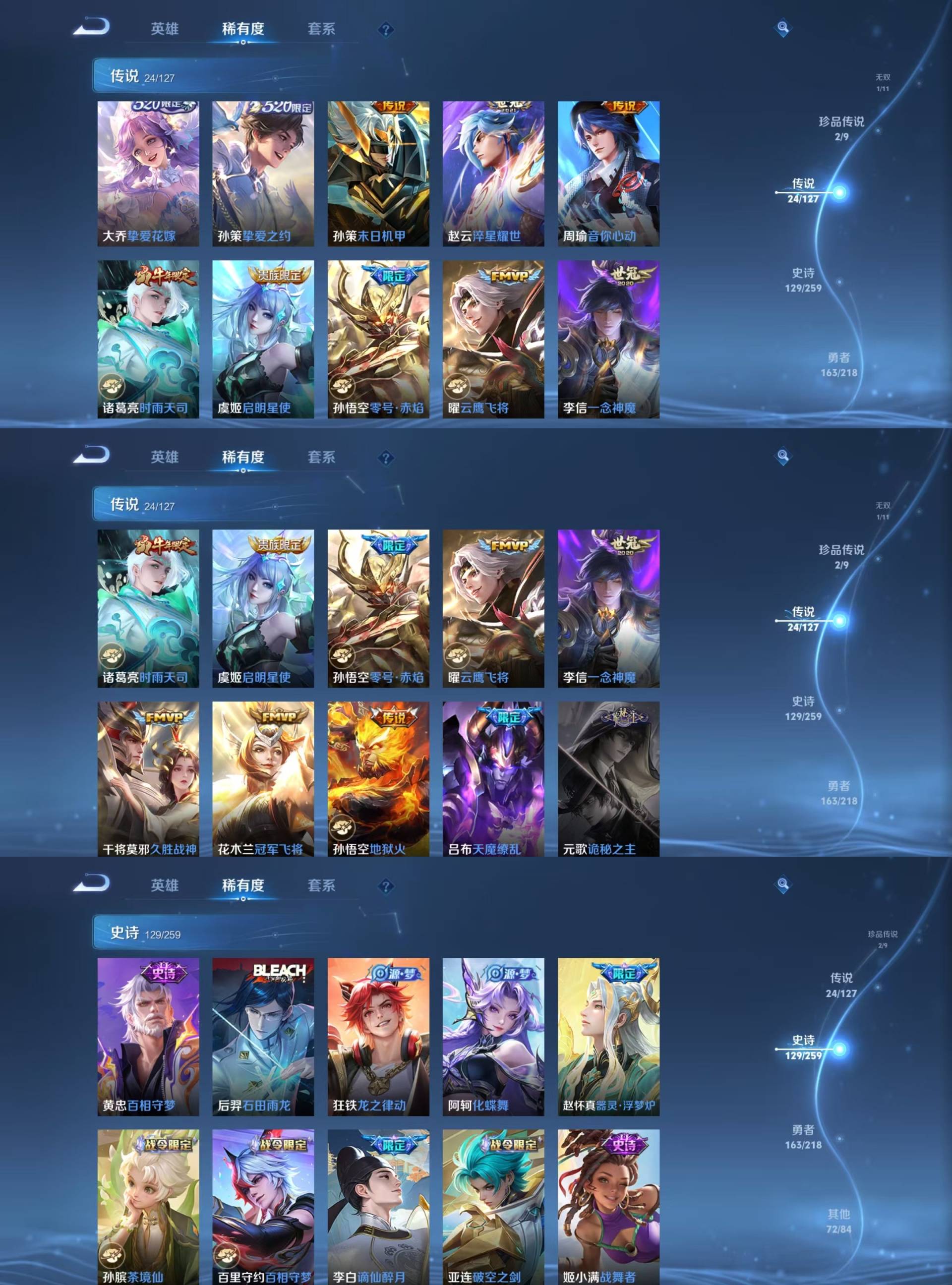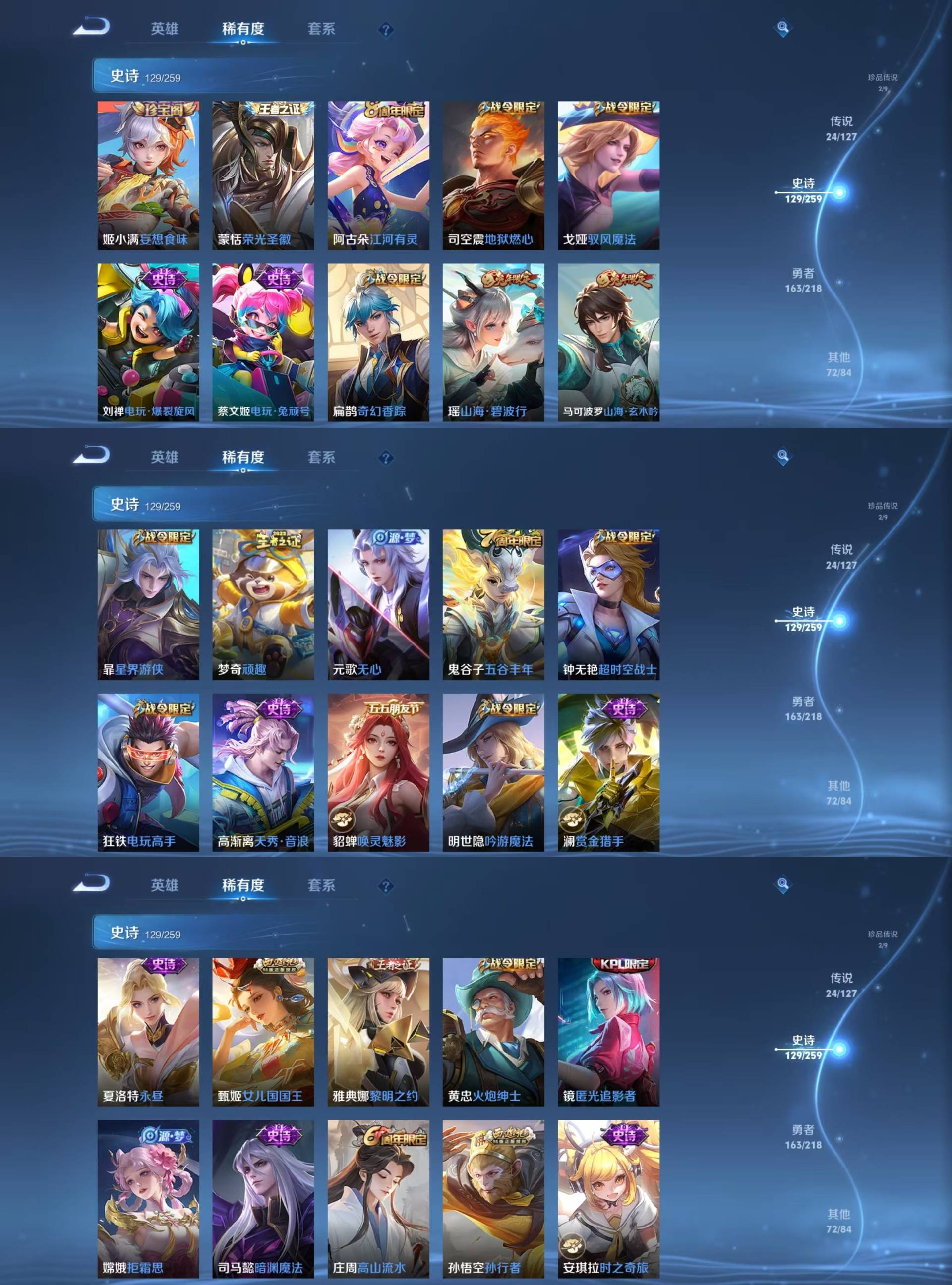 关羽冰锋战神,裴擒虎李小龙,上官婉儿梁祝,诸葛亮时雨天司,后羿辉光之辰,裴擒虎天狼狩猎者,孙膑天狼运算者,韩信逐梦之影,东皇太一逐梦之光,苏烈玄武志,百里守约朱雀志,孙悟空大圣娶亲,孙悟空至尊宝,干将莫邪冰霜恋舞曲,花木兰青春决赛季,妲己时之彼端,庄周云端筑梦师,孙悟空孙行者,甄姬女儿国国王,镜匿光追影者,李白诗剑行,马可波罗山海·玄木吟,瑶山海·碧波行,桑启鸣野蒿,澜愿照·九州拓