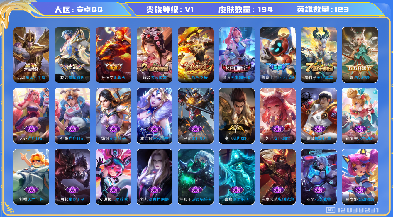 [12038231]暑期末清货/特价急出/永久包赔【商品标题】:安卓Q-V1-永恒钻石IV段位-123英雄-194皮肤-3传说-52史诗
