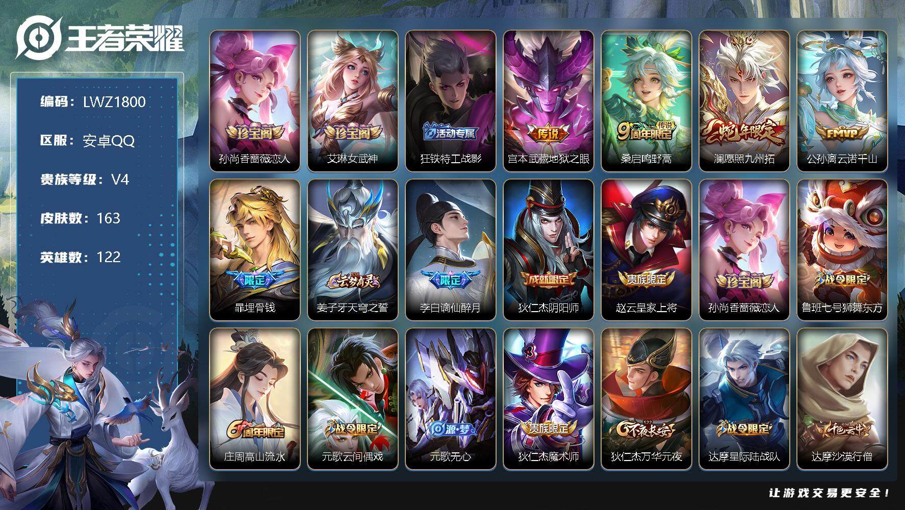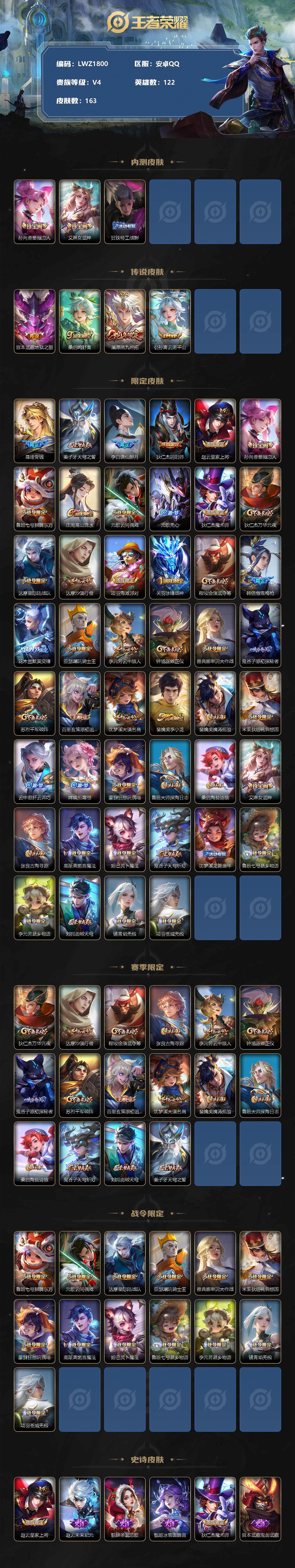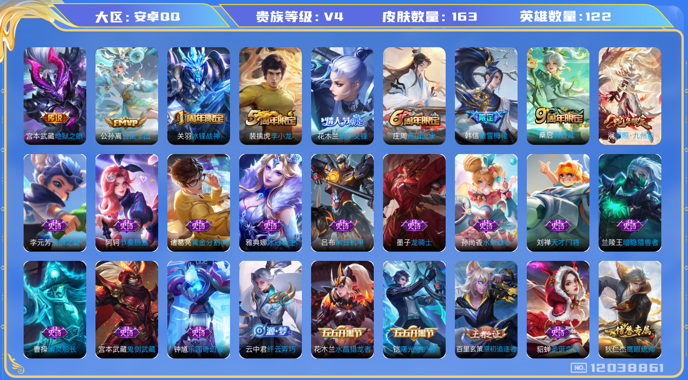 [12038861]暑期末清货/特价急出/永久包赔:安卓Q-V4-永恒钻石I段位-122英雄-163皮肤-4传说-46史诗