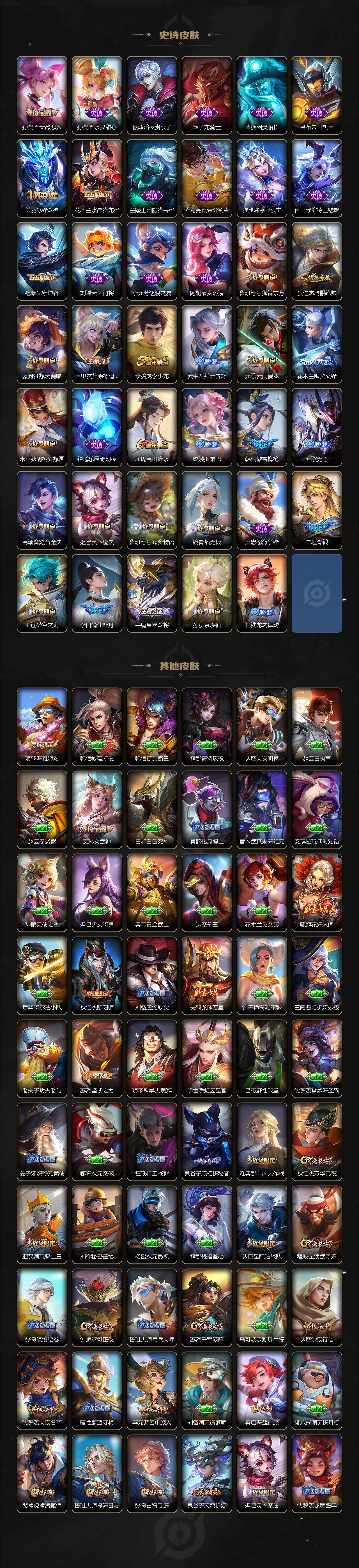 【史诗皮肤】:赵云皇家上将,赵云未来纪元,貂蝉圣诞恋歌,甄姬冰雪圆舞曲,狄仁杰魔术师,宫本武藏鬼剑武藏,孙尚香蔷薇恋人,孙尚香水果甜心,嬴政暗夜贵公子,墨子龙骑士,曹操幽灵船长,吕布末日机甲,关羽冰锋战神,花木兰水晶猎龙者,兰陵王暗隐猎兽者,诸葛亮黄金分割率,雅典娜冰冠公主,百里守约特工魅影,铠曙光守护者,刘禅天才门将,李元芳逐浪之夏,阿轲节奏热浪,鲁班七号狮舞东方,狄仁杰鹰眼统帅,蒙犽狂想玩偶喵,百里玄策原初追逐者,裴擒虎李小龙,云中君纤云弄巧,元歌云间偶戏,花木兰默契交锋,米莱狄胡桃异想国,钟馗乐园奇幻夜,庄周高山流水,嫦娥拒霜思,韩信傲雪梅枪,元歌无心,妲己灵