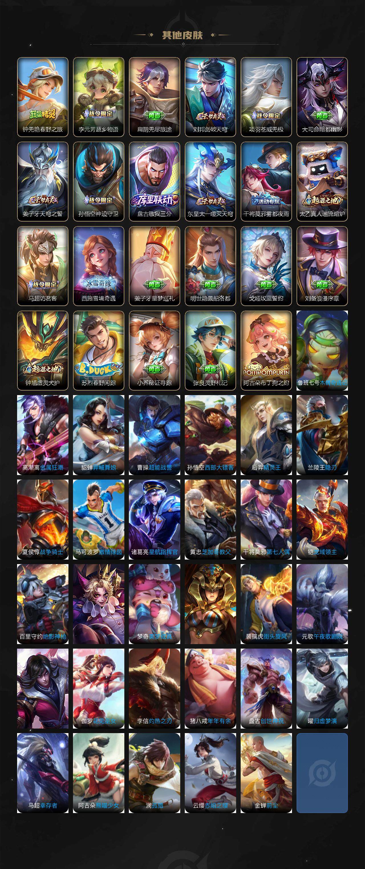 【限定皮肤】:暃埋骨钱,姜子牙天穹之誓,李白谪仙醉月,狄仁杰阴阳师,赵云皇家上将,孙尚香蔷薇恋人,鲁班七号狮舞东方,庄周高山流水,元歌云间偶戏,元歌无心,狄仁杰魔术师,狄仁杰万华元夜,达摩星际陆战队,达摩沙漠行僧,项羽海滩派对,关羽冰锋战神,程咬金演武夺筹,韩信傲雪梅枪,花木兰默契交锋,亚瑟潮玩骑士王,李元芳云中旅人,钟馗驱傩正仪,雅典娜单词大作战,鬼谷子原初探秘者,苏烈千军破阵,百里玄策原初追逐者,沈梦溪大漠名商,裴擒虎李小龙,裴擒虎擒涛扼浪,米莱狄胡桃异想国,云中君纤云弄巧,嫦娥拒霜思,蒙犽狂想玩偶喵,鲁班大师探海日志,桑启海盐诗旅,艾琳女武神,张良古海寻踪,高渐离燃音魔法,妲己灵卜魔法,鬼谷子天穹祈灯,沈梦溪龙舞盛年,鲁班七号蔬乡物语,李元芳蔬乡物语,刘邦剑破天穹,镜青焰无极,项羽苍威无极