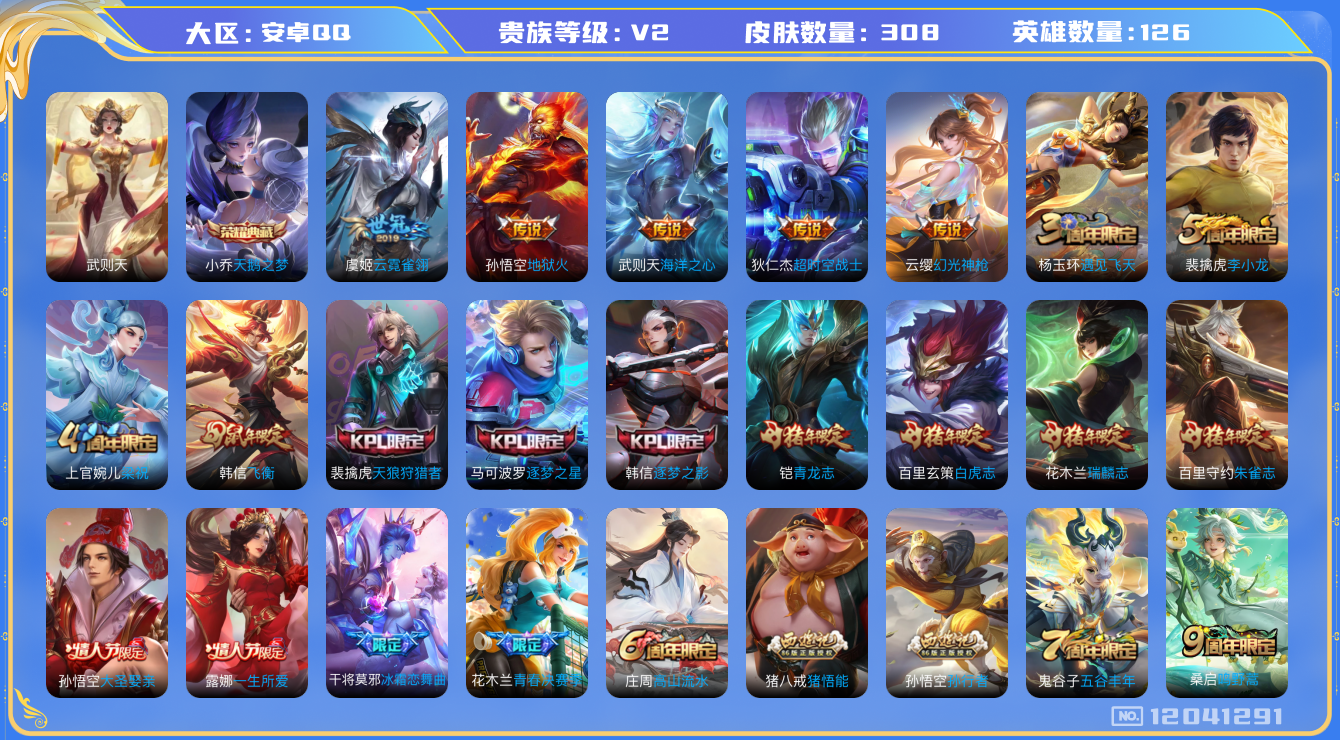 [12041291]【特价急出/详情看图】:安卓Q-V2-至尊星耀IV段位-126英雄-308皮肤-1典藏-10传说-79史诗