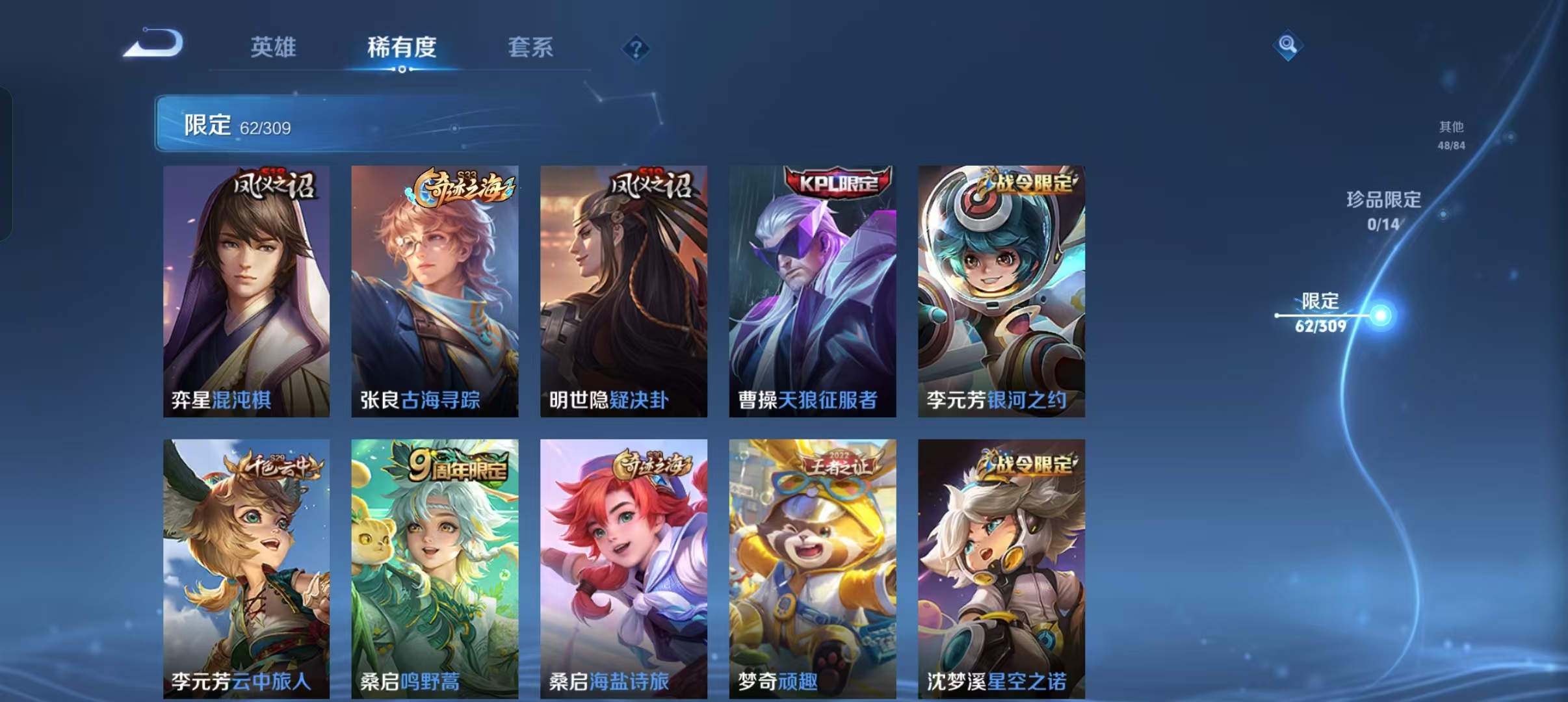 盾山御銮,夏侯惇朔风刀,明世隐疑决卦,老夫子醍醐杖,鬼谷子原初探秘者,狄仁杰万华元夜,程咬金演武夺筹,钟馗驱傩正仪,苏烈千军破阵,沈梦溪星空之诺,李元芳银河之约,马可波罗暗影游猎,元歌云间偶戏,弈星混沌棋,达摩沙漠行僧,兰陵王金庭之子,沈梦溪大漠名商,李元芳云中旅人,桑启海盐诗旅,裴擒虎擒涛扼浪,鲁班大师探海日志,张良古海寻踪