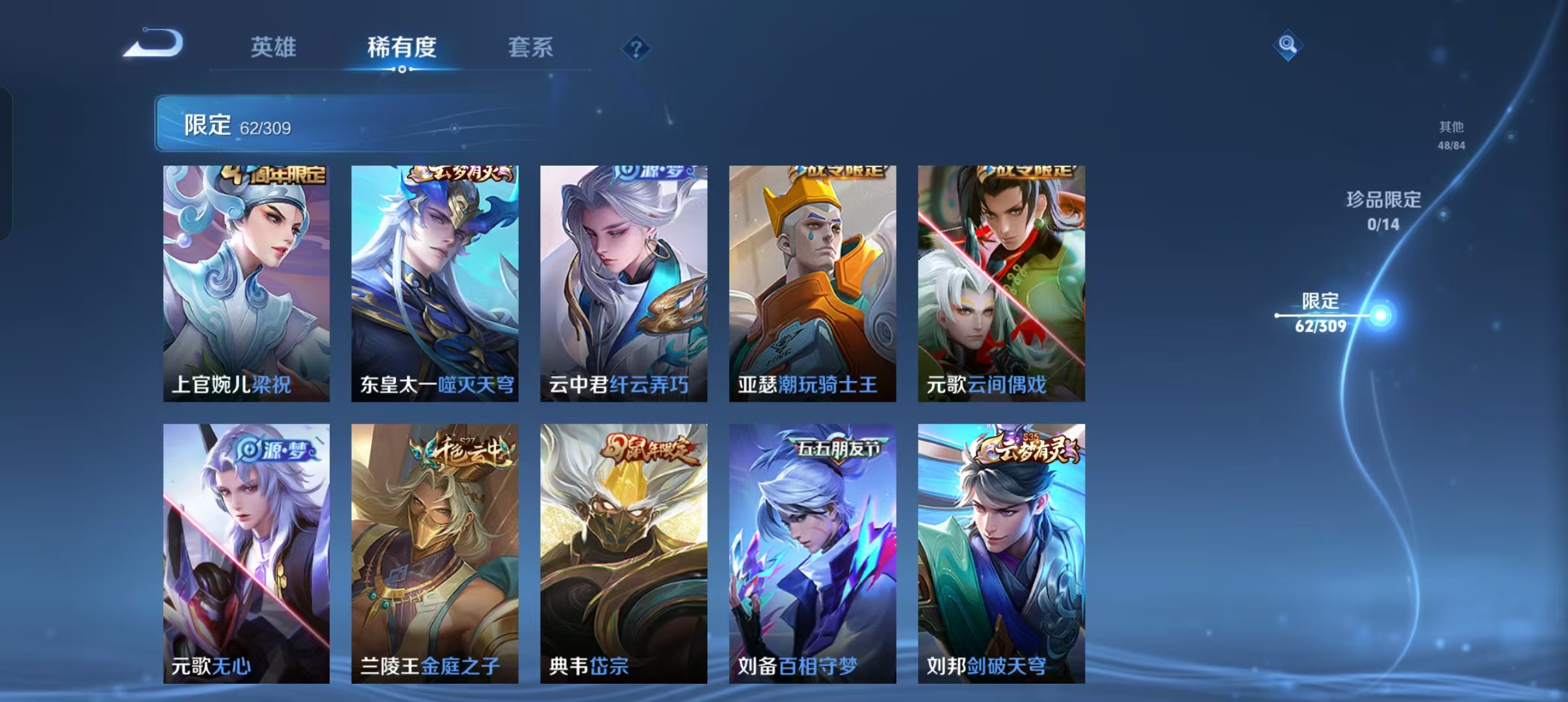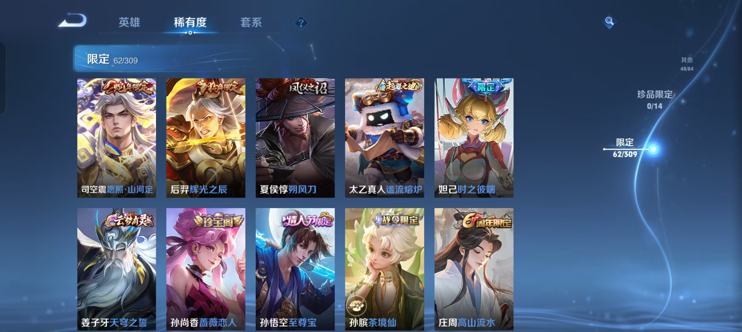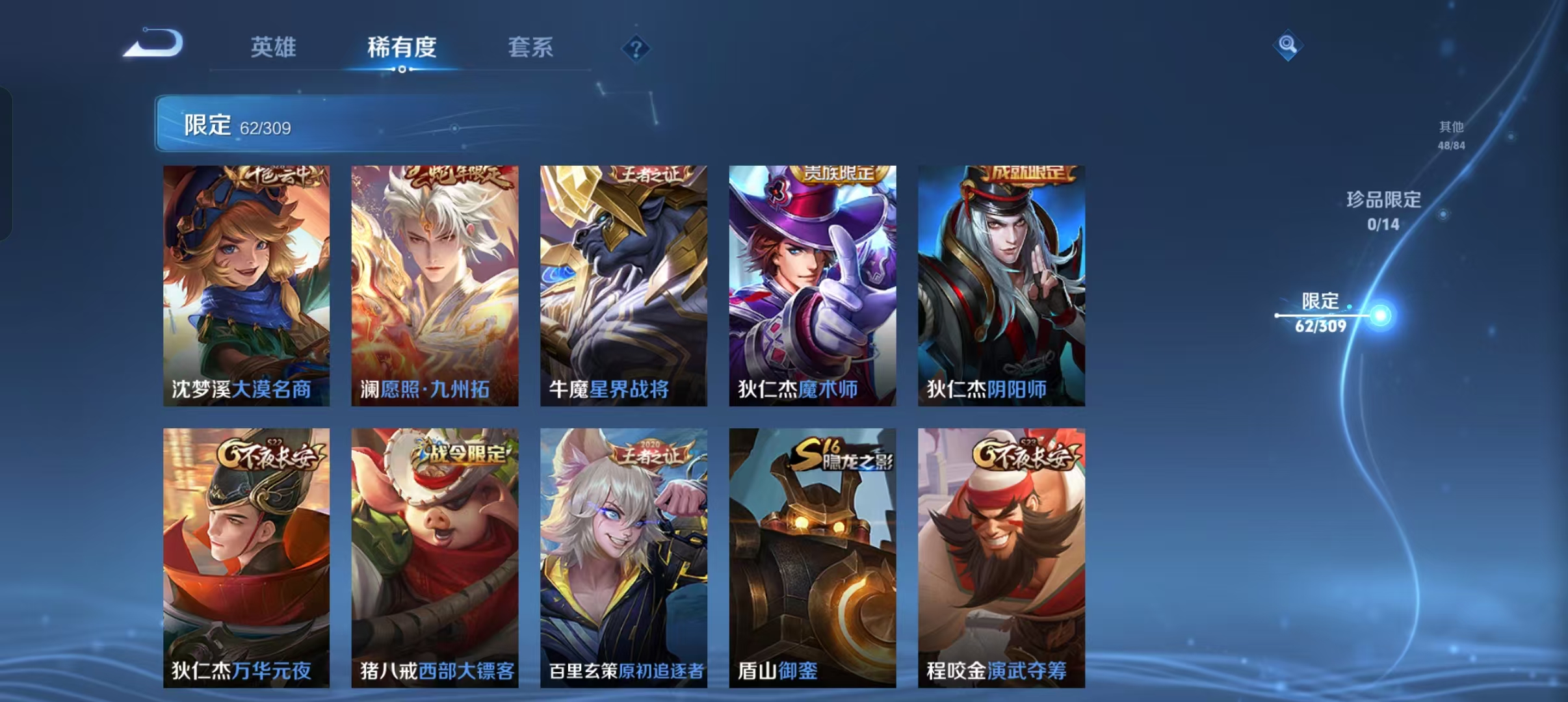 裴擒虎李小龙,上官婉儿梁祝,马超神威,后羿辉光之辰,典韦岱宗,韩信飞衡,曹操天狼征服者,铠青龙志,孙悟空至尊宝,妲己时之彼端,马可波罗山海·玄木吟,桑启鸣野蒿,澜愿照·九州拓,司空震愿照·山河定