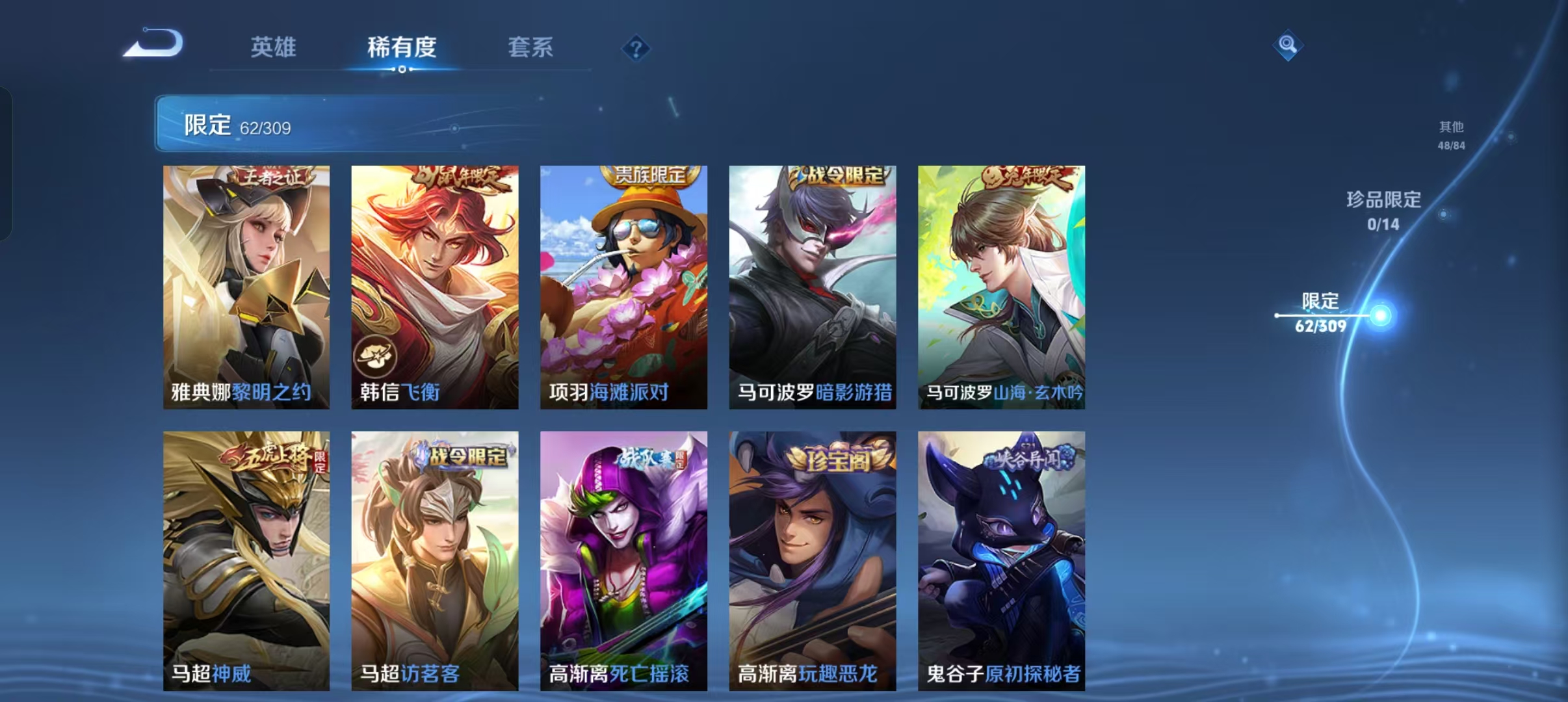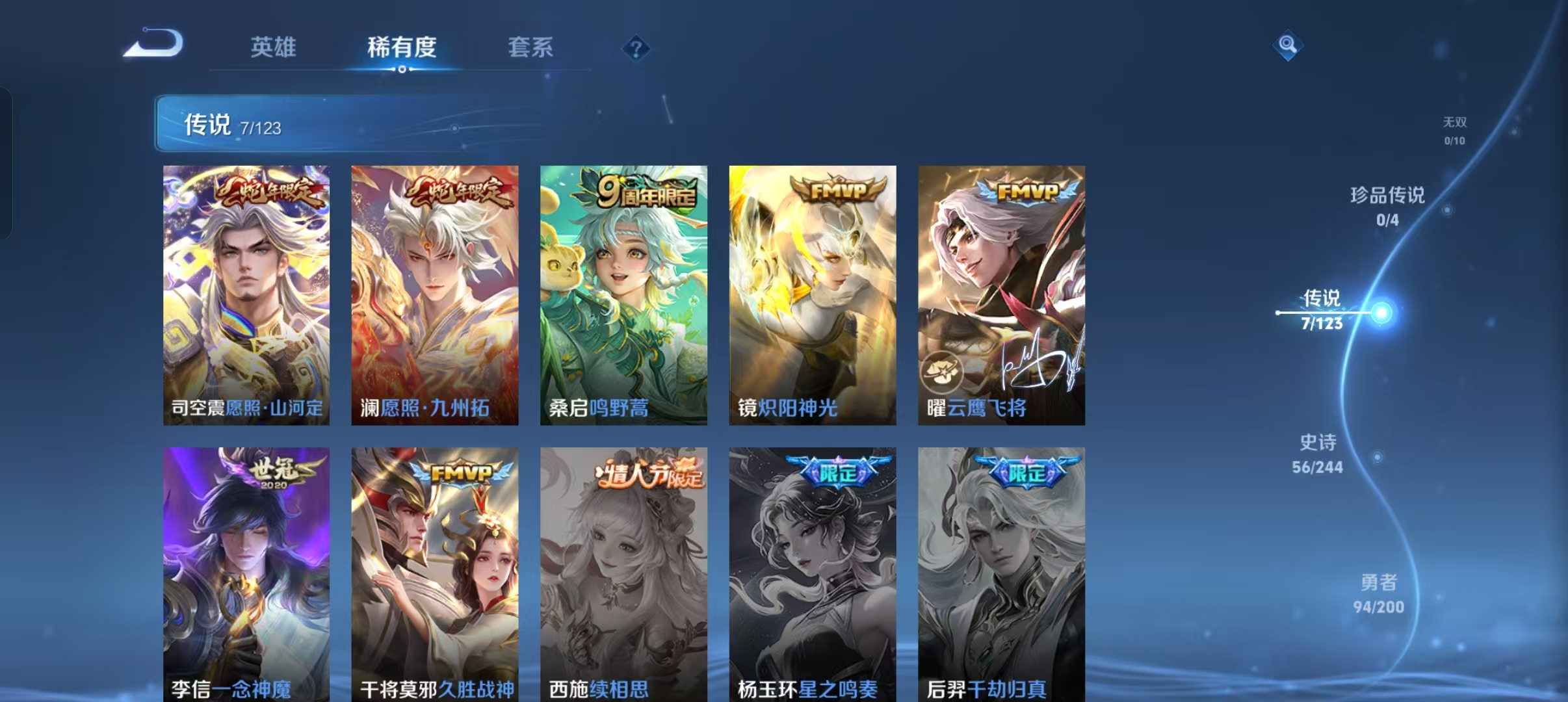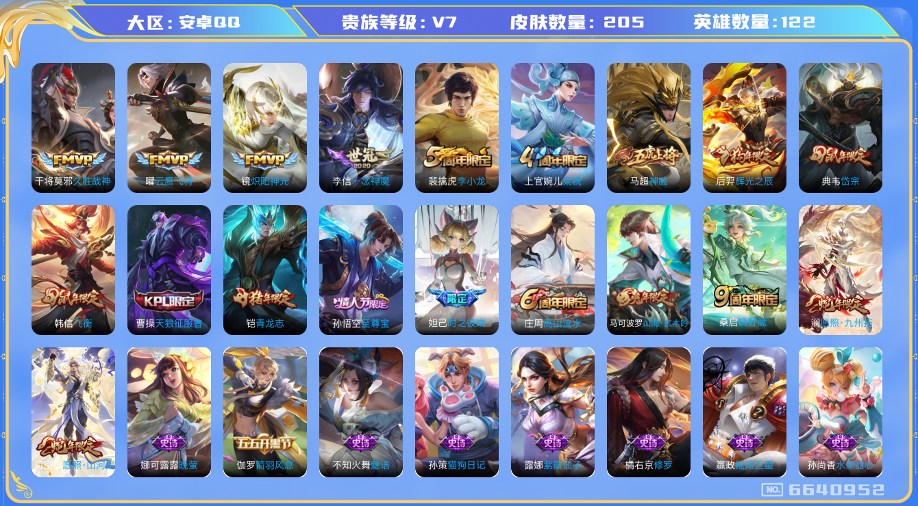 - PX_2102387-实名: 可修改 贵族等级: V7 英雄数: 124 皮肤数: 227 传说皮: 绛天战甲,久胜战神,末日机甲-孙尚香,零号·赤焰,末日机甲-孙策 限定皮: 遇见飞天,李小龙,梁祝,飞衡,凤求凰,白虎志,梅西,至尊宝,如梦令-后羿,大圣娶亲,五谷丰年,愿照·九州拓