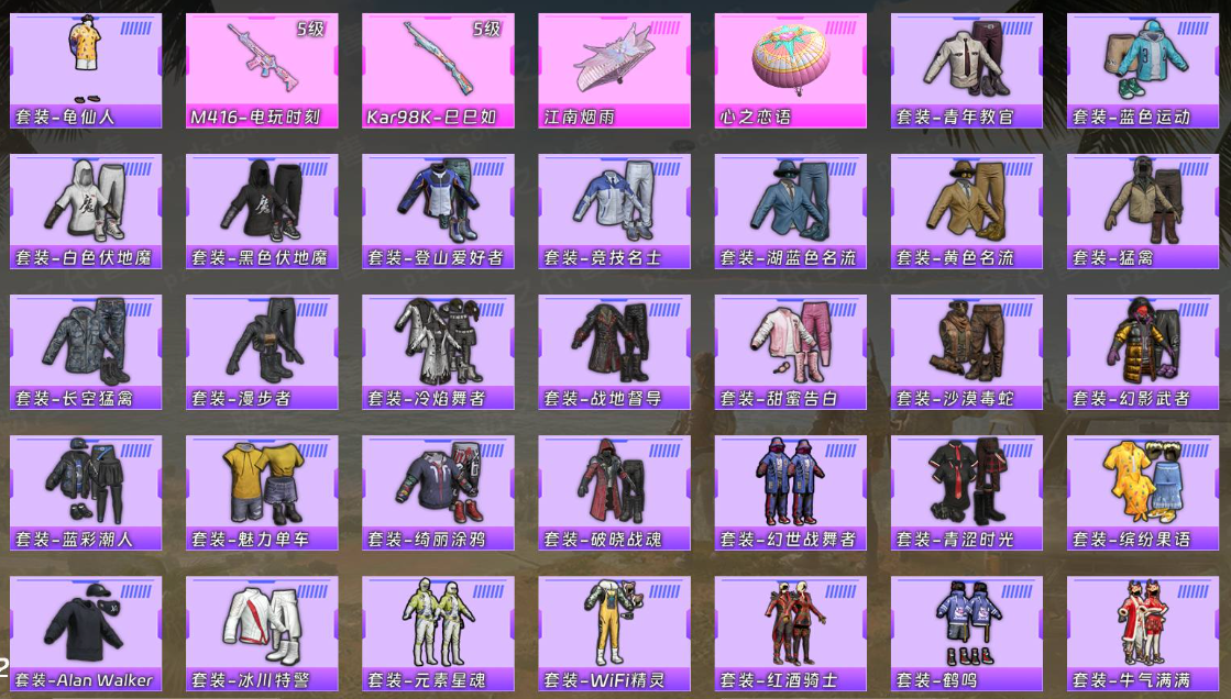 - [10197291]实名: 可修改 时装数: 563 载具数: 7 枪械数: 210 战备数: 136 热门装扮: 奇异狩猎者,梦幻火箭(新101),呆萌铁蟹,宝贝奶油派,浪漫波比,天使彩虹糖,放客神游,鹰眼刺客,缤纷油彩,酷熊伴侣,萌熊伴侣,香水柠檬,绚金战神,极致幻想,冥河战士,沙漠守护者,激萌罗小黑,浪客战士,神秘黑猫,暗夜魅影,狂魅哈莉 载具: 玛莎拉蒂Ghibli(粉),双人摩托-双刃魅影(红),阿斯顿·马丁DBS(绿),阿斯顿·马丁DBX(橙),合金龙骨(绿),特斯拉Roadster(水滴蓝),兰博基尼Aventador SVJ(翡翠绿) 稀有枪皮: M416心之恋语,AKM梦之光华,GROZA焦糖拿铁,SCAR-L青春物语,Kar98K-巳巳如意,AUG-暖羊咩咩,Mk14-爆裂游戏,破片手榴弹-美味星星糖