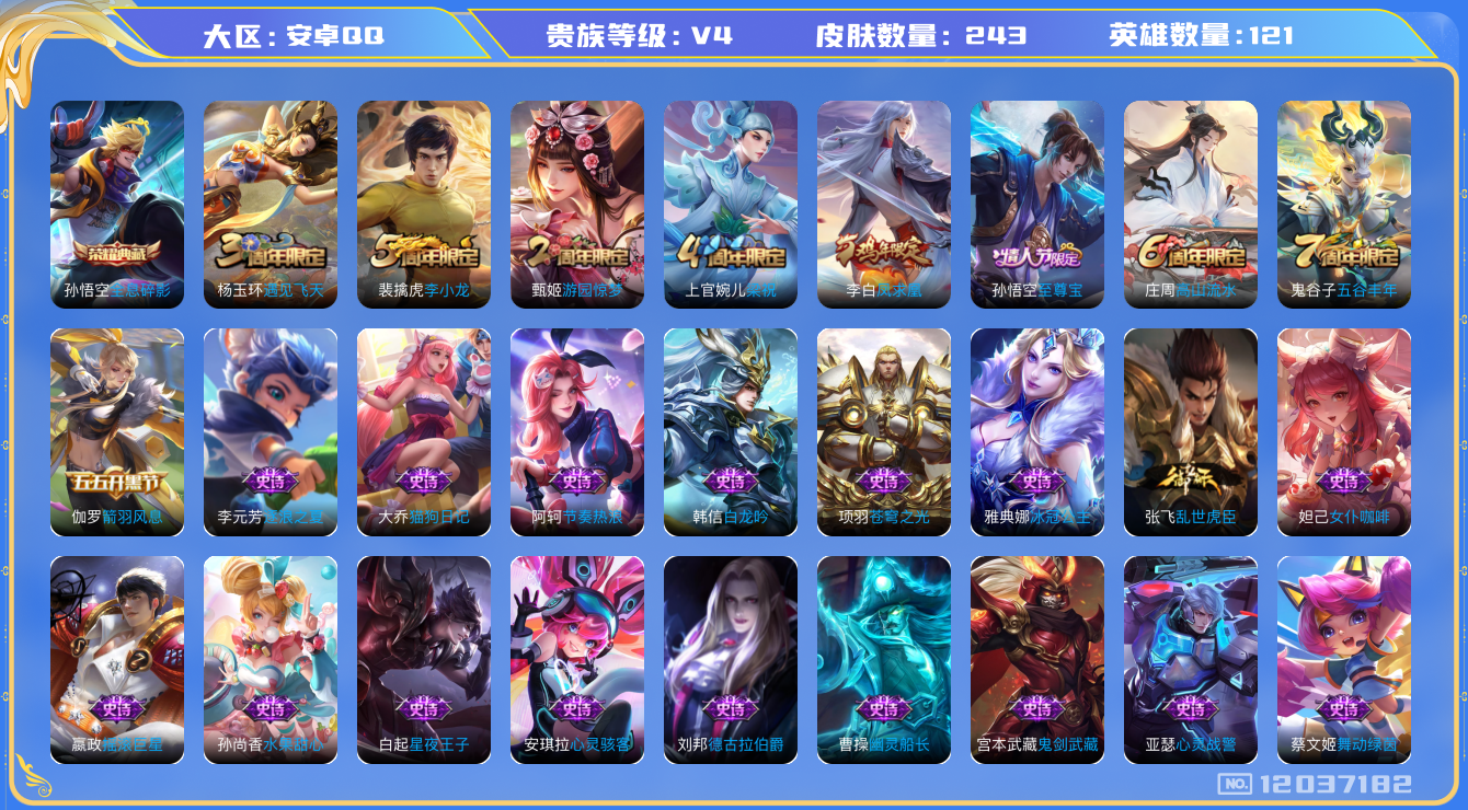 [12037182]【暑期末清货/特价急出/永久包赔/商品详情看图】:安卓Q-V4-至尊星耀II段位-121英雄-243皮肤-1典藏-1传说-55史诗