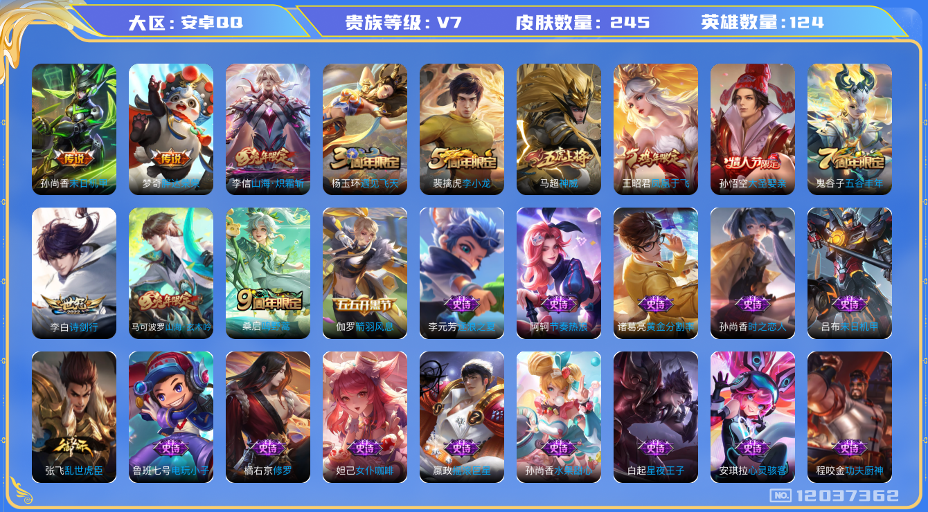 [12037362]【暑期末清货/特价急出/永久包赔】:安卓Q-V7-最强王者段位-124英雄-245皮肤-5传说-62史诗