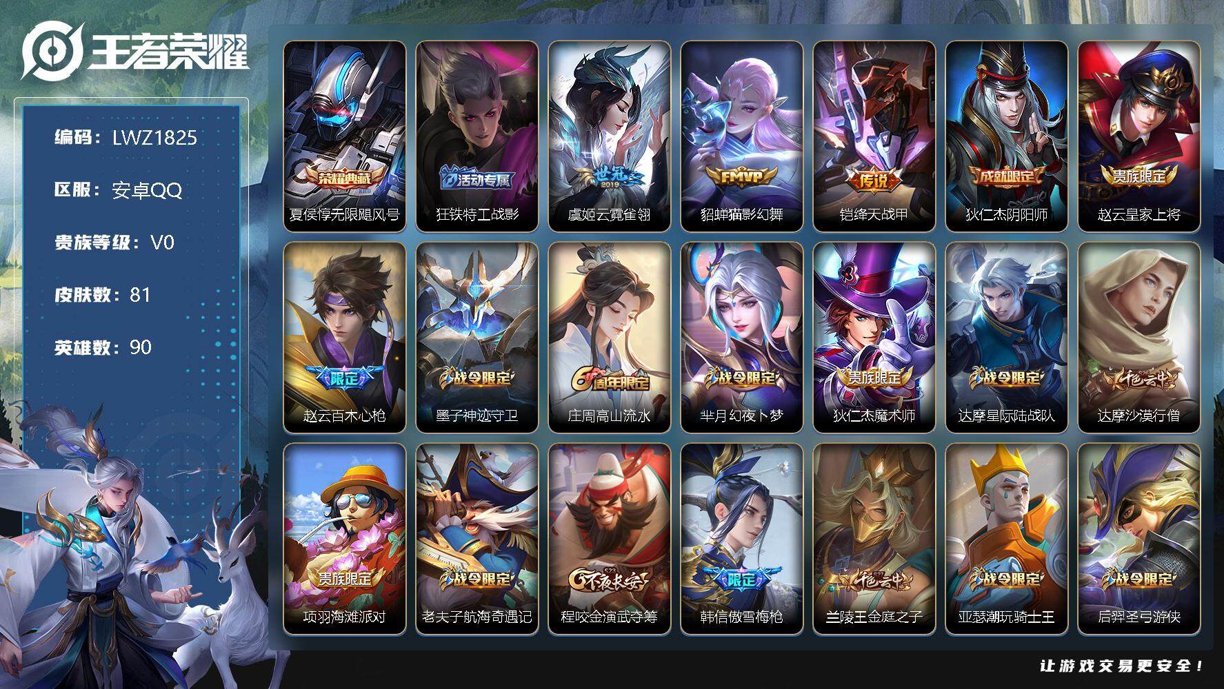 [12039002]暑期末清货/特价急出/永久包赔【商品标题】:安卓Q-V0-永恒钻石V段位-90英雄-81皮肤-1典藏--3传说-24史诗【荣耀典藏】:夏侯惇无限飓风号【内测皮肤】:狂铁特工战影【传说皮肤】:虞姬云霓雀翎,貂蝉猫影幻舞,铠绛天战甲【限定皮肤】:狄仁杰阴阳师,赵云皇家上将,赵云百木心枪,墨子神迹守卫,庄周高山流水,芈月幻夜卜梦,狄仁杰魔术师,达摩星际陆战队,达摩沙漠行僧,项羽海滩派对,老夫子航海奇遇记,程咬金演武夺筹,韩信傲雪梅枪,兰陵王金庭之子,亚瑟潮玩骑士王,后羿圣弓游侠,李元芳云中旅人,钟馗驱傩正仪,干将莫邪真爱魔法,黄忠火炮绅士,苏烈千军破阵,沈梦溪大漠名商,裴擒虎擒涛扼浪,伽罗天狼溯光者,鲁班大师探海日志,桑启海盐诗旅,阿古朵江河有灵,张良古海寻踪,鬼谷子天穹祈灯,姬小满妄想食味,刘邦剑破天穹,程咬金群星魔术团【赛季限定】:达摩沙漠行僧,程咬金演武夺筹,兰陵王金庭之子,张良古海寻踪,李元芳云中旅人,钟馗驱傩正仪,苏烈千军破阵,沈梦溪大漠名商,裴擒虎擒涛扼浪,鲁班大师探海日志,桑启海盐诗旅,鬼谷子天穹祈灯,刘邦剑破天穹 【战令限定】:墨子神迹守卫,芈月幻夜卜梦,达摩星际陆战队,老夫子航海奇遇记,亚瑟潮玩骑士王,后羿圣弓游侠,干将莫邪真爱魔法,黄忠火炮绅士 【史诗皮肤】:赵云皇家上将,貂蝉圣诞恋歌,甄姬冰雪圆舞曲,王昭君偶像歌手,狄仁杰魔术师,宫本武藏鬼剑武藏,孙尚香水果甜心,墨子金属风暴,张飞乱世虎臣,刘邦德古拉伯爵,亚瑟心灵战警,雅典娜冰冠公主,狄仁杰鹰眼统帅,娜可露露晚萤,不知火舞魅语,老夫子航海奇遇记,伽罗天狼溯光者,干将莫邪真爱魔法,庄周高山流水,黄忠火炮绅士,韩信傲雪梅枪,赵云百木心枪,阿古朵江河有灵,姬小满妄想食味 【其他皮肤】:项羽海滩派对,韩信教廷特使,芈月红桃皇后,安琪拉玩偶对对碰,妲己少女阿狸,达摩拳王,张飞五福同心,刘备万事如意,宫本武藏万象初新,狄仁杰阴阳师,钟无艳海滩丽影,老夫子功夫老勺,孙尚香沉稳之力,吕布野性能量,狂铁特工战影,亚瑟潮玩骑士王,达摩星际陆战队,程咬金演武夺筹,张良缤纷绘卷,钟馗驱傩正仪,墨子神迹守卫,苏烈千军破阵,后羿圣弓游侠,典韦铁甲之心,马可波罗潮玩牛仔,达摩沙漠行僧,芈月幻夜卜梦,刘邦虎啸剑宗,兰陵王金庭之子,沈梦溪大漠名商,李元芳云中旅人,桑启海盐诗旅,裴擒虎擒涛扼浪,鲁班大师探海日志,张良古海寻踪,后羿完