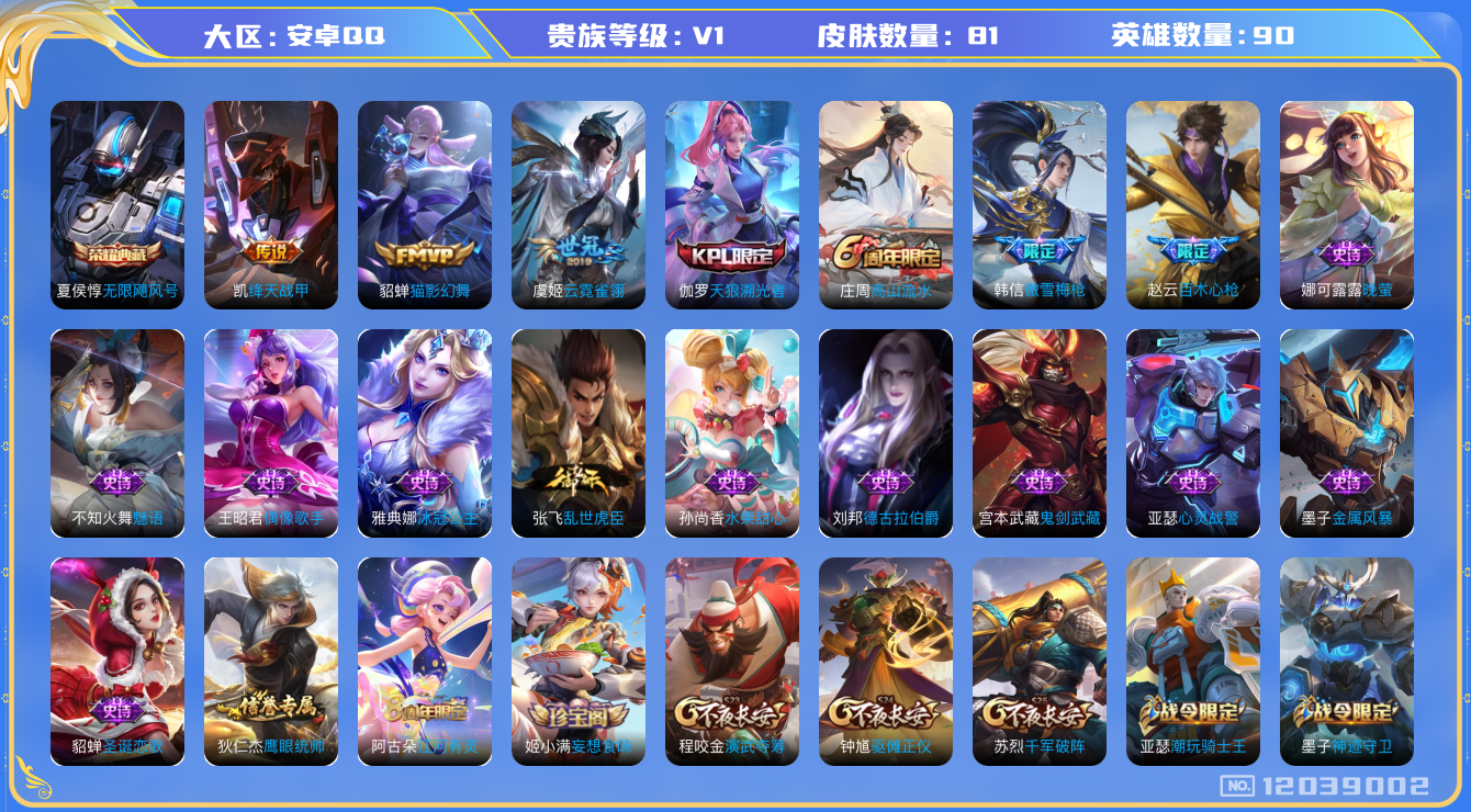 - [11446315]V7 1典藏 10传说 125英雄 219皮肤 可修改实名 优质装备:九霄神辉(木兰典藏),云鹰飞将(小将军),久胜战神,一念神魔,无双飞将,山海·炽霜斩(李信年限),澜逐花归海 珍宝阁皮:妄想食味,蔷薇恋人,女武神 限定皮:愿照·岁时盈(虞姬年限),愿照·千秋盛(女娲年限),鸣野蒿,时雨天司(水龙头),遇见飞天,高山流水,五谷丰年,梁祝,李小龙,孙行者,山海·玄木吟(马可年限) 史诗皮:化蝶舞,星界战将,龙之律动,石田雨龙,谪仙醉月,百相守梦-黄忠,紫霞仙子,特工魅影,百相守梦(关羽),电玩·爆裂旋风,江河有灵,蒙恬荣光圣徽,偶像歌手,龙骑士(小龙虾),无限星赏官,末日机甲-吕布,猫狗日记-孙策,时之恋人-孙尚香,乱世虎臣,节奏热浪,修罗,女仆咖啡,摇滚巨星,水果甜心,绅士熊喵,天才门将,星夜王子,心灵骇客,时之奇旅-安琪拉,功夫厨神,德古拉伯爵,暗隐猎兽者,幽灵船长,鬼剑武藏,纤云弄巧,乘风破浪,逐浪之夏,月团寄思,水晶猎龙者,曙光守护者,金属风暴,圣诞恋歌,鹰眼统帅,魅力维加斯,无心,未来纪元-赵云
