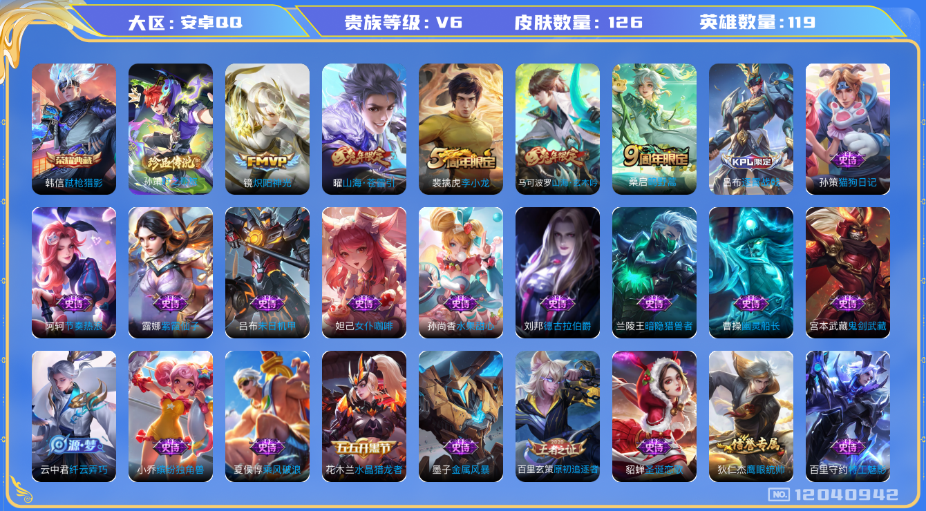 [12040942]【特价急出/详情看图】:安卓Q-V6-最强王者段位-119英雄-126皮肤-1典藏-1珍品传说-3传说-45史诗