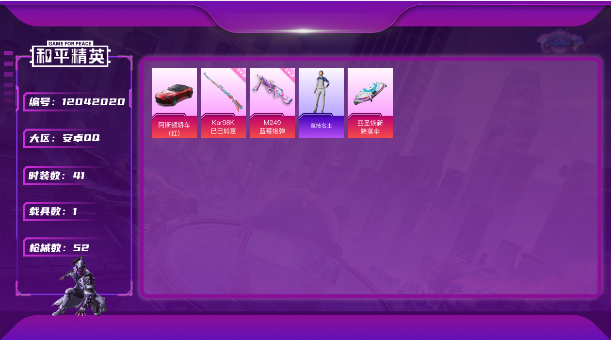 [12042020]【特价急出/详情看图】:安卓 手Q-2特效枪-1载具-1.6w热力值-1王牌印记-41套装-52枪皮【粉色载具】:阿斯顿马丁DBS(红)【粉色枪皮等级】:Kar98K-巳巳如意(五级),M249-蓝莓炮弹(三级)