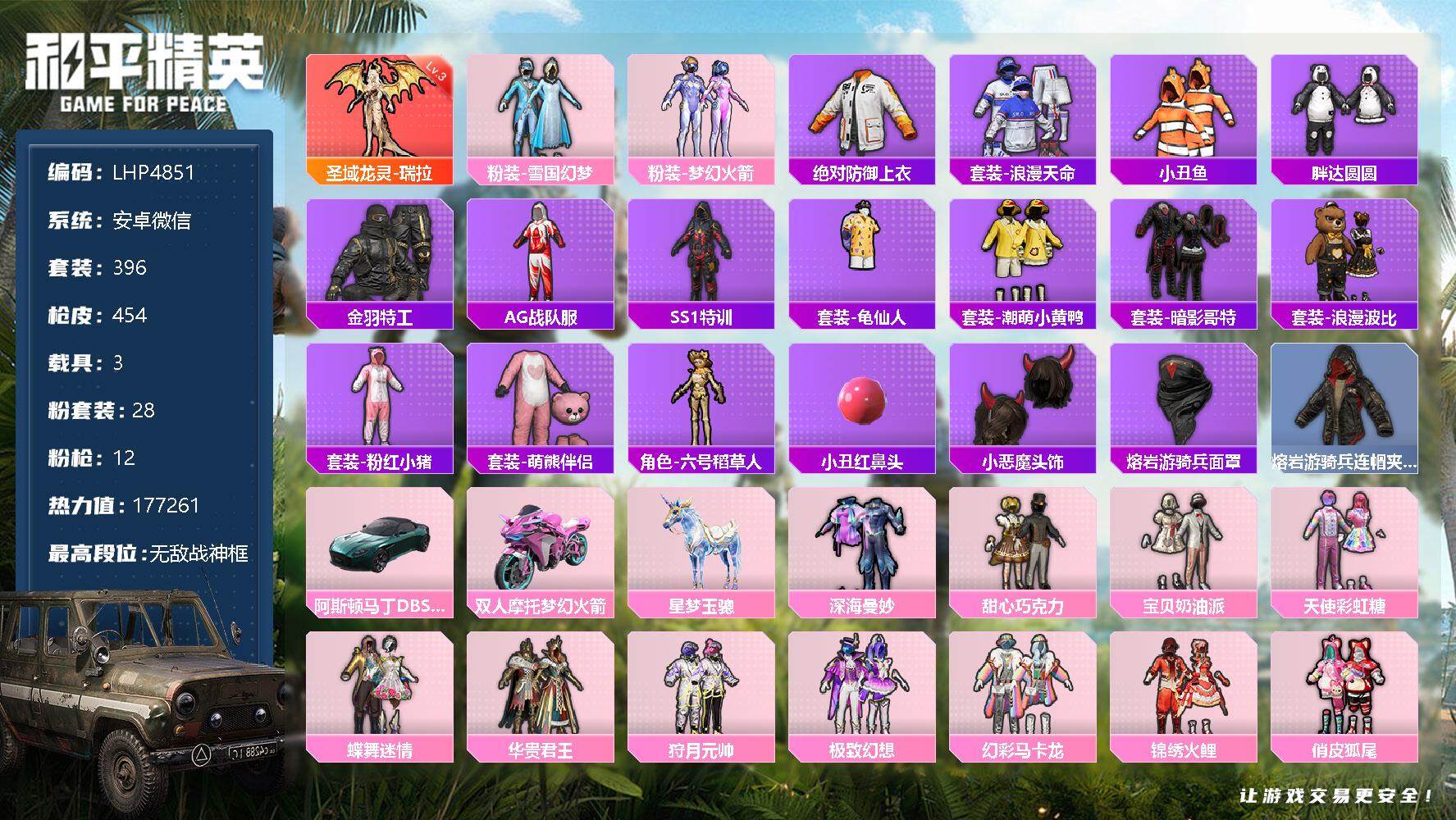 [12042581]素材身法号/无敌战神框2/绝世印记1【特价急出/详情看图】:安卓 微信-无敌战神框-1神装-28粉装-12特效枪-3载具-6粉色飞行器-17.7w热力值-27王牌印记-396套装-454枪皮【红色神装等级】:圣域龙灵-瑞拉(三级)【热门品类】:粉装-雪国幻梦,粉装-梦幻火箭,绝对防御上衣,套装-浪漫天命,套装-小丑鱼,套装-胖达圆圆,套装-金羽特工,套装-AG战队服,套装-SS1特训,套装-龟仙人,套装-潮萌小黄鸭,套装-暗影哥特,套装-浪漫波比,套装-粉红小猪,套装-萌熊伴侣,角色-六号稻草人,小丑红鼻头,小恶魔头饰,熔岩游骑兵面罩,熔岩游骑兵连帽夹克【粉色载具】:阿斯顿马丁DBS(绿),双人摩托-梦幻火箭,星梦玉骢【粉色套装】:粉装-深海曼妙,粉装-甜心巧克力,粉装-宝贝奶油派,粉装-天使彩虹糖,粉装-雪国幻梦,粉装-蝶舞迷情,粉装-梦幻火箭,粉装-华贵君王,粉装-狩月元帅,粉装-极致幻想,粉装-幻彩马卡龙,粉装-锦绣火鲤,粉装-俏皮狐尾,粉装-冰霜白皇,粉装-暗翼战神,粉装-王牌四分卫,粉装-蜜桃特工,粉装-山涧鹿灵,角色-洛天依,粉装-冰川粉黛,粉装-冰川幽秘,粉装-冰川红玫,粉装-第五大道,粉装-仲夏莫吉托,角色-电波星,角色-守护天翼,角色-初号机 觉醒Ver.,角色-羊梦糖心【粉色枪皮等级】:AKM-炫紫旋律(七级),M416-心之恋语(七级),M762-青锋波束(五级),UZI-绮梦青鸾(七级),UMP45-雪国精灵(七级),Kar98K-巳巳如意(五级),Kar98K-圣域龙灵(三级),Mk14-甜梦熊击(五级),M417-第五大道(七级),MK12-雪月幻音(七级),DP-28-豹影疾电(五级),MG-36-沧焰双生(五级)【粉色飞行器】:深海曼妙飞行器,梦幻火箭飞行器,心之恋语飞行翼,齐天大圣飞行器,星夜魔法师飞行翼,圣域金龙飞行器