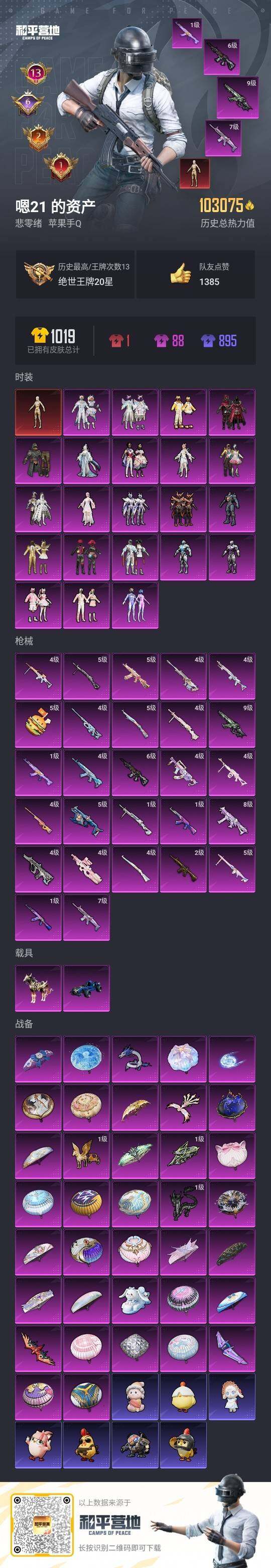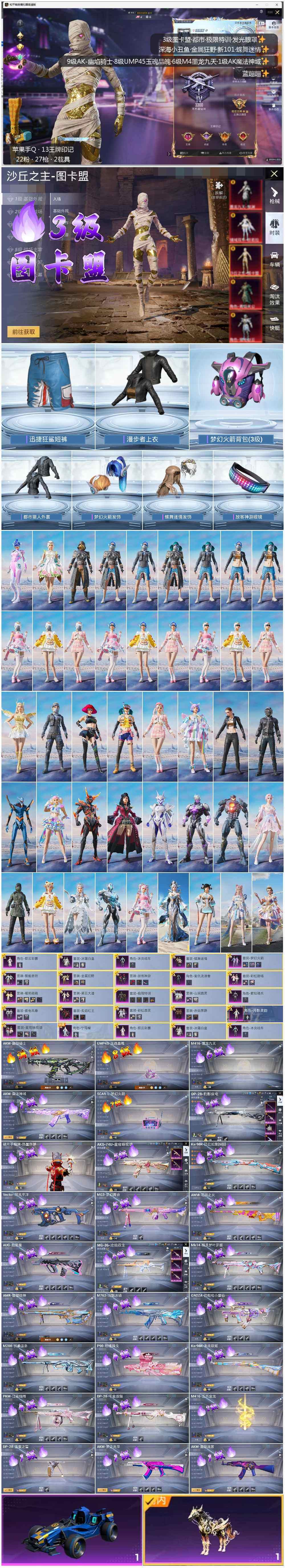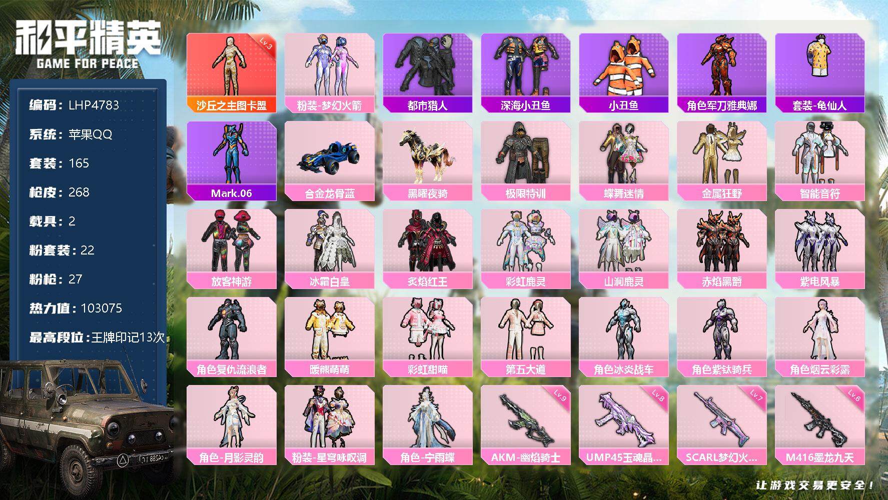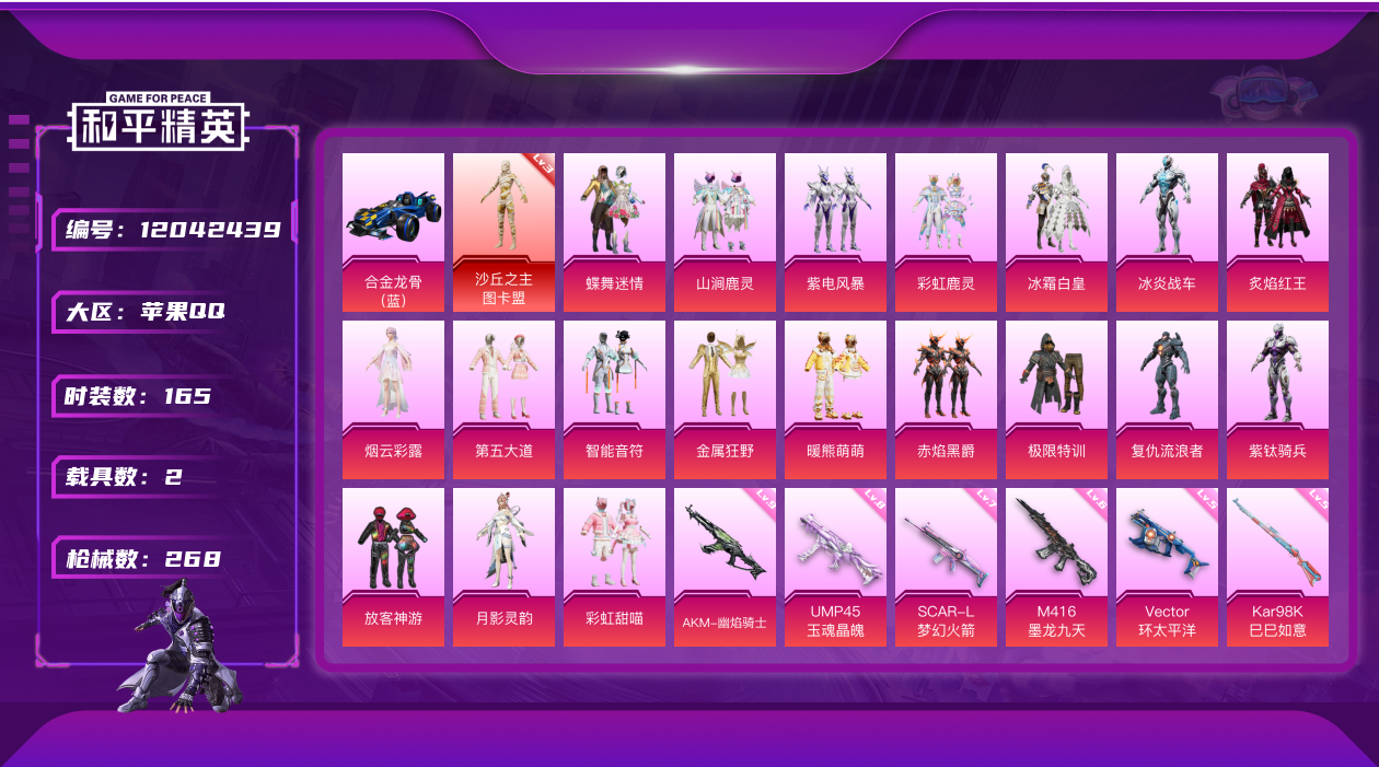 - PX_2106739- 苹果手Q-4王牌印记-有战神框-5粉装-8特效枪-3载具-30722热力值-56套装-80枪皮-1卓越印记-1传奇印记 【5粉装】,梦幻火箭,萨利娅,星梦奇缘,绚金战神,呆萌星弥 【8特效枪】AKM-魔法神域-3级 SCAR-L-甜梦小狐-4级 M416-电玩时刻-5级 M416-超新星-6级 M762-青锋波束-5级 Kar98K-巳巳如意-5级 M24-魔法神域-4级
