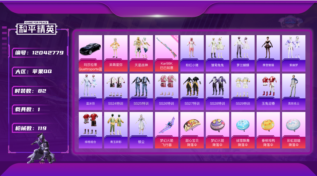 - [8895646]实名: 可修改 时装数: 143 枪械数: 29 战备数: 34 稀有枪皮: GROZA-镜光银凌,Kar98K-巳巳如意 亮点: 0粉装-2特效-0载具-热力值8591-总套装143-总枪皮29-王牌印记1-历史最高超级王牌3星--GROZA-镜光银凌(5级),Kar98K-巳巳如意(4级)--套装-蓝色运动,套装-竞技名士,套装-猛禽,套装-长空猛禽,套装-漫步者,套装-冷焰舞者,套装-甜蜜告白,套装-魅力单车,套装-绮丽涂鸦,套装-耀眼新星,套装-极地朋克,套装-幻世战舞者,套装-冰川特警,套装-麻辣教官,套装-战术大师,套装-耀粉歌者,套装-飞行日记,套装-SS20特训,套装-SS21特训,套装-萌趣咩咩,套装-娇憨猪猪,套装-玉兔迎春,套装-SS22特训,套装-SS23特训,套装-星途旅人,套装-鱼渊荷华,套装-智谋强哥,角色-海琴烟-玉兔迎春背包(3级),娇憨猪猪背包(3级),蝶变背包(3级),巳巳如意背包(3级), 竞技,安卓手Q-可二次-0粉装-2特效-0载具 -