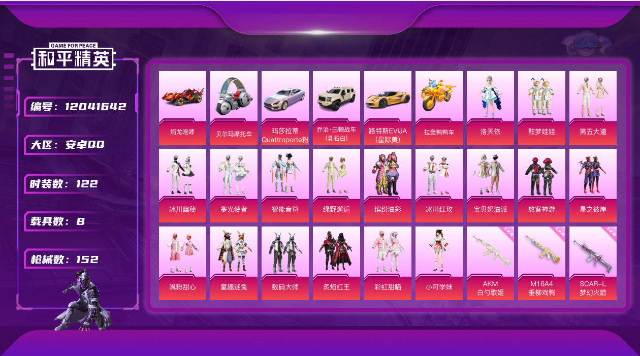 - PX_2079624- 苹果手Q-2王牌印记-7粉装-4特效枪-0载具-33577热力值-78套装-108枪皮-1卓越印记-0传奇印记 【7粉装】,宝贝奶油派,新星烈龙,幻彩电音,俏皮狐尾,冰川幽秘,彩装战姬,呆萌星弥 【4特效枪】AKM-绿萝繁花-5级 GROZA-焦糖拿铁-5级 Kar98K-巳巳如意-4级 PKM-天星战神-5级 【7稀有紫装】,Mark.06,8号机,暗影哥特,浪漫天命,