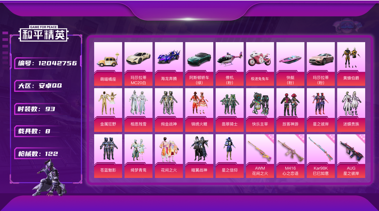 [12042756]素材身法号【特价急出/详情看图】:安卓 手Q-15粉装-10特效枪-8载具-10粉色飞行器-6.1w热力值-2王牌印记-93套装-122枪皮【粉色载具】:阿斯顿马丁DBS(绿),玛莎拉蒂MC20(星石白),玛莎拉蒂Ghibli(粉),海龙奔腾,萌喵橘座,极速兔兔车,空客H135-恋语之翼,快艇-塞莎KL27(霓虹粉)【粉色套装】:粉装-快乐主宰,粉装-星之信仰,粉装-金属狂野,粉装-放客神游,粉装-花间之火,粉装-锦绣火鲤,粉装-黄蜂伯爵,粉装-迷蝶贵族,粉装-苍蓝魅影,粉装-翡翠骑士,粉装-绚金战神,粉装-暗翼战神,粉装-绮梦青鸾,粉装-星之彼岸,粉装-相思残雪【粉色枪皮等级】:M416-心之恋语(五级),AUG-星之彼岸(四级),UZI-绮梦青鸾(二级),UMP45-相思残雪(三级),Kar98K-巳巳如意(五级),M24-星之信仰(二级),AWM-花间之火(七级),Mini14-荧光虫舞(二级),DP-28-豹影疾电(三级)【粉色飞行器】:花间之火飞行器,锦绣火鲤飞行器,荧光虫舞飞行器,激战未来飞行器,暗翼战神飞行器,绮梦青鸾飞行器,星之彼岸飞行器,相思残雪飞行器,翩跹演武飞行器