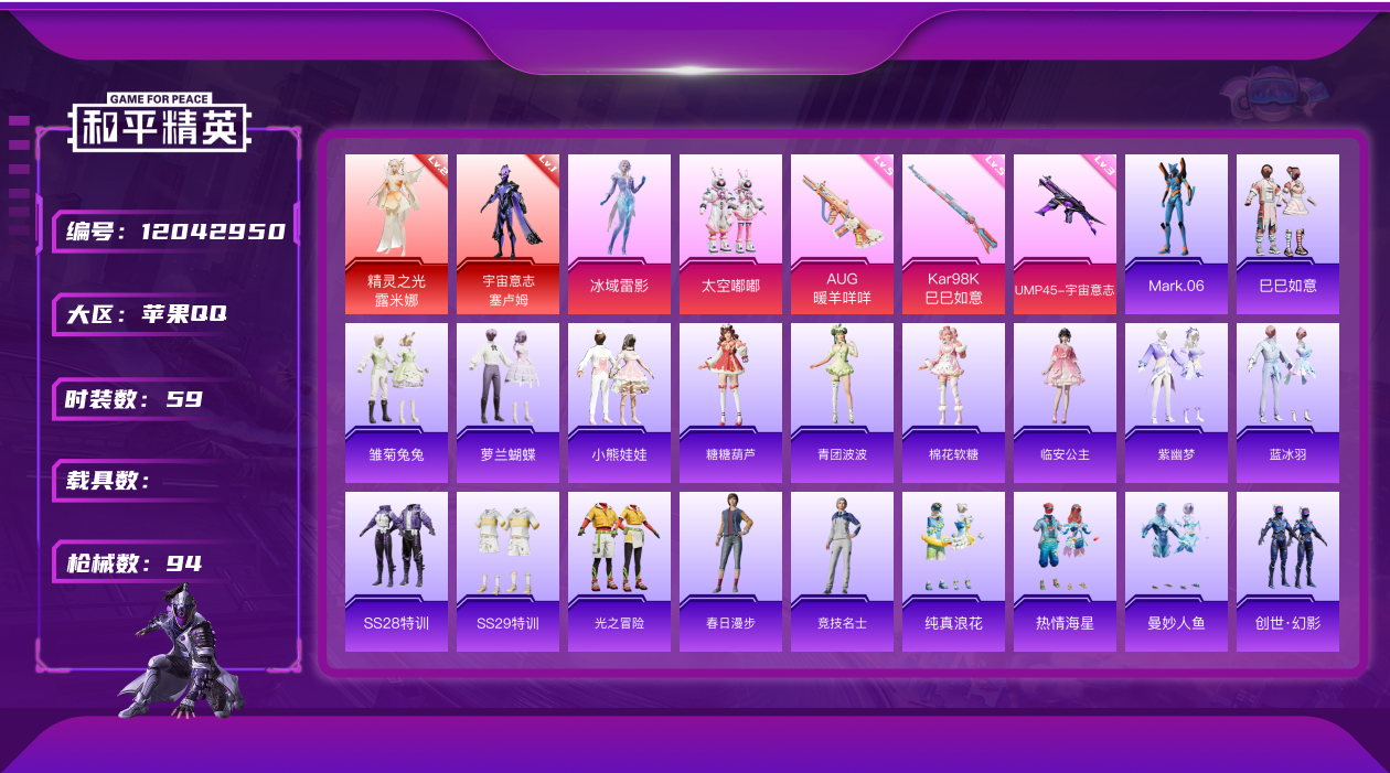 [12042950]素材身法号/老木乃伊/地铁满天赋【特价急出/详情看图】:苹果 手Q-2神装-3粉装-5特效枪-2粉色飞行器-3w热力值-5王牌印记-59套装-94枪皮【红色神装等级】:精灵之光-露米娜(二级),宇宙意志-塞卢姆(一级)【热门品类】:套装-冥河战士,角色-Mark.06【粉色套装】:粉装-太空嘟嘟,角色-冰域雷影,角色-羊梦糖心【粉色枪皮等级】:AUG-暖羊咩咩(五级),UMP45-宇宙意志(三级),Kar98K-巳巳如意(五级),Mk14-甜梦熊击(五级),DP-28-豹影疾电(四级)【粉色飞行器】:星夜魔法师飞行翼,深渊漩涡飞行器