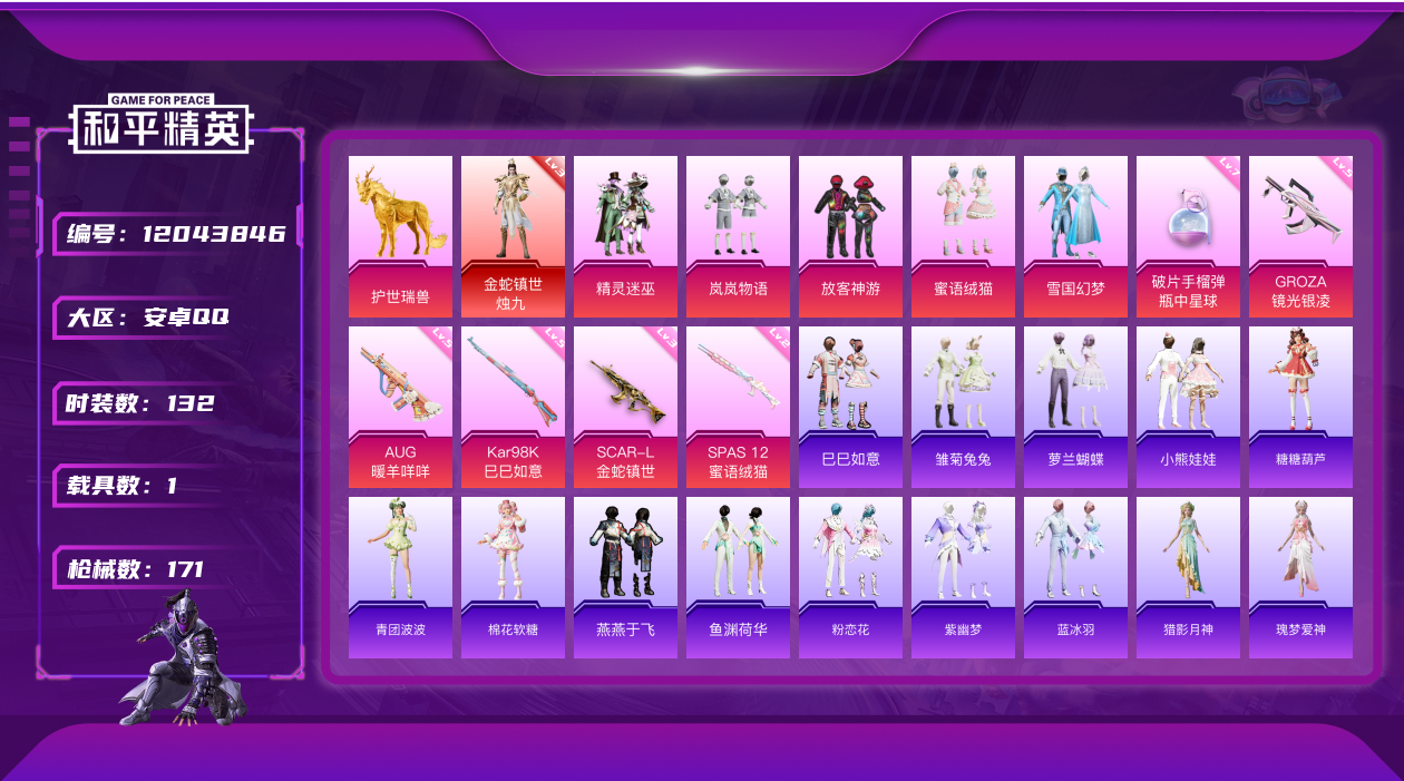 - [12171705]【商品标题】:MQ845-苹果 镜域双华-欧若拉(三级)手Q-1神装-9粉装-9特效枪-0载具-4粉色飞行器-41776热力值-3王牌印记-68套装-110枪皮 【红色神装等级】:镜域双华-欧若拉(三级) 【红色角色神装】:镜域双华-欧若拉 【热门品类】:角色-忠猛周仓,角色-忠真马岱,套装-龟仙人,大砍刀-青龙偃月刀,撬棍-龙胆亮银枪 【粉色套装】:粉装-星之信仰,角色-洛天依,粉装-炫光之旅,角色-小叽联名款,角色-烟云彩露,角色-美琪,角色-电波星,角色-女娲灵识,粉装-星穹咏叹调 【粉色枪皮等级】:SCAR-L-锦绣绵绵(五级),Kar98K-巳巳如意(五级),M24-镜域双华(三级),AWM-天使羽翼(五级),MK12-雪月幻音(一级),MG3-洛神天依(四级),PKM-江南烟雨(三级),烟雾弹-丁香清露(四级),破片手榴弹-瓶中星球(二级) 【粉色枪皮】:SCAR-L-锦绣绵绵,Kar98K-巳巳如意,M24-镜域双华,AWM-天使羽翼,MK12-雪月幻音,MG3-洛神天依,PKM-江南烟雨,烟雾弹-丁香清露,破片手榴弹-瓶中星球 【粉色飞行器】:春暖花开飞行器,镜域双华-灵镜之阶,绯果甜心飞行器 【粉色降落伞】:炎氏战神降落伞,未来歌姬降落伞,炫光之旅降落伞,超新星降落伞,龙行天下降落伞,圣堂之誓降落伞,小叽联名款降落伞,镜域双华降落伞,江南烟雨降落伞,巴啦啦小魔仙降落伞,精灵梦叶罗丽降落伞,月影灵韵降落伞,绯果甜心降落伞,喜羊羊与灰太狼降落伞 【稀有套装】:套装-龟仙人,套装-巳巳如意,套装-燕燕于飞,套装-鱼渊荷华,角色-海琴烟,套装-紫幽梦,套装-蓝冰羽,套装-云朵鹅,套装-雪绒豹,角色-乐音 【稀有枪皮】:AKM-2P战斗服款,AKM-星之信仰,AKM-江南烟雨,AKM-虎虎生威,AKM-霓虹街区,AKM-龙的传人,M16A4-天使羽翼,SCAR-L-红色方程式,M416-糯团青竹,M416-蓝色火焰,M762-云朵鹅,G36C-镜域双华,G36C-六号树人,AC-VAL-天降萌叽,AC-VAL-快闪甜心,AC-VAL-闲梦青缨,蜜獾-天降萌叽,Famas-镜域双华,UZI-啾咪啾咪,UZI-天降萌叽,UMP45-春暖花开,UMP45-炫光之旅,Vector-焰鹰斗篷,汤姆逊-天降萌叽,P90-快闪甜心,P90-巳巳如意,Kar98K-彩虹符
