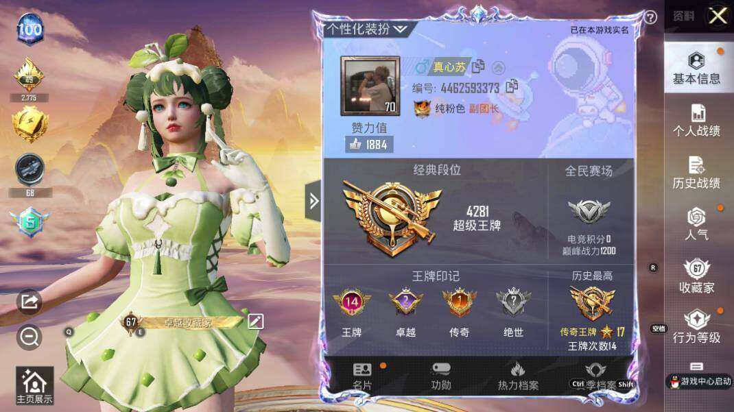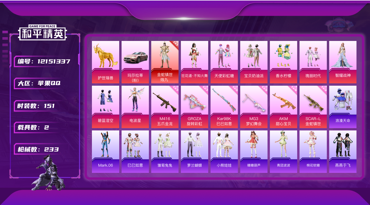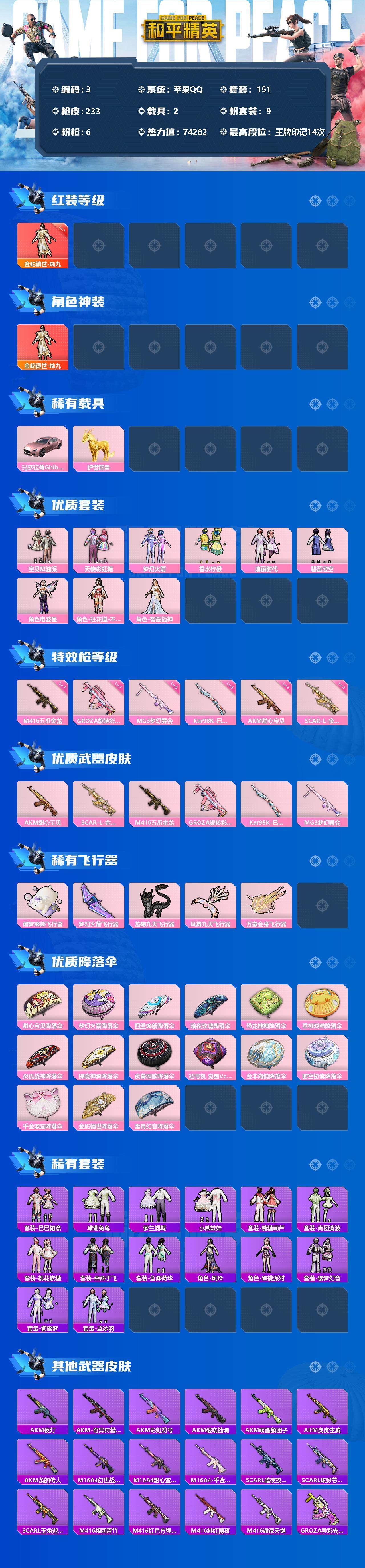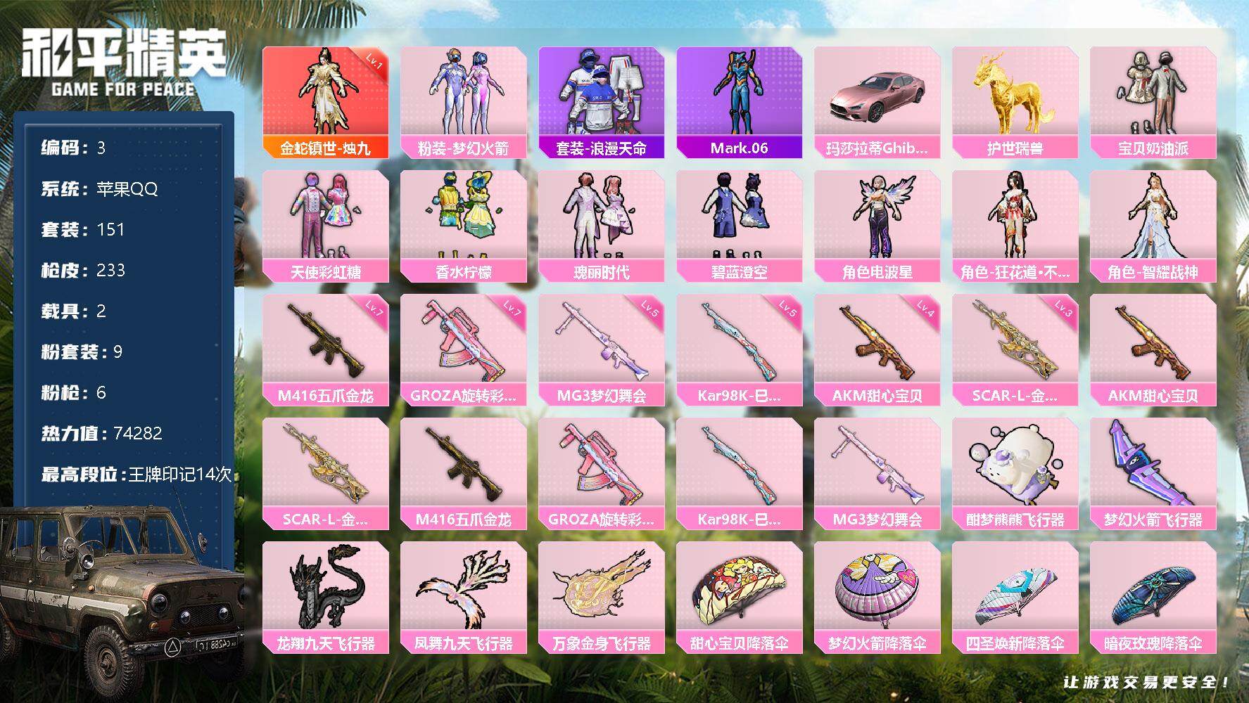 [12151337]【商品标题】:苹果 手Q-1神装-9粉装-6特效枪-2载具-5粉色飞行器-74282热力值-14王牌印记-151套装-233枪皮