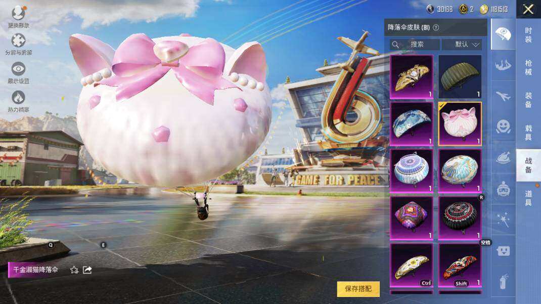 【粉色降落伞】:甜心宝贝降落伞,梦幻火箭降落伞,四圣焕新降落伞,暗夜玫瑰降落伞,恐龙拽拽降落伞,垂柳戏鸭降落伞,炎氏战神降落伞,拂晓神骑降落伞,夜幕颂歌降落伞,初号机 觉醒Ver.降落伞,金丰海韵降落伞,时空协奏降落伞,千金淑猫降落伞,金蛇镇世降落伞,雪月幻音降落伞