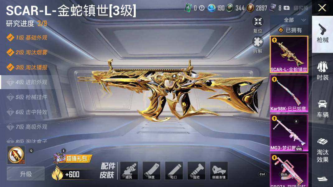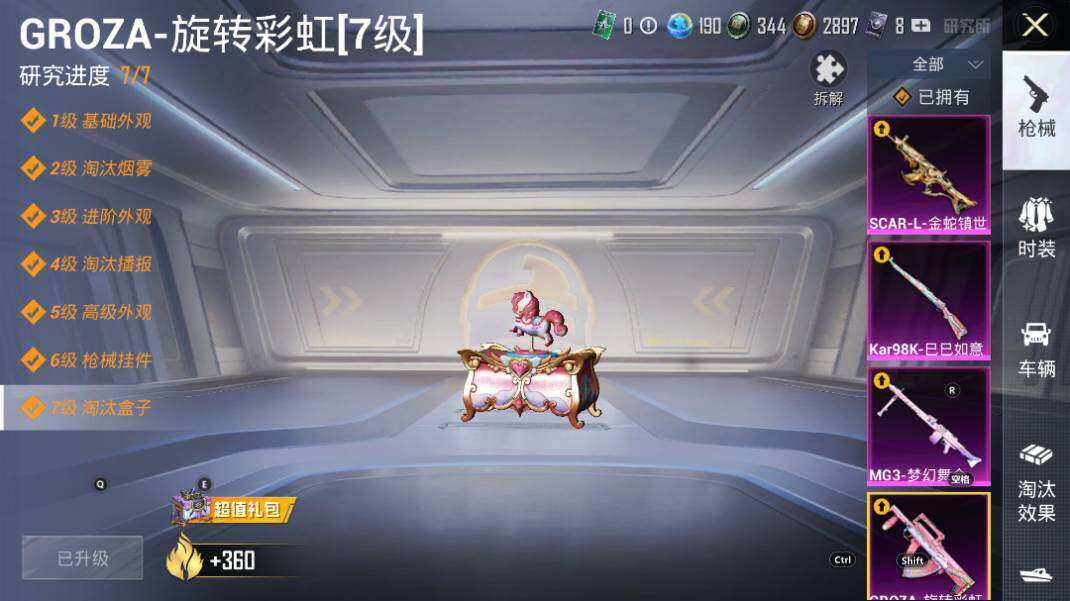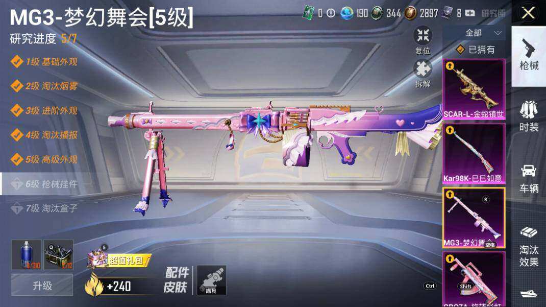 【粉色枪皮等级】:AKM-甜心宝贝(四级),SCAR-L-金蛇镇世(三级),M416-五爪金龙(七级),GROZA-旋转彩虹(七级),Kar98K-巳巳如意(五级),MG3-梦幻舞会(五级)