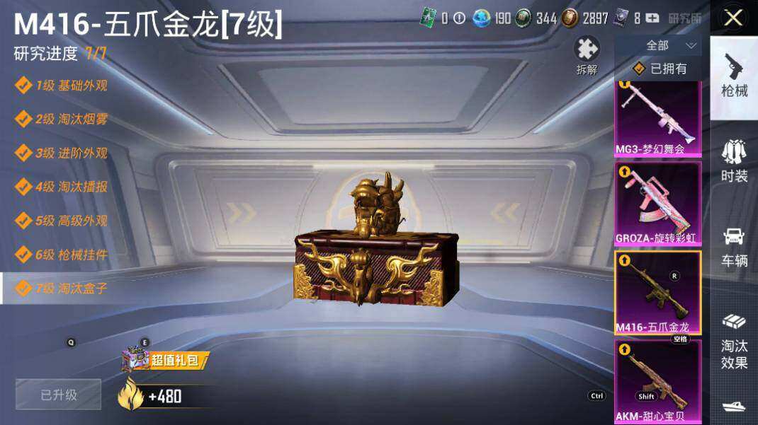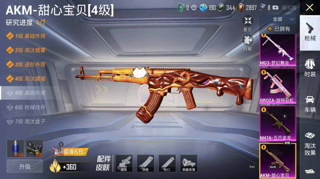 AKM-甜心宝贝,SCAR-L-金蛇镇世,M416-五爪金龙,GROZA-旋转彩虹,Kar98K-巳巳如意,MG3-梦幻舞会