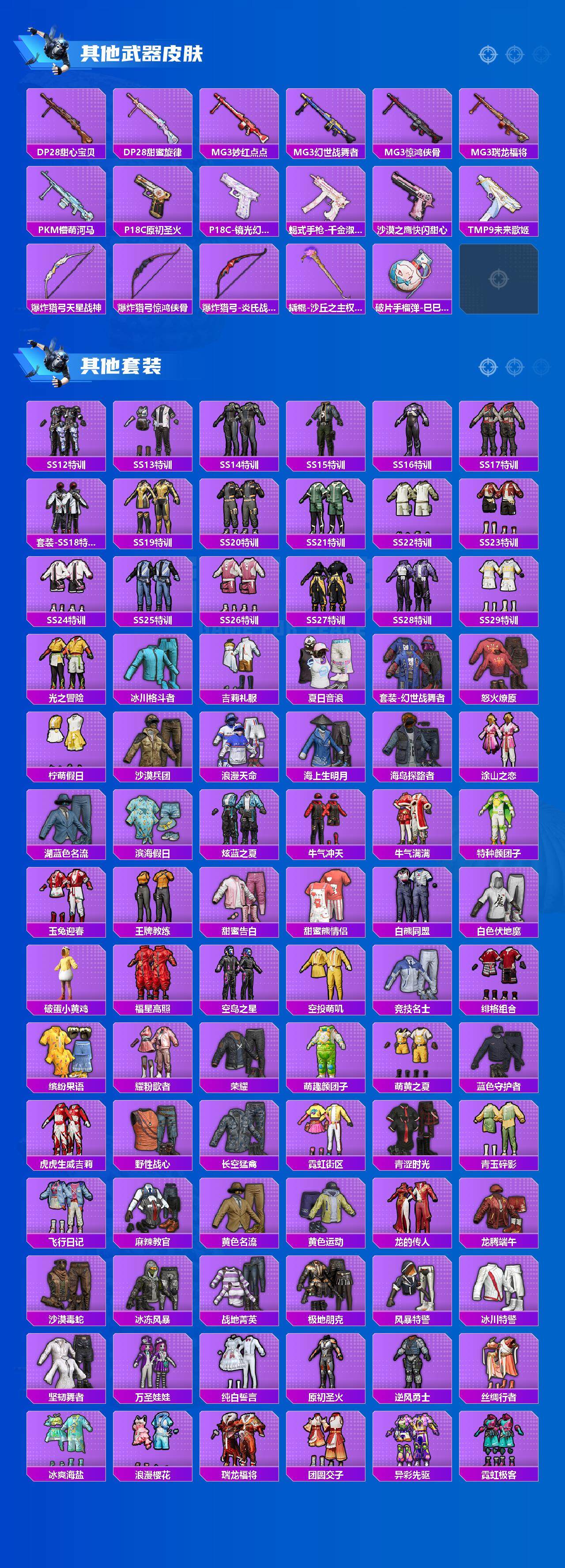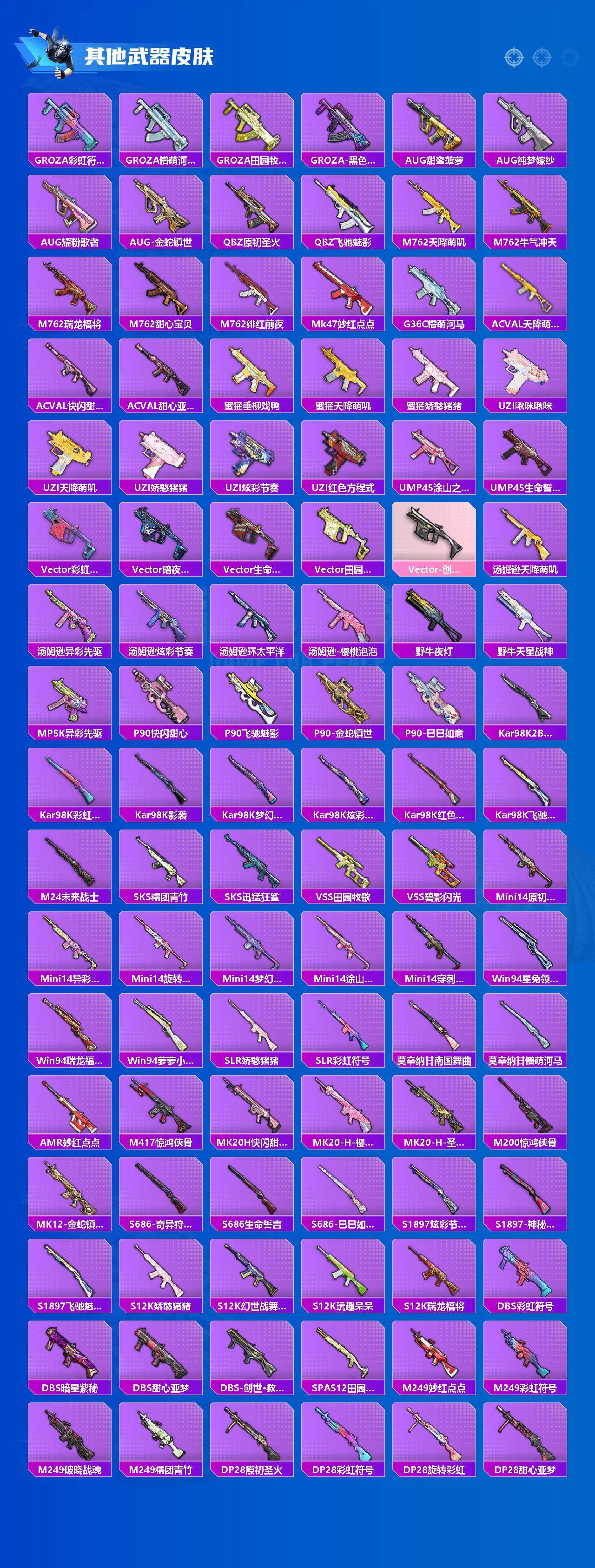 【稀有枪皮】:AKM-夜灯,AKM-奇异狩猎者,AKM-彩虹符号,AKM-破晓战魂,AKM-萌趣颜团子,AKM-虎虎生威,AKM-龙的传人,M16A4-幻世战舞者,M16A4-甜心亚梦,M16A4-千金淑猫,SCAR-L-暗夜玫瑰,SCAR-L-炫彩节奏,SCAR-L-玉兔迎春,M416-糯团青竹,M416-红色方程式,M416-绯红前夜,M416-诡夜天鹅,GROZA-异彩先驱,GROZA-彩虹符号,GROZA-懵萌河马,GROZA-田园牧歌,GROZA-黑色刀锋,AUG-甜蜜菠萝,AUG-纯梦嫁纱,AUG-耀粉歌者,AUG-金蛇镇世,QBZ-原初圣火,QBZ-飞驰魅影
