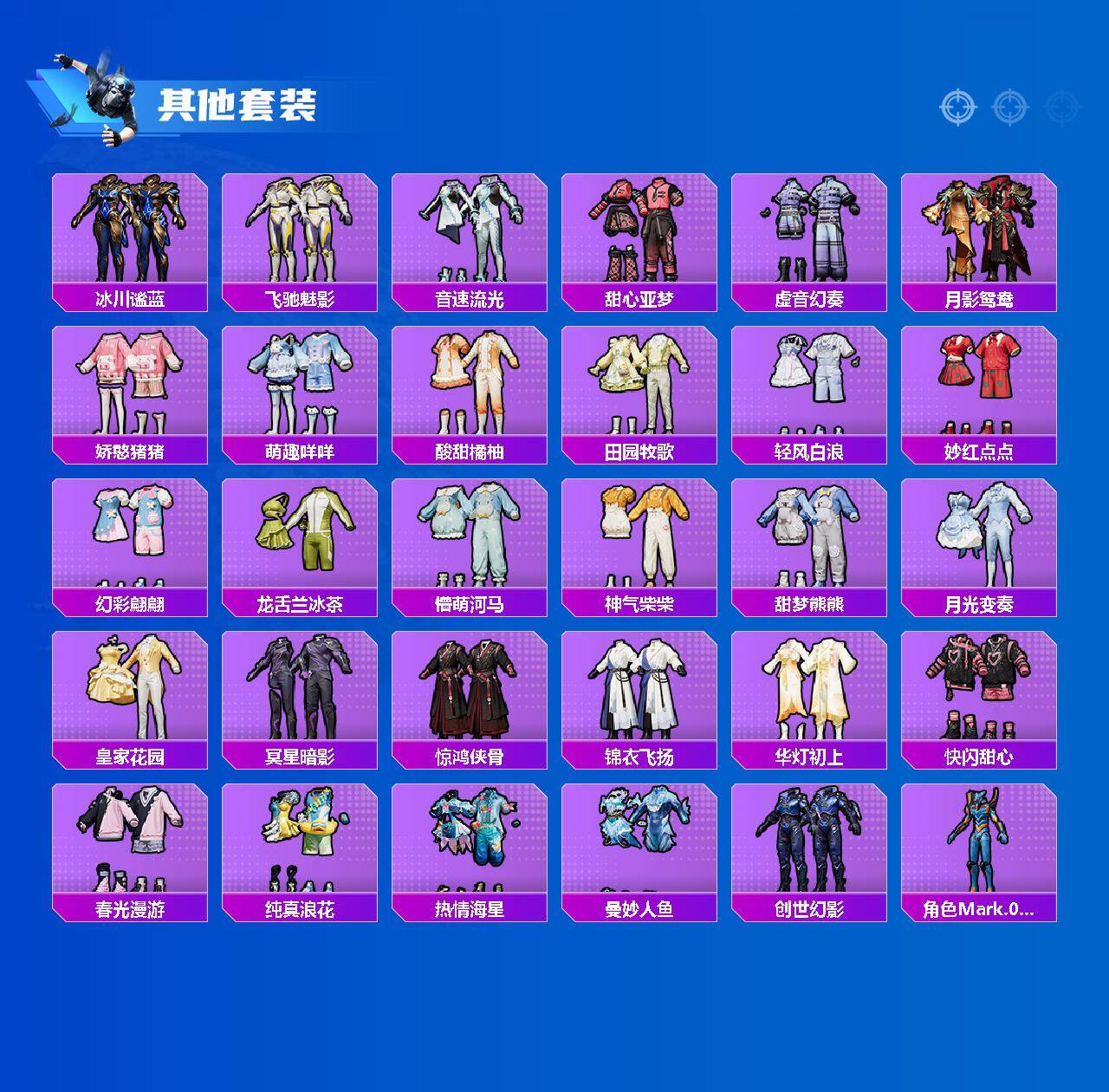 【粉色套装】:粉装-宝贝奶油派,粉装-天使彩虹糖,粉装-梦幻火箭,粉装-香水柠檬,粉装-瑰丽时代,粉装-碧蓝澄空,角色-电波星,角色-狂花道·不知火舞,角色-智耀战神