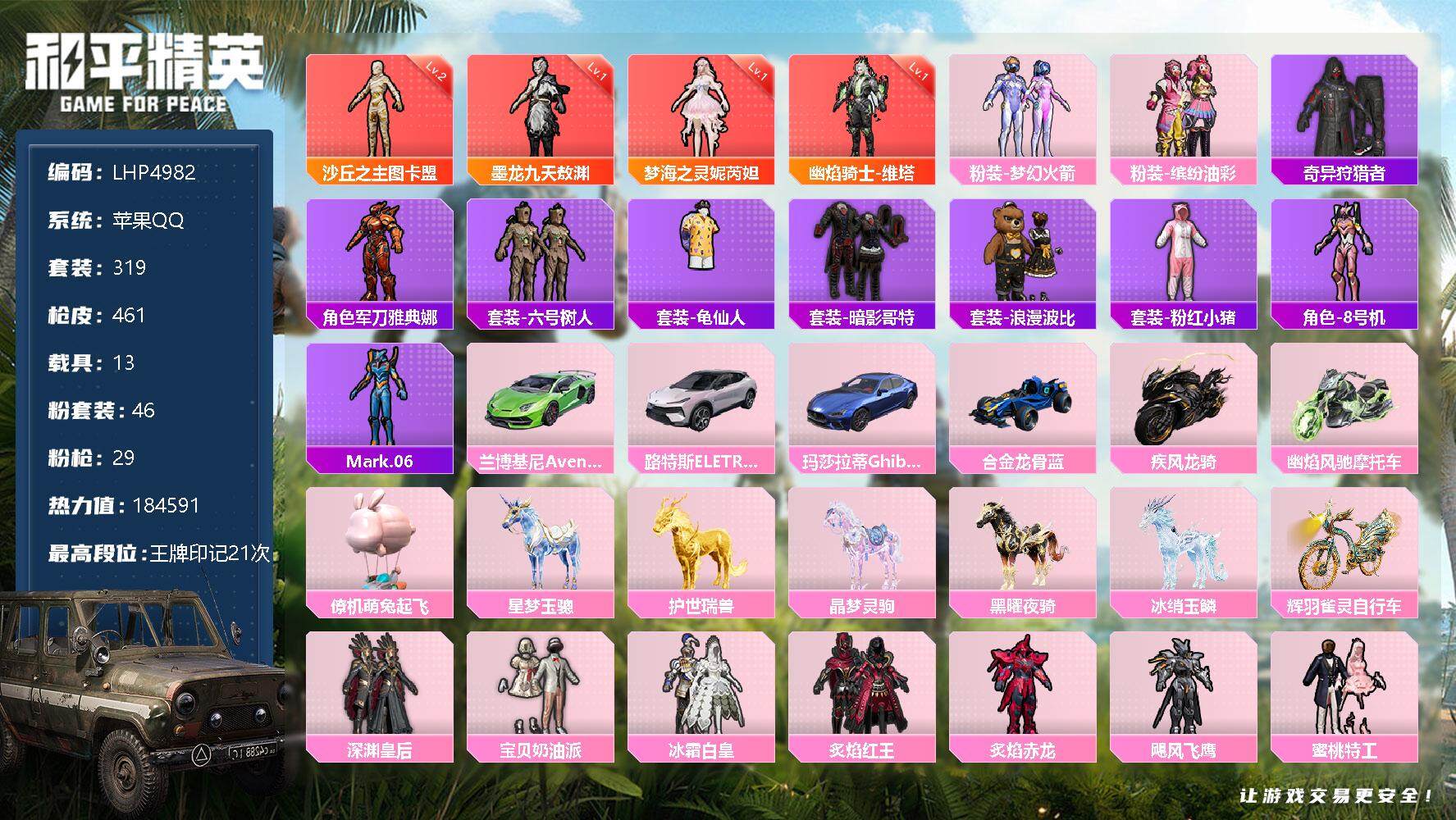 [12130079]素材身法号/绝世印记2/扭蛋碎片1100/璀璨碎片625【特价急出/详情看图】:苹果 手Q-4神装-46粉装-29特效枪-13载具-29粉色飞行器-18.4w热力值-21王牌印记-319套装-461枪皮【红色神装等级】:幽焰骑士-维塔(一级),梦海之灵-妮芮妲(一级),墨龙九天-敖渊(一级),沙丘之主-图卡盟(二级)【热门品类】:粉装-梦幻火箭,粉装-缤纷油彩,套装-奇异狩猎者,角色-军刀雅典娜,套装-六号树人,套装-龟仙人,套装-暗影哥特,套装-浪漫波比,套装-粉红小猪,角色-8号机,角色-Mark.06【粉色载具】:兰博基尼Aventador SVJ(翡翠绿),路特斯ELETRE(花绽灰),玛莎拉蒂Ghibli(蓝),合金龙骨(蓝),疾风龙骑,幽焰风驰摩托车,僚机-萌兔起飞,星梦玉骢,护世瑞兽,晶梦灵驹,黑曜夜骑,冰绡玉鳞,辉羽雀灵自行车【粉色套装】:粉装-深渊皇后,粉装-宝贝奶油派,粉装-梦幻火箭,粉装-缤纷油彩,粉装-冰霜白皇,粉装-炙焰红王,粉装-炙焰赤龙,粉装-飓风飞鹰,粉装-蜜桃特工,粉装-蝶舞蔷薇,粉装-彩虹鹿灵,粉装-山涧鹿灵,角色-洛天依,粉装-黄伞悠悠,粉装-黑伞漫漫,粉装-天之羽翼,粉装-薄荷物语,粉装-恐龙拽拽,粉装-绚丽摇曳,粉装-冷魅冰骑,粉装-赤焰黑爵,粉装-紫电风暴,粉装-甜梦小狐,粉装-星夜魔法师,角色-复仇流浪者,粉装-纯珍童话,角色-万古烈焰,角色-宙之时溯,角色-星云暗核,粉装-傲傲奶龙,角色-烟云彩露,角色-小蓝,角色-美琪,角色-超弦星,角色-鸢尾晶梦,角色-星梦奇缘,角色-千金淑猫,粉装-牡丹亭·游园,粉装-幻梦之森,角色-樱桃泡泡,角色-智耀战神,角色-幻海仙踪,角色-时光之吻,角色-狂魅哈莉,角色-冷漠罗丽,角色-羊梦糖心【粉色枪皮等级】:AKM-炫紫旋律(五级),AKM-梦之光华(五级),AKM-幽焰骑士(三级),SCAR-L-童趣迷兔(七级),SCAR-L-金蛇镇世(三级),M416-五爪金龙(七级),M416-心之恋语(四级),M416-风花雪月(五级),M416-电玩时刻(五级),M416-墨龙九天(三级),M416-灵猫魔法师(三级),GROZA-精灵之光(三级),AUG-许七安(四级),M762-激战未来(四级),UZI-筑梦精灵(四级),UMP45-量子极限(五级),AKS-74U-信仰神谕(四级)