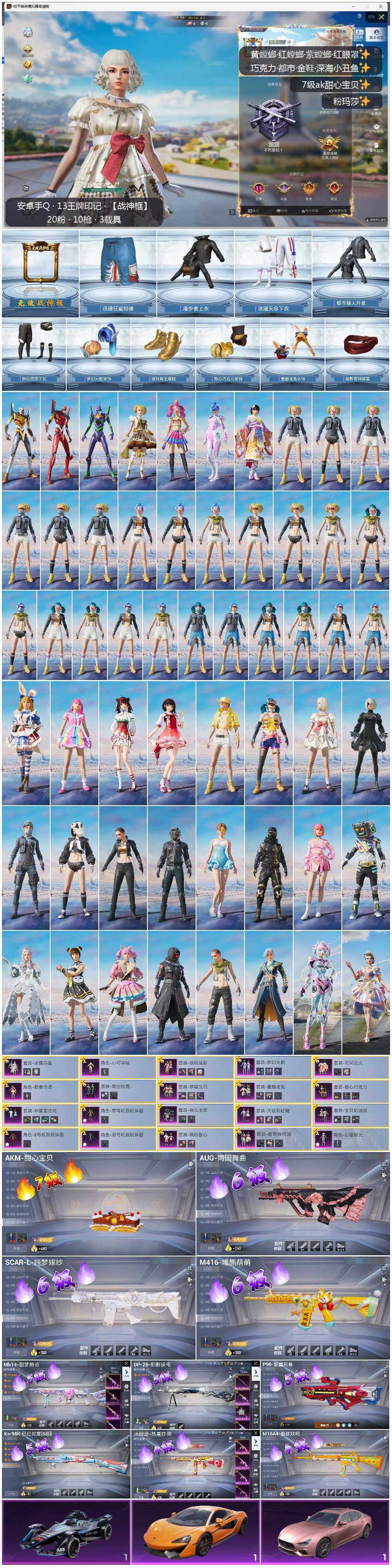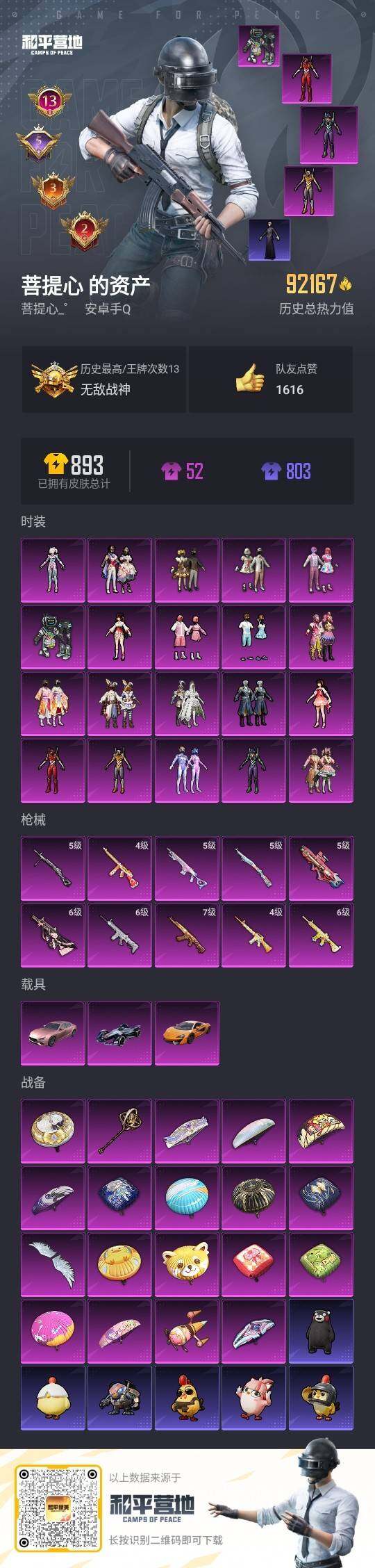 - PX_2066513- 苹果手Q-14王牌印记-13粉装-3特效枪-4载具-63053热力值-180套装-179枪皮-0卓越印记-0传奇印记 【13粉装】,初号机款机体服,新星烈龙,怪诞乔克,极致幻想,炙焰赤龙,飓风飞鹰,火曜朱雀,沙场疾风,俏雪含霜,赤焰黑爵,银刃赛罗,桀骜红莲,赛罗闪耀型 【3特效枪】AKM-星际浪客-5级 M416-心之恋语-7级 UMP45-雪国精灵-5级 【6稀有紫装】