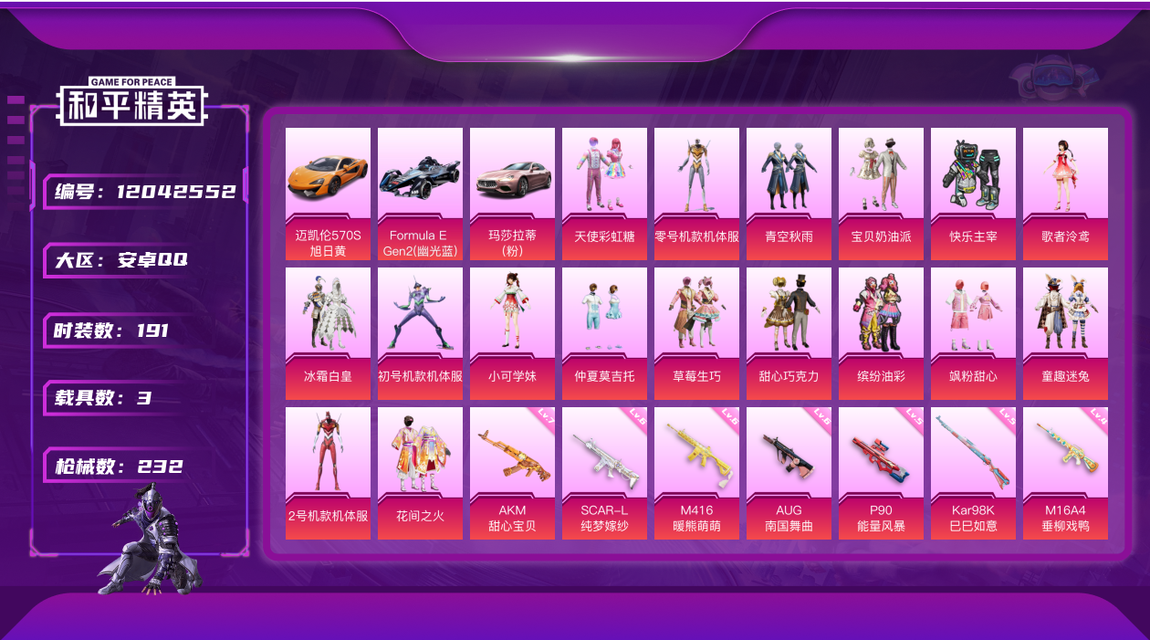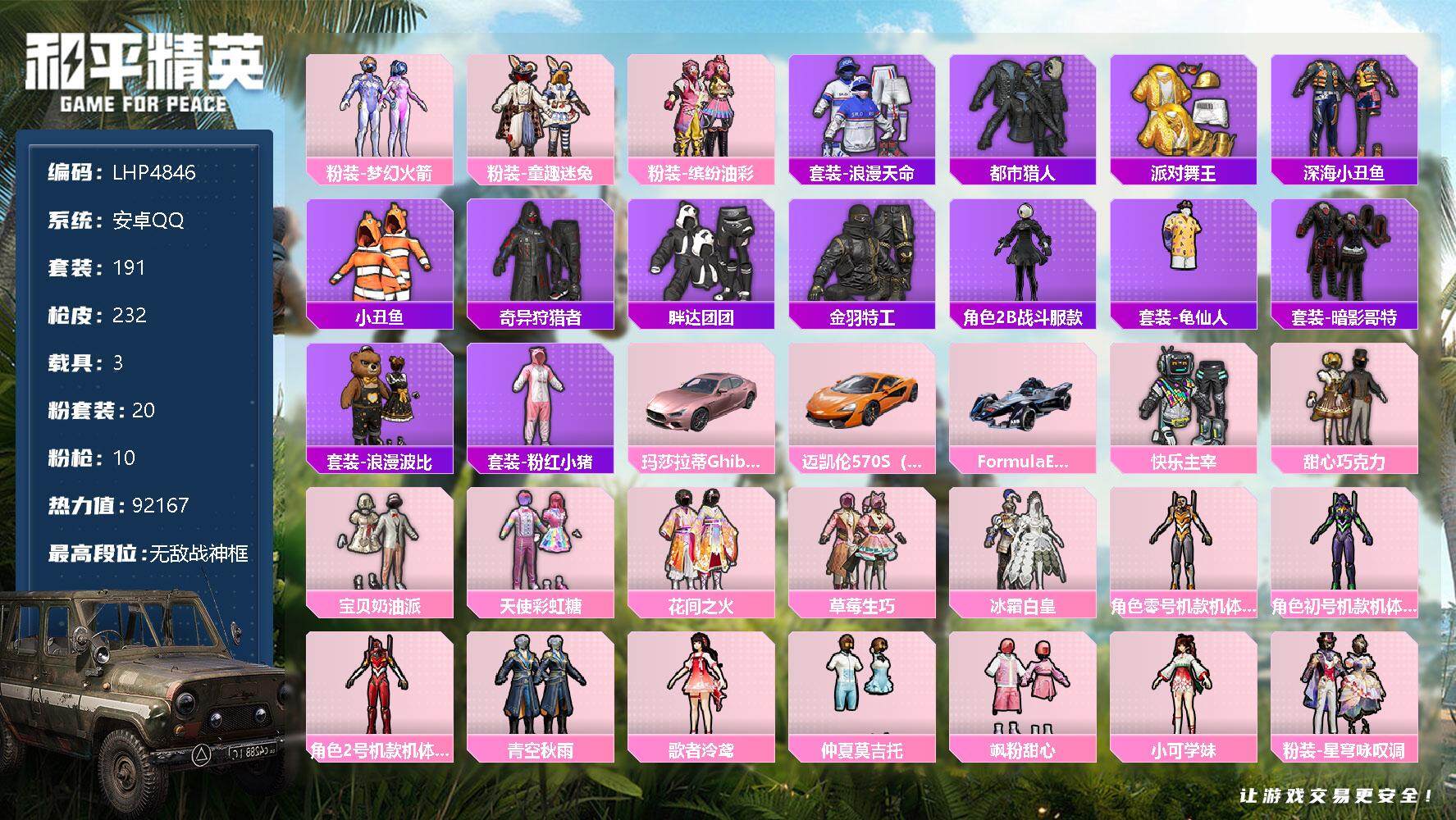 [12042552]素材身法号/无敌战神框1/绝世印记2/地铁满天赋【特价急出/详情看图】:安卓 手Q-无敌战神框-20粉装-10特效枪-3载具-3粉色飞行器-9.2w热力值-13王牌印记-191套装-232枪皮【热门品类】:粉装-梦幻火箭,粉装-童趣迷兔,粉装-缤纷油彩,套装-浪漫天命,套装-都市猎人,套装-派对舞王,套装-深海小丑鱼,套装-小丑鱼,套装-奇异狩猎者,套装-胖达团团,套装-金羽特工,角色-2B战斗服款,套装-龟仙人,套装-暗影哥特,套装-浪漫波比,套装-粉红小猪【粉色载具】:玛莎拉蒂Ghibli(粉),迈凯伦570S(旭日黄),Formula E Gen2(幽光蓝)【粉色套装】:粉装-快乐主宰,粉装-甜心巧克力,粉装-宝贝奶油派,粉装-天使彩虹糖,粉装-梦幻火箭,粉装-缤纷油彩,粉装-花间之火,粉装-草莓生巧,粉装-冰霜白皇,粉装-童趣迷兔,角色-零号机款机体服,角色-初号机款机体服,角色-2号机款机体服,粉装-青空秋雨,角色-歌者泠鸢,粉装-仲夏莫吉托,粉装-飒粉甜心,角色-小可学妹,粉装-星穹咏叹调【粉色枪皮等级】:AKM-甜心宝贝(七级),M16A4-垂柳戏鸭(四级),SCAR-L-纯梦嫁纱(六级),M416-暖熊萌萌(六级),AUG-南国舞曲(六级),汤姆逊-热量炸弹(四级),P90-能量风暴(五级),Kar98K-巳巳如意(五级),Mk14-甜梦熊击(五级),DP-28-豹影疾电(五级)【粉色飞行器】:夏日绵绵冰飞行器,相思残雪飞行器,时光之誓飞行器