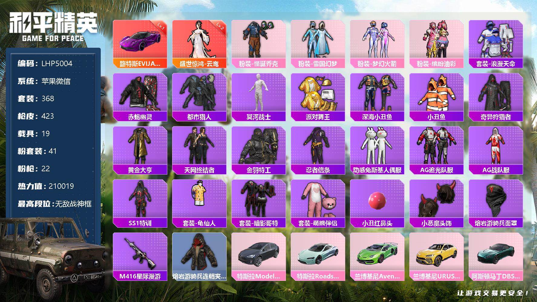 - PX_2111303-??莎 都市 假螳螂 双马尾 哥特 M416-至情至圣】苹果Q-YXc12722【可二次】【因赛季更新游戏段付以上号为准!】 4王牌印记 历史超级王牌11星 86套装 132枪皮 【1载具】 玛莎拉蒂Q蓝色 【3稀有】 AKM-百万伏特 都市猎人 浪漫天命 【4粉装】 宝贝奶油派 天使彩虹糖 仲夏莫吉托 冰霜白皇 【3特效枪】 Kar98K-巳巳如意 (5级) SCAR-L-