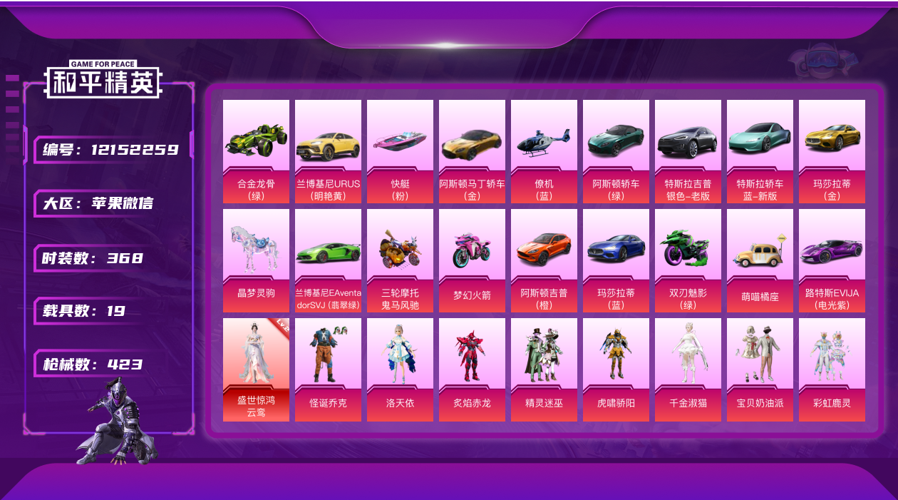 [12152259]素材身法号/老木乃伊/无敌战神框1/绝世印记2【特价急出/详情看图】:苹果 微信-无敌战神框-1神装-41粉装-22特效枪-19载具-17粉色飞行器-21w热力值-24王牌印记-368套装-423枪皮【红色载具】:路特斯EVIJA(电光紫)(一级)【红色神装等级】:盛世惊鸿-云鸾(二级)【热门品类】:粉装-怪诞乔克,粉装-雪国幻梦,粉装-梦幻火箭,粉装-缤纷油彩,套装-浪漫天命,套装-赤蝎幽灵,套装-都市猎人,套装-冥河战士,套装-派对舞王,套装-深海小丑鱼,套装-小丑鱼,套装-奇异狩猎者,套装-黄金大亨,套装-天网终结者,套装-金羽特工,套装-忍者信条,套装-动感兔斯基人偶服,套装-AG追光队服,套装-AG战队服,套装-SS1特训,套装-龟仙人,套装-暗影哥特,套装-萌熊伴侣,小丑红鼻头,小恶魔头饰,熔岩游骑兵面罩,M416-星际漫游,熔岩游骑兵连帽夹克【粉色载具】:特斯拉Model X(冷光银),特斯拉Roadster(水滴蓝),兰博基尼Aventador SVJ(翡翠绿),兰博基尼URUS(明艳黄),阿斯顿马丁DBS(绿),阿斯顿马丁DBS(金),阿斯顿马丁DBX(橙),路特斯EVIJA(电光紫),玛莎拉蒂Ghibli(金),玛莎拉蒂Ghibli(蓝),合金龙骨(绿),萌喵橘座,双人摩托-梦幻火箭,双人摩托-双刃魅影(绿),鬼马风驰,空客H135-蔚蓝之翼,快艇-塞莎KL27(霓虹粉),晶梦灵驹【粉色套装】:粉装-深海曼妙,粉装-幻影战神,粉装-数码大师,粉装-怪诞乔克,粉装-深渊皇后,粉装-甜心巧克力,粉装-宝贝奶油派,粉装-天使彩虹糖,粉装-雪国幻梦,粉装-蝶舞迷情,粉装-精灵迷巫,粉装-梦幻火箭,粉装-星之信仰,粉装-金风玉露,粉装-金属狂野,粉装-缤纷油彩,粉装-新星烈龙,粉装-向日葵,粉装-幻彩马卡龙,粉装-花间之火,粉装-俏皮狐尾,粉装-苍蓝魅影,粉装-冰霜白皇,粉装-炙焰红王,粉装-香水柠檬,粉装-相思残雪,粉装-虎啸骄阳,粉装-炙焰赤龙,粉装-飓风飞鹰,粉装-蜜桃特工,粉装-铁血龙王,角色-赛罗闪耀型,粉装-彩虹鹿灵,粉装-山涧鹿灵,角色-洛天依,粉装-海渊国主,角色-零号机款机体服,粉装-薄荷物语,粉装-妙趣可丽,角色-烟云彩露,角色-千金淑猫 【粉色枪皮等级】:AKM-甜心宝贝(七级),SCAR-L-梦幻火箭(三级),SCAR-L-童趣迷