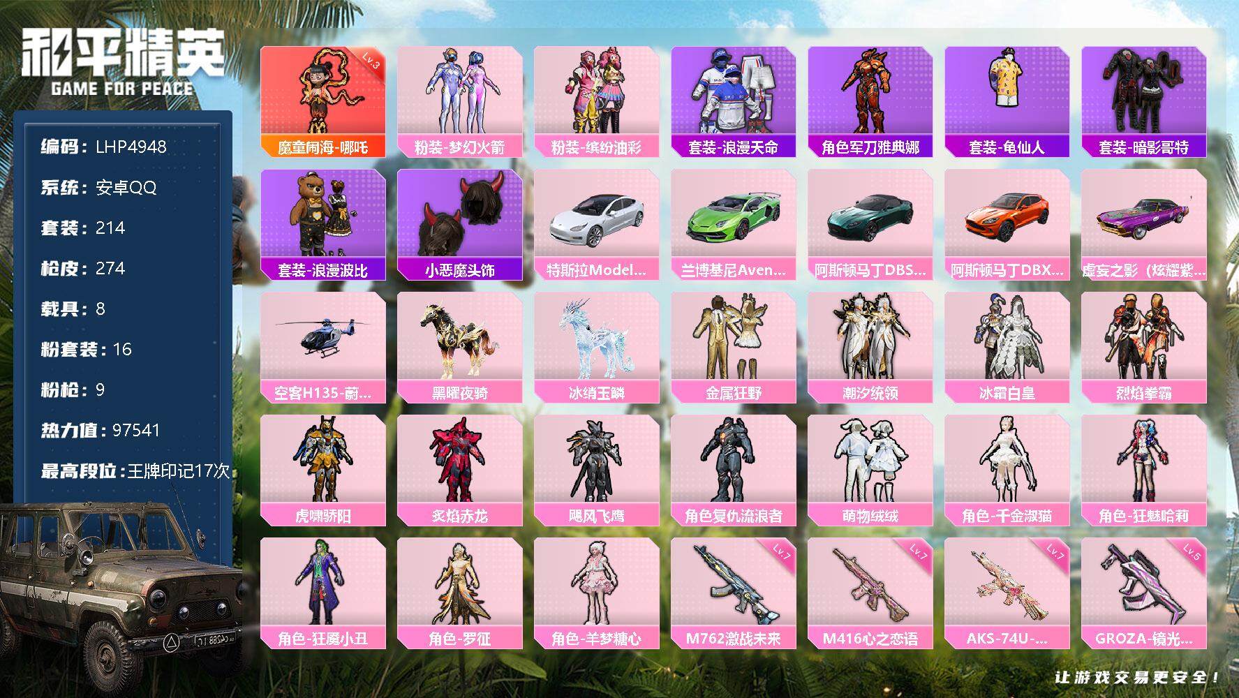 [12101840]素材身法号/绝世印记1/璀璨碎片1410【特价急出/详情看图】:安卓 手Q-1神装-16粉装-9特效枪-8载具-4粉色飞行器-9.7w热力值-17王牌印记-214套装-274枪皮【红色神装等级】:魔童闹海-哪吒(三级)【热门品类】:粉装-梦幻火箭,粉装-缤纷油彩,套装-浪漫天命,角色-军刀雅典娜,套装-龟仙人,套装-暗影哥特,套装-浪漫波比,小恶魔头饰【粉色载具】:特斯拉Model 3(珍珠白),兰博基尼Aventador SVJ(翡翠绿),阿斯顿马丁DBS(绿),阿斯顿马丁DBX(橙),虚妄之影(炫耀紫),空客H135-蔚蓝之翼,黑曜夜骑,冰绡玉鳞【粉色套装】:粉装-梦幻火箭,粉装-金属狂野,粉装-缤纷油彩,粉装-潮汐统领,粉装-冰霜白皇,粉装-烈焰拳霸,粉装-虎啸骄阳,粉装-炙焰赤龙,粉装-飓风飞鹰,角色-复仇流浪者,粉装-萌物绒绒,角色-千金淑猫,角色-狂魅哈莉,角色-狂魇小丑,角色-罗征,角色-羊梦糖心【粉色枪皮等级】:M416-心之恋语(七级),GROZA-镜光银凌(五级),M762-激战未来(七级),AKS-74U-星穹咏叹调(七级),P90-魔童闹海 敖丙(三级),Kar98K-巳巳如意(五级),Mk14-甜梦熊击(五级),DP-28-豹影疾电(五级),MG3-洛神天依(一级)【粉色飞行器】:心之恋语飞行翼,灵猫魔法师飞行器,灵珠游龙飞行器