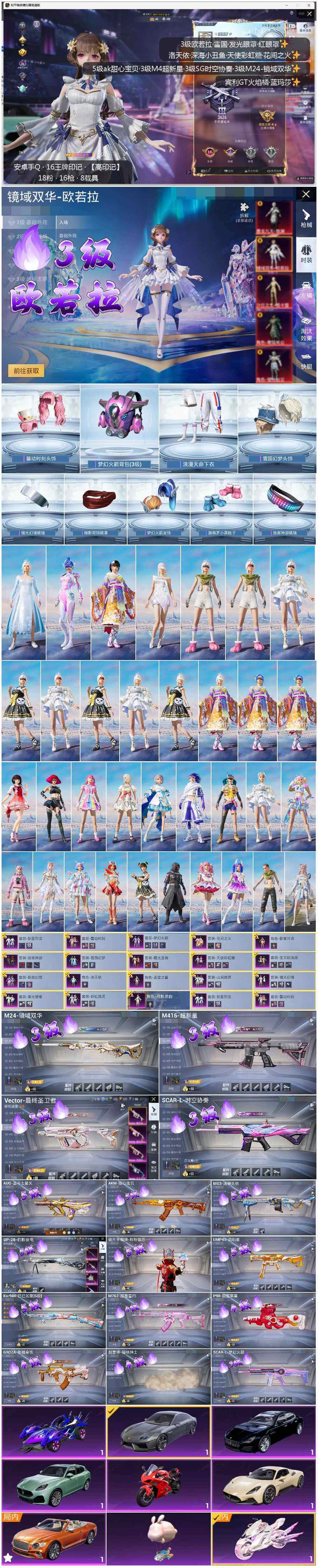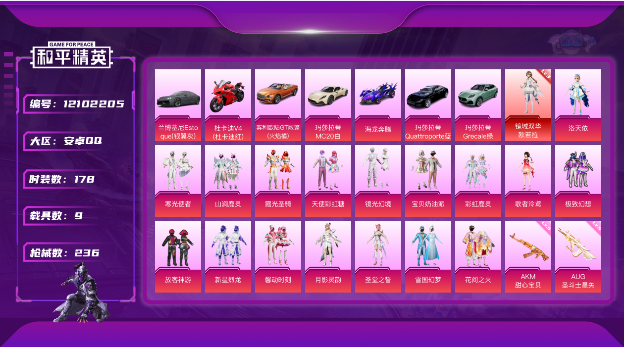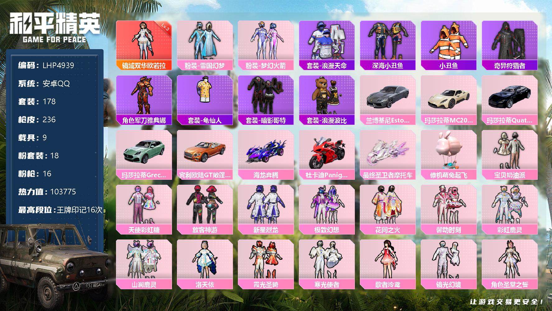 [12102205]素材身法号/地铁满天赋【特价急出/详情看图】:安卓 手Q-1神装-18粉装-16特效枪-9载具-8粉色飞行器-10.3w热力值-16王牌印记-178套装-236枪皮【红色神装等级】:镜域双华-欧若拉(三级)【热门品类】:粉装-雪国幻梦,粉装-梦幻火箭,套装-浪漫天命,套装-深海小丑鱼,套装-小丑鱼,套装-奇异狩猎者,角色-军刀雅典娜,套装-龟仙人,套装-暗影哥特,套装-浪漫波比【粉色载具】:兰博基尼Estoque(银翼灰),玛莎拉蒂MC20(星石白),玛莎拉蒂Quattroporte(夜幕蓝),玛莎拉蒂Grecale(薄荷绿),宾利欧陆GT敞篷(火焰橘),海龙奔腾,杜卡迪 Panigale V4(杜卡迪红),最终圣卫者摩托车,僚机-萌兔起飞【粉色套装】:粉装-宝贝奶油派,粉装-天使彩虹糖,粉装-雪国幻梦,粉装-梦幻火箭,粉装-放客神游,粉装-新星烈龙,粉装-极致幻想,粉装-花间之火,粉装-馨动时刻,粉装-彩虹鹿灵,粉装-山涧鹿灵,角色-洛天依,粉装-霞光圣骑,粉装-寒光使者,角色-歌者泠鸢,粉装-镜光幻境,角色-圣堂之誓,角色-月影灵韵【粉色枪皮等级】:AKM-甜心宝贝(五级),SCAR-L-梦幻火箭(三级),SCAR-L-时空协奏(三级),M416-超新星(三级),GROZA-焦糖拿铁(四级),AUG-圣斗士星矢(五级),M762-甜蜜誓约(四级),UMP45-启明星(五级),Vector-最终圣卫者(三级),P90-甜蜜草莓(四级),Kar98K-巳巳如意(五级),M24-镜域双华(三级),DP-28-豹影疾电(五级),MG3-洛神天依(五级)【粉色飞行器】:梦幻火箭飞行器,齐天大圣飞行器,歌者泠鸢飞行器,梦幻舞会飞行器,超新星飞行器,镜光幻境飞行翼,镜域双华-灵镜之阶,终晖之翼飞行器