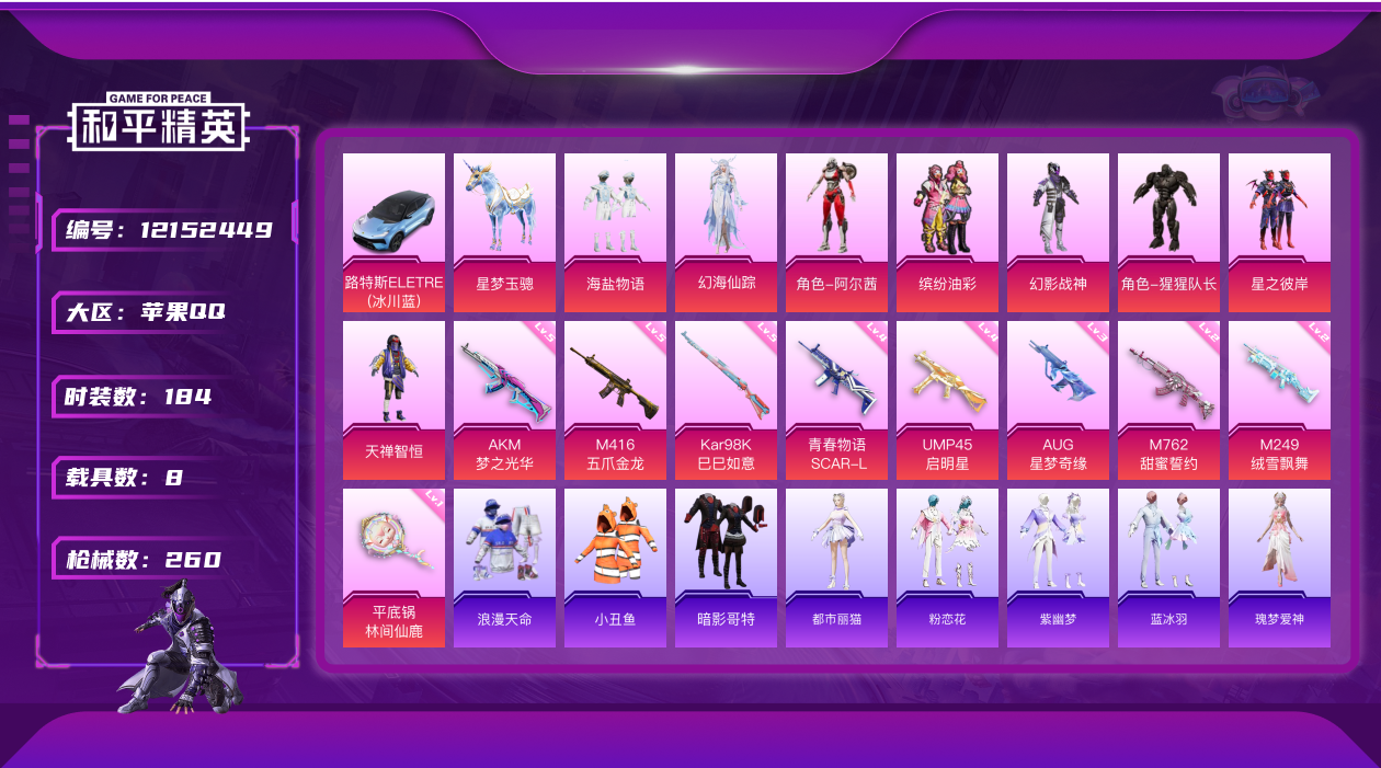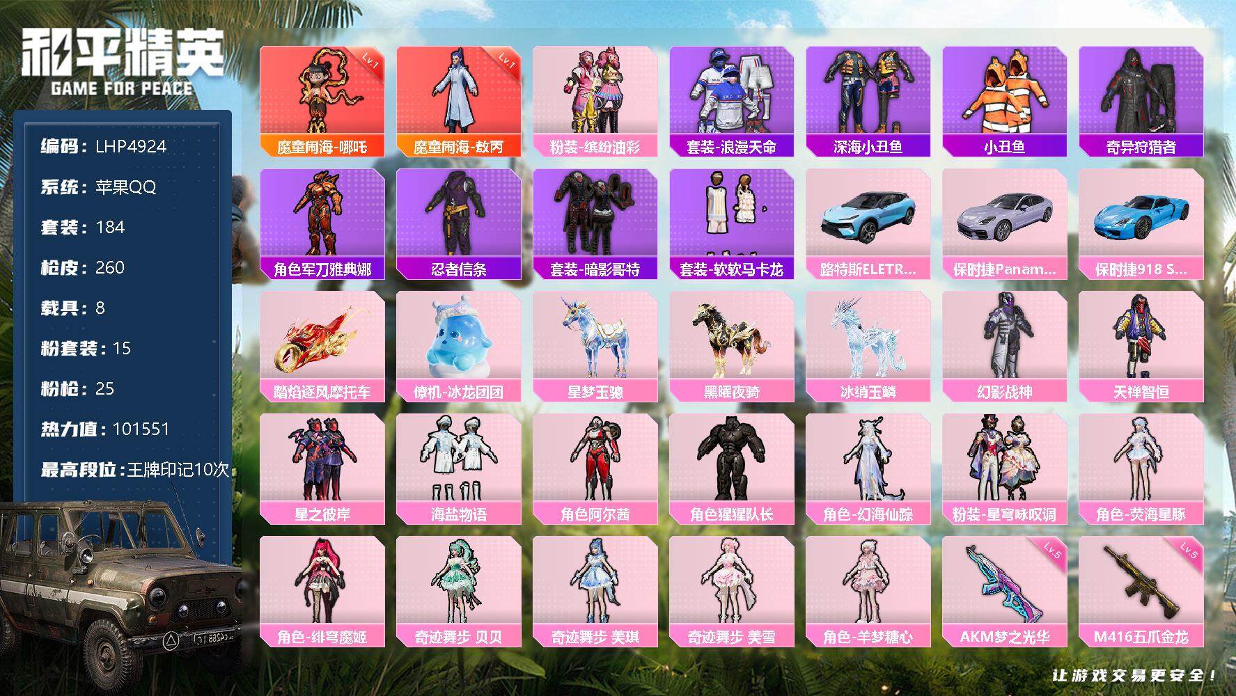 [12152449]素材身法号【特价急出/详情看图】:苹果 手Q-2神装-15粉装-25特效枪-8载具-8粉色飞行器-10.1w热力值-10王牌印记-184套装-260枪皮【红色神装等级】:魔童闹海-敖丙(一级),魔童闹海-哪吒(一级)【热门品类】:粉装-缤纷油彩,套装-浪漫天命,套装-深海小丑鱼,套装-小丑鱼,套装-奇异狩猎者,角色-军刀雅典娜,套装-忍者信条,套装-暗影哥特,套装-软软马卡龙【粉色载具】:路特斯ELETRE(冰川蓝),保时捷Panamera(星辰紫),保时捷918 Spyder(沉静蓝),踏焰逐风摩托车,僚机-冰龙团团,星梦玉骢,黑曜夜骑,冰绡玉鳞【粉色套装】:粉装-幻影战神,粉装-缤纷油彩,粉装-天禅智恒,粉装-星之彼岸,粉装-海盐物语,角色-阿尔茜,角色-猩猩队长,角色-幻海仙踪,粉装-星穹咏叹调,角色-荧海星豚,角色-绯穹魔姬,角色-奇迹舞步 贝贝,角色-奇迹舞步 美琪,角色-奇迹舞步 美雪,角色-羊梦糖心【粉色枪皮等级】:AKM-梦之光华(五级),SCAR-L-青春物语(四级),SCAR-L-魔童闹海 哪吒(三级),M416-五爪金龙(五级),M416-灵猫魔法师(三级),GROZA-无垠阁(二级),AUG-星梦奇缘(三级),M762-甜蜜誓约(二级),蜜獾-荧海星豚(三级),ARX-无垠阁(一级),UMP45-启明星(四级),Vector-最终圣卫者(三级),汤姆逊-热量炸弹(五级),AKS-74U-无垠阁(三级),JS9-奇迹舞步(二级),P90-魔童闹海 敖丙(三级),Kar98K-巳巳如意(五级),Mk14-甜梦熊击(五级),M249-绒雪飘舞(二级),DP-28-豹影疾电(五级),MG-36-沧焰双生(四级),平底锅-林间仙鹿(一级),平底锅-喜羊羊与灰太狼(一级)【粉色飞行器】:青春物语飞行器,星夜魔法师飞行翼,千面幻镜飞行器,终晖之翼飞行器,灵猫魔法师飞行器,飞天猪飞行器,灵珠游龙飞行器