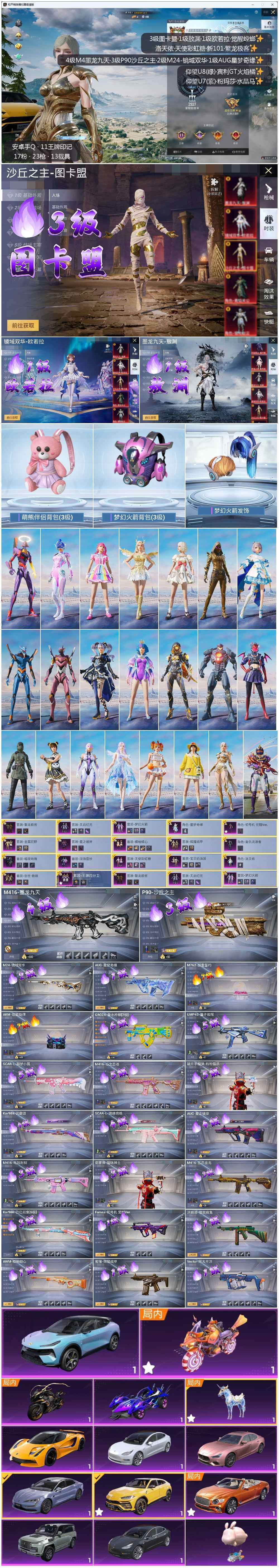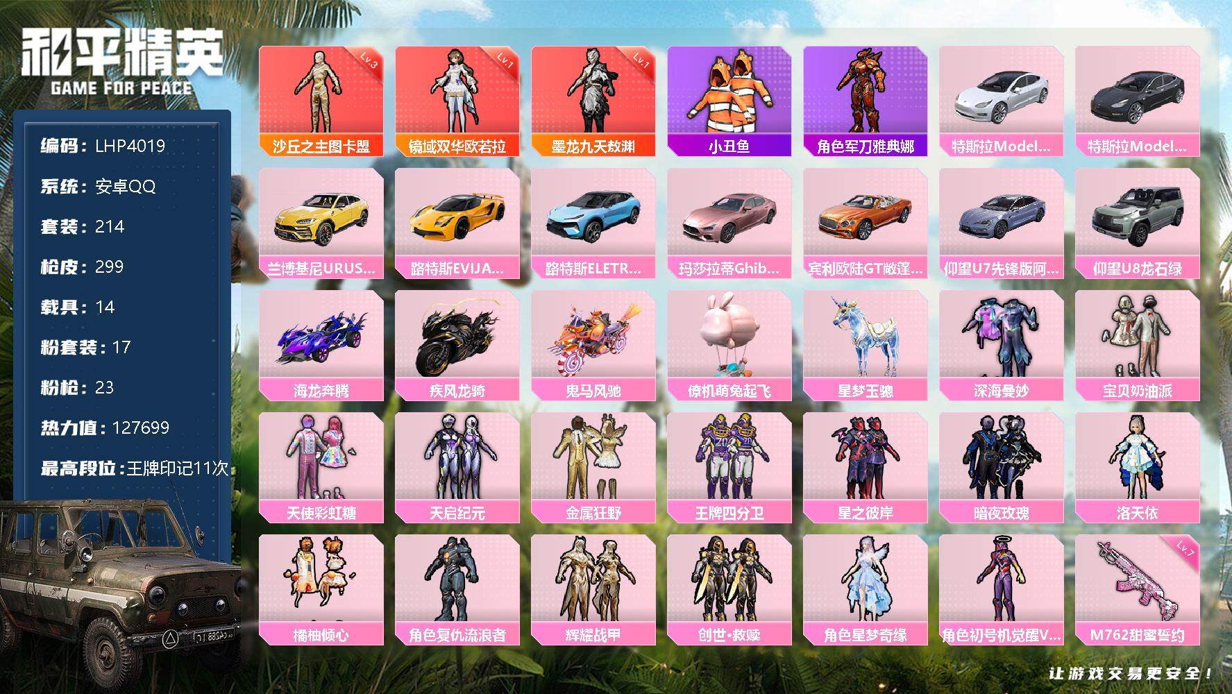 [12152529]绝世印记1【暑期末清货/特价急出/永久包赔】:安卓 手Q-3红装-17粉装-23特效枪-14载具-12.7w热力值-11印记-214套装-299枪皮【热门品类】:套装-小丑鱼,角色-军刀雅典娜【角色神装等级】:墨龙九天-敖渊(一级),镜域双华-欧若拉(一级),沙丘之主-图卡盟(三级)【稀有载具】:特斯拉Model 3(珍珠白),特斯拉Model 3(冷光银),兰博基尼URUS(明艳黄),路特斯EVIJA(星际黄),路特斯ELETRE(冰川蓝),玛莎拉蒂Ghibli(粉),宾利欧陆GT敞篷(火焰橘),仰望U7(阿盖尔紫),仰望U8(龙石绿),海龙奔腾,疾风龙骑,鬼马风驰,僚机-萌兔起飞,星梦玉骢【特效枪等级】:AKM-炫紫旋律(七级),SCAR-L-甜梦小狐(五级),SCAR-L-锦绣绵绵(四级),M416-五爪金龙(三级),M416-心之恋语(五级),M416-电玩时刻(三级),M416-墨龙九天(四级),GROZA-香水柠檬(六级),AUG-星之彼岸(四级),AUG-星梦奇缘(一级),M762-甜蜜誓约(七级),蜜獾-辉耀战甲(一级),Famas-初号机 觉醒Ver.(一级),UMP45-量子极限(五级),Vector-环太平洋(一级),汤姆逊-怪笑疯兔(一级),P90-沙丘之主(三级),Kar98K-伏魔团(四级),Kar98K-巳巳如意(三级),M24-镜域双华(二级),AWM-橘柚倾心(一级)【优质套装】:粉装-深海曼妙,粉装-宝贝奶油派,粉装-天使彩虹糖,粉装-梦幻火箭,粉装-天启纪元,粉装-金属狂野,粉装-王牌四分卫,粉装-星之彼岸,粉装-暗夜玫瑰,角色-洛天依,粉装-橘柚倾心,角色-复仇流浪者,粉装-繁龙极客,粉装-辉耀战甲,套装-创世·救赎,角色-星梦奇缘,角色-初号机 觉醒Ver.【优质飞行器】:梦幻火箭飞行器,炫紫旋律飞行器,星之彼岸飞行器,沙丘之主天马,繁龙极客飞行器,镜域双华-灵镜之阶,辉耀战甲飞行器,龙翔九天飞行器,深渊漩涡飞行器