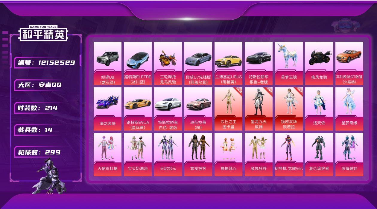 - PX_2101706-安卓QQ 历史总热力值:23293 粉装数量:5 特效枪数量:2 载具数量:2 王牌印记:1 历史最高段位:超级王牌 套装数量:58 时装数量:262 枪械数量:52 战备数量:33 装备数量:84 载具:玛莎拉蒂Ghibli(粉),玛莎拉蒂Ghibli(蓝) 时装:套装-守护骑士,套装-幻影战神,套装-火曜朱雀,套装-金曜白虎,套装-银河战甲,套装-SS10特训,套装-SS
