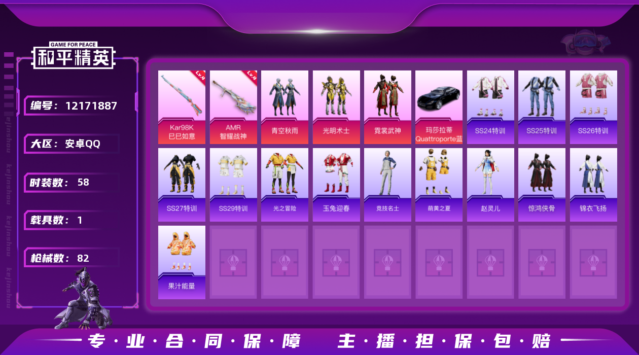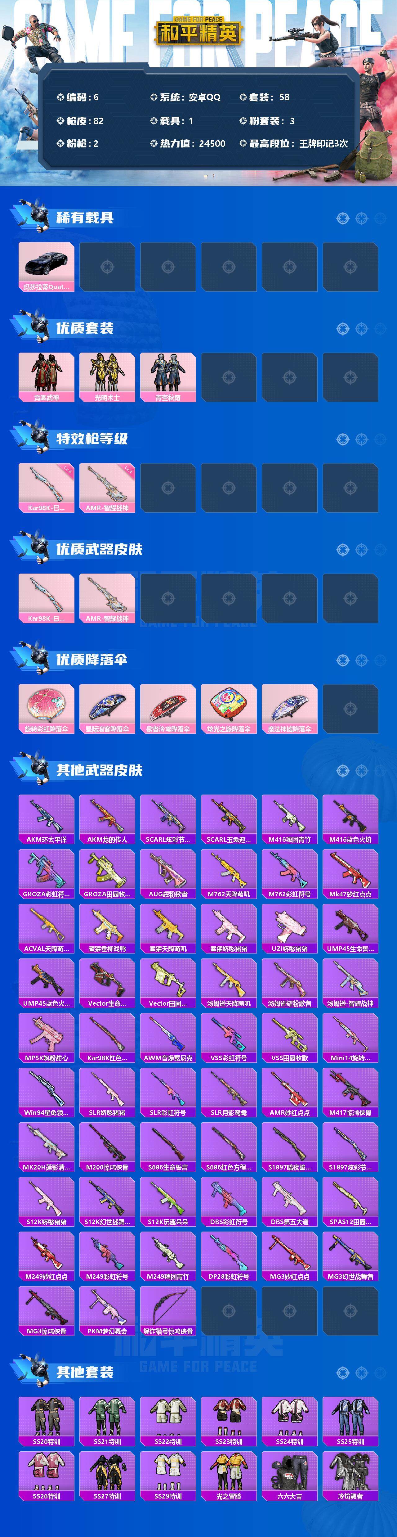 [12171887]MQ603【商品标题】:安卓 手Q-3粉装-2特效枪-1载具-0粉色飞行器-24500热力值-3王牌印记-58套装-82枪皮 【热门品类】:套装-龟仙人 【粉色载具】:玛莎拉蒂Quattroporte(夜幕蓝) 【粉色套装】:粉装-霓裳武神,粉装-光明术士,粉装-青空秋雨 【粉色枪皮等级】:Kar98K-巳巳如意(四级),AMR-智耀战神(四级) 【粉色枪皮】:Kar98K-巳巳如意,AMR-智耀战神 【粉色降落伞】:旋转彩虹降落伞,星际浪客降落伞,歌者泠鸢降落伞,炫光之旅降落伞,魔法神域降落伞 【稀有套装】:套装-龟仙人 【稀有枪皮】:AKM-环太平洋,AKM-龙的传人,SCAR-L-炫彩节奏,SCAR-L-玉兔迎春,M416-糯团青竹,M416-蓝色火焰,GROZA-彩虹符号,GROZA-田园牧歌,AUG-耀粉歌者,M762-天降萌叽,M762-彩虹符号,Mk47-妙红点点,AC-VAL-天降萌叽,蜜獾-垂柳戏鸭,蜜獾-天降萌叽,蜜獾-娇憨猪猪,UZI-娇憨猪猪,UMP45-生命誓言,UMP45-蓝色火焰,Vector-生命誓言,Vector-田园牧歌,汤姆逊-天降萌叽,汤姆逊-耀粉歌者,汤姆逊-智耀战神,MP5K-飒粉甜心,Kar98K-红色方程式,AWM-音爆索尼克,VSS-彩虹符号,VSS-田园牧歌,Mini14-旋转彩虹,Win94-星兔领航员,SLR-娇憨猪猪,SLR-彩虹符号,SLR-月影鸳鸯,AMR-妙红点点,M417-惊鸿侠骨,MK20-H-莲影清波,M200-惊鸿侠骨,S686-生命誓言,S686-红色方程式,S1897-暗夜鎏金,S1897-炫彩节奏,S12K-玩趣呆呆,S12K-娇憨猪猪,S12K-幻世战舞者,DBS-彩虹符号,DBS-第五大道,SPAS-12-田园牧歌,M249-妙红点点,M249-彩虹符号,M249-糯团青竹,DP-28-彩虹符号,MG3-妙红点点,MG3-幻世战舞者,MG3-惊鸿侠骨,PKM-梦幻舞会,爆炸猎弓-惊鸿侠骨 【其他套装】:套装-SS20特训,套装-SS21特训,套装-SS22特训,套装-SS23特训,套装-SS24特训,套装-SS25特训,套装-SS26特训,套装-SS27特训,套装-SS29特训,套装-光之冒险,套装-六六大吉,套装-冷焰舞者,套装-幻世战舞者,套装-幻影武者,套装-灼焰舞者,套装-牛