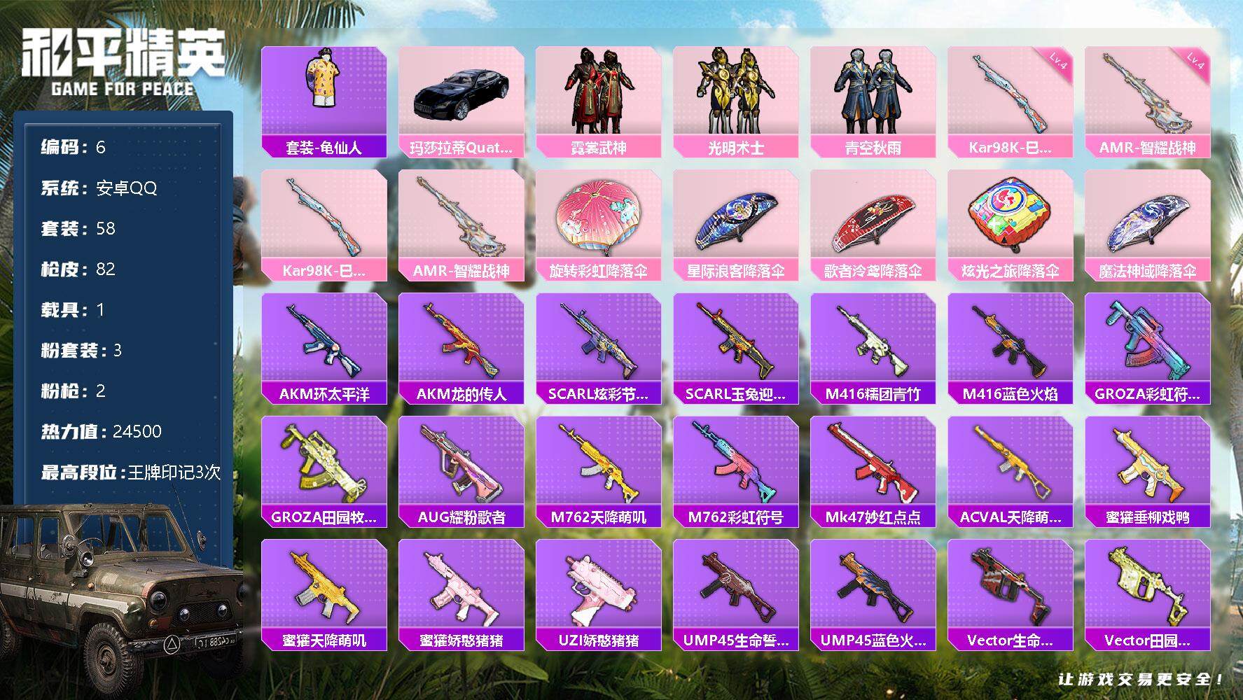 [12171887]MQ603【商品标题】:安卓 手Q-3粉装-2特效枪-1载具-0粉色飞行器-24500热力值-3王牌印记-58套装-82枪皮