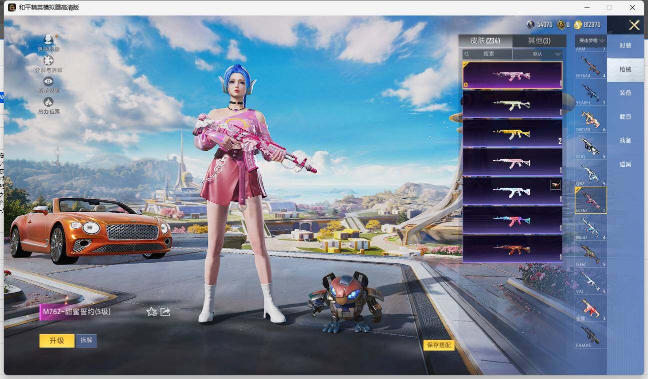 AKM-梦之光华,M416-风花雪月,GROZA-焦糖拿铁,M762-甜蜜誓约,UMP45-相思残雪,SLR-暗夜玫瑰,MG3-洛神天依,平底锅-林间仙鹿
