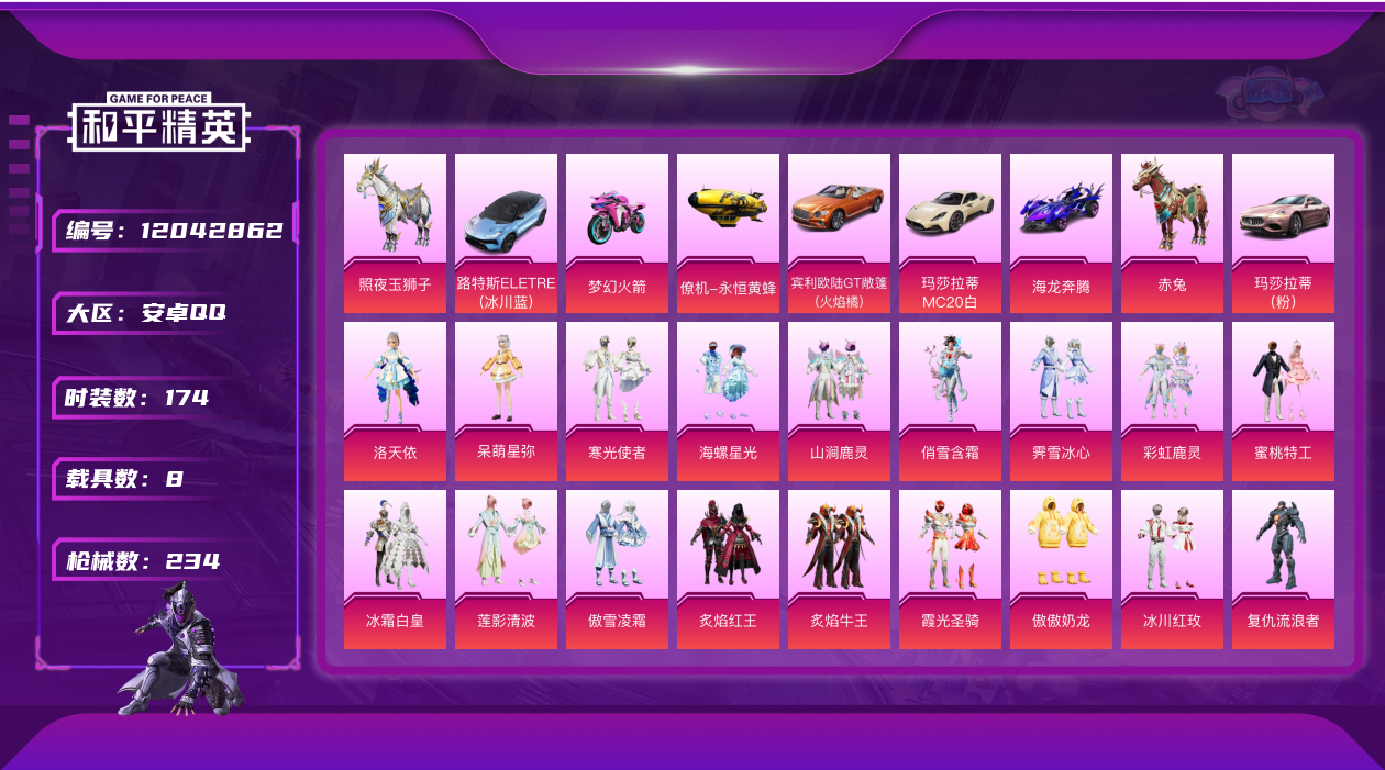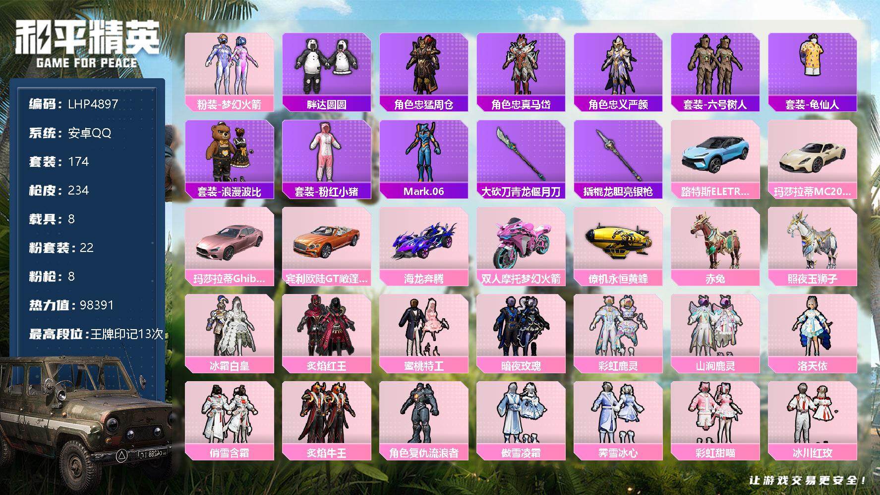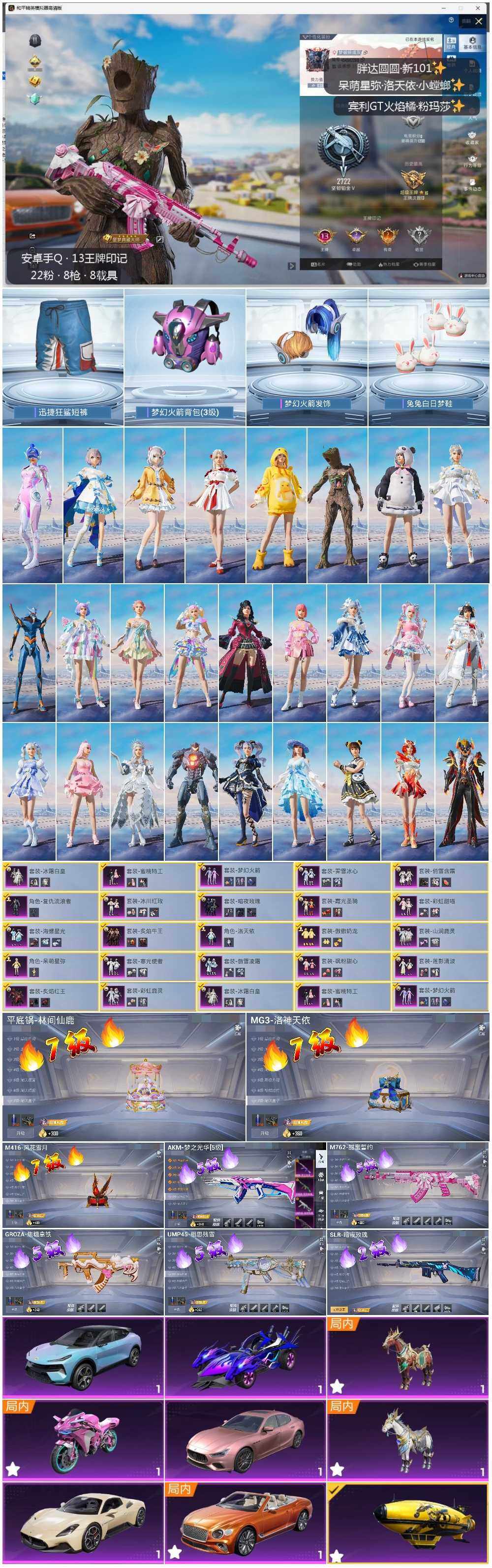 [12042862]素材身法号【特价急出/详情看图】:安卓 手Q-22粉装-8特效枪-8载具-11粉色飞行器-9.8w热力值-13王牌印记-174套装-234枪皮【热门品类】:粉装-梦幻火箭,套装-胖达圆圆,角色-忠猛周仓,角色-忠真马岱,角色-忠义严颜,套装-六号树人,套装-龟仙人,套装-浪漫波比,套装-粉红小猪,角色-Mark.06,大砍刀-青龙偃月刀,撬棍-龙胆亮银枪【粉色载具】:路特斯ELETRE(冰川蓝),玛莎拉蒂MC20(星石白),玛莎拉蒂Ghibli(粉),宾利欧陆GT敞篷(火焰橘),海龙奔腾,双人摩托-梦幻火箭,僚机-永恒黄蜂,赤兔,照夜玉狮子【粉色套装】:粉装-梦幻火箭,粉装-冰霜白皇,粉装-炙焰红王,粉装-蜜桃特工,粉装-暗夜玫瑰,粉装-彩虹鹿灵,粉装-山涧鹿灵,角色-洛天依,粉装-俏雪含霜,粉装-炙焰牛王,角色-复仇流浪者,粉装-傲雪凌霜,粉装-霁雪冰心,粉装-彩虹甜喵,粉装-冰川红玫,粉装-霞光圣骑,粉装-寒光使者,粉装-海螺星光,粉装-飒粉甜心,角色-呆萌星弥,粉装-莲影清波,粉装-傲傲奶龙【粉色枪皮等级】:AKM-梦之光华(五级),M416-风花雪月(七级),GROZA-焦糖拿铁(五级),M762-甜蜜誓约(五级),UMP45-相思残雪(五级),SLR-暗夜玫瑰(二级),MG3-洛神天依(七级),平底锅-林间仙鹿(七级)【粉色飞行器】:梦幻火箭飞行器,风花雪月飞行器,星夜魔法师飞行翼,太空嘟嘟飞行器,千面幻镜飞行器,梦幻舞会飞行器,黄族统领飞行器,粉樱探戈飞行器,镜光幻境飞行翼,镜域双华-灵镜之阶,绝色倾城飞行器