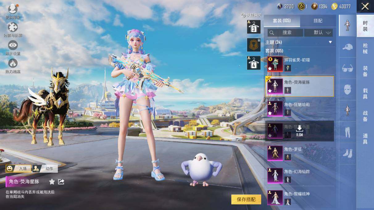 【粉色套装】:角色-智耀战神,角色-幻海仙踪,角色-狂魅哈莉,角色-狂魇小丑,角色-罗征,角色-荧海星豚