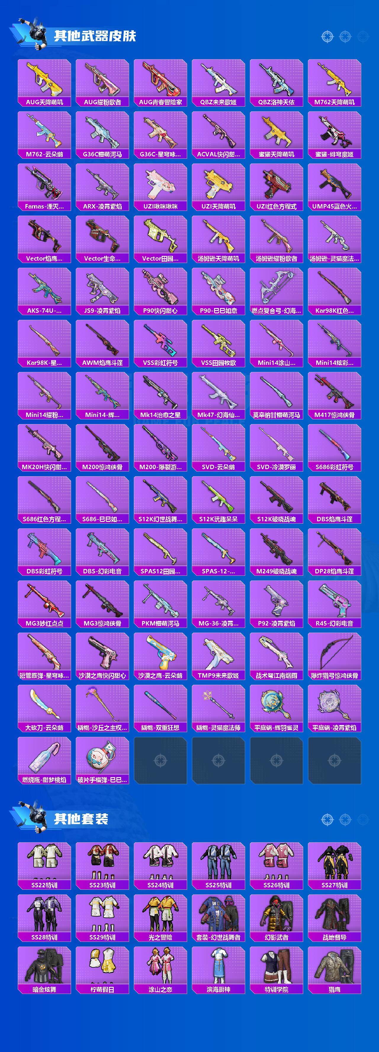 [12158200]【商品标题】:安卓 手Q-1神装-6粉装-7特效枪-2载具-2粉色飞行器-48995热力值-3王牌印记-105套装-171枪皮 【红色神装等级】:辉羽雀灵-初翊(二级) 【红色角色神装】:辉羽雀灵-初翊 【热门品类】:套装-龟仙人 【粉色载具】:黑曜夜骑,辉羽雀灵自行车 【粉色套装】:角色-智耀战神,角色-幻海仙踪,角色-狂魅哈莉,角色-狂魇小丑,角色-罗征,角色-荧海星豚 【粉色枪皮等级】:M416-灵猫魔法师(三级),Kar98K-巳巳如意(五级),Mk14-甜梦熊击(五级),Mk14-爆裂游戏(七级),DP-28-豹影疾电(五级),MG3-辉羽雀灵(三级),MG-36-幻彩电音(一级) 【粉色枪皮】:M416-灵猫魔法师,Kar98K-巳巳如意,Mk14-甜梦熊击,Mk14-爆裂游戏,DP-28-豹影疾电,MG3-辉羽雀灵,MG-36-幻彩电音 【粉色飞行器】:雀灵庇佑飞行器,灵猫魔法师飞行器 【粉色降落伞】:金丰海韵降落伞,千金淑猫降落伞,幻海仙踪降落伞,星穹咏叹调降落伞,辉羽雀灵降落伞,双重狂想降落伞,灵猫魔法师降落伞,喜羊羊与灰太狼降落伞 【稀有套装】:套装-龟仙人,套装-巳巳如意,套装-糖糖葫芦,套装-青团波波,角色-都市丽猫,套装-燕燕于飞,套装-鱼渊荷华,角色-糖霜甜心,套装-粉恋花,套装-紫幽梦,套装-蓝冰羽,角色-幽澜祭司,角色-鲛海歌灵,套装-星影赞美诗,套装-彩虹兔,套装-云朵鹅,套装-雪绒豹,套装-诡诞巡游,套装-混沌火种,套装-蓝海鲸歌,套装-朱霞炽焰,套装-凌霄紫焰,套装-擎苍青焰,玩偶服-美羊羊,玩偶服-喜羊羊 【稀有枪皮】:AKM-彩虹符号,AKM-恐龙拽拽,AKM-破晓战魂,AKM-龙的传人,M16A4-红色方程式,SCAR-L-炫彩节奏,SCAR-L-红色方程式,M416-糯团青竹,M416-红色方程式,M416-蓝色火焰,GROZA-懵萌河马,GROZA-田园牧歌,AUG-天降萌叽,AUG-耀粉歌者,AUG-青春冒险家,QBZ-未来歌姬,QBZ-洛神天依,M762-天降萌叽,M762-云朵鹅,G36C-懵萌河马,G36C-星穹咏叹调,AC-VAL-快闪甜心,蜜獾-天降萌叽,蜜獾-绯穹魔姬,Famas-湮灭星辰,ARX-凌霄紫焰,UZI-啾咪啾咪,UZI-天降萌叽,UZI-红色方程式,UMP45-蓝色火焰,Vector-焰鹰