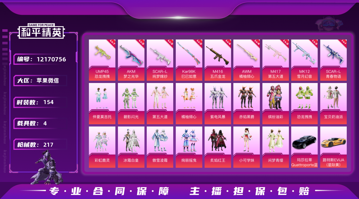 [12170756]【商品标题】:苹果 微信-1神装-20粉装-12特效枪-4载具-5粉色飞行器-89902热力值-9王牌印记-154套装-217枪皮 王者 v7-187皮2珍品14传说