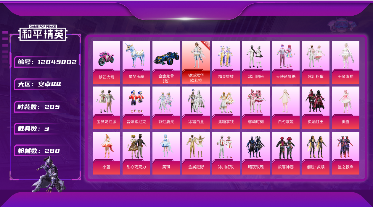[12045002]素材身法号/无敌战神框1/绝世印记4/地铁满天赋【特价急出/详情看图】:安卓 手Q-无敌战神框-1神装-27粉装-12特效枪-3载具-9粉色飞行器-11.2w热力值-19王牌印记-205套装-280枪皮【红色神装等级】:镜域双华-欧若拉(三级)【热门品类】:粉装-梦幻火箭,粉装-童趣迷兔,粉装-音爆索尼克,套装-浪漫天命,套装-都市猎人,套装-龟仙人,套装-暗影哥特【粉色载具】:合金龙骨(蓝),双人摩托-梦幻火箭,星梦玉骢【粉色套装】:粉装-甜心巧克力,粉装-宝贝奶油派,粉装-天使彩虹糖,粉装-梦幻火箭,粉装-金属狂野,粉装-放客神游,粉装-花间之火,粉装-冰霜白皇,粉装-童趣迷兔,粉装-炙焰红王,粉装-星之彼岸,粉装-馨动时刻,粉装-暗夜玫瑰,粉装-彩虹鹿灵,粉装-精灵娃娃,粉装-焦糖拿铁,粉装-冰川粉黛,粉装-冰川幽秘,粉装-冰川红玫,粉装-音爆索尼克,角色-白勺歌姬,角色-小蓝,角色-美雪,角色-美琪,套装-创世·救赎,角色-千金淑猫,角色-绯穹魔姬【粉色枪皮等级】:AKM-星际浪客(六级),SCAR-L-童趣迷兔(六级),M416-心之恋语(七级),GROZA-巴啦啦小魔仙(七级),AUG-暖羊咩咩(四级),M762-甜心娃娃(七级),UMP45-相思残雪(七级),Kar98K-巳巳如意(五级),M24-镜域双华(二级),平底锅-仲夏莫吉托(五级)【粉色飞行器】:暗翼战神飞行器,绮梦青鸾飞行器,闪光银龙飞行器,沙丘之主天马,镜域双华-灵镜之阶,龙翔九天飞行器,鸢尾晶梦飞行器,幻海精灵飞行器